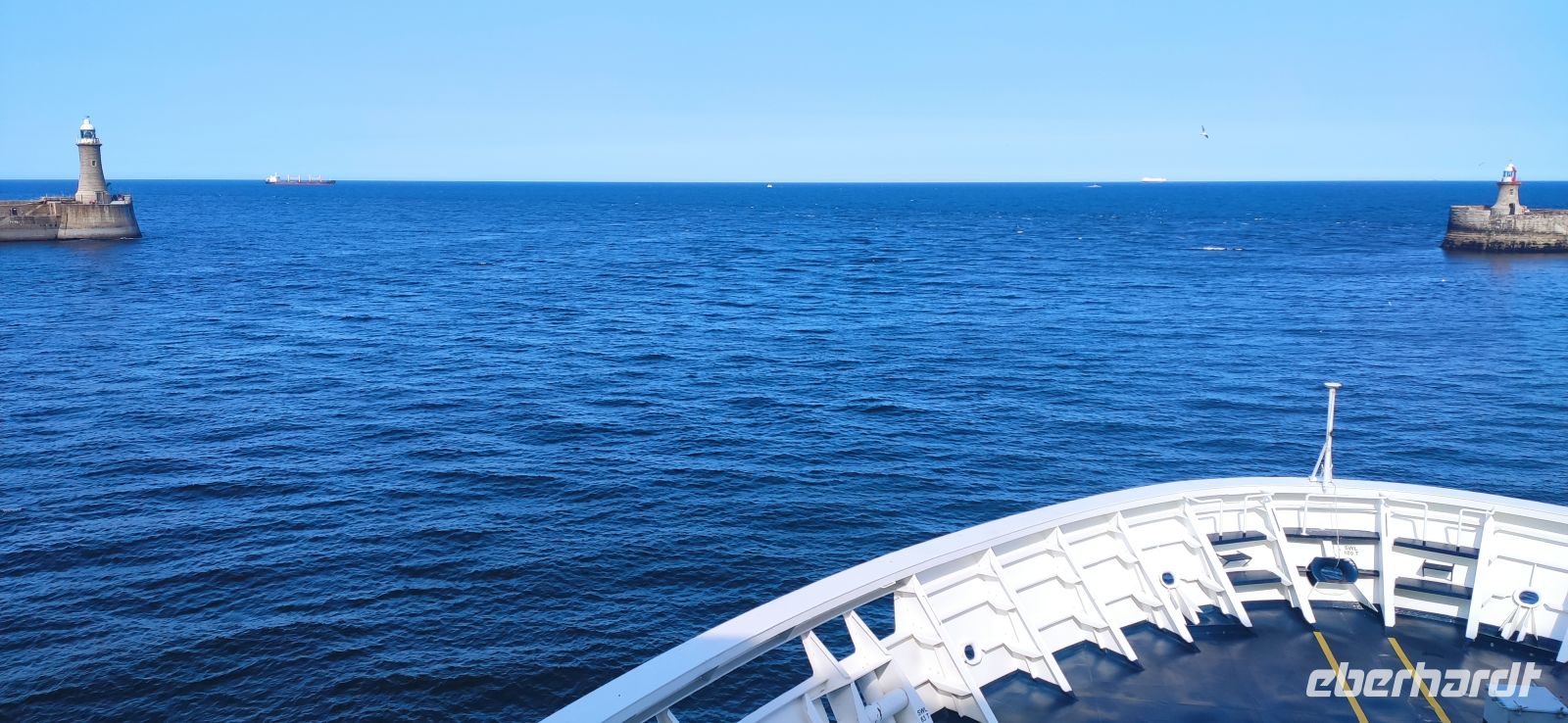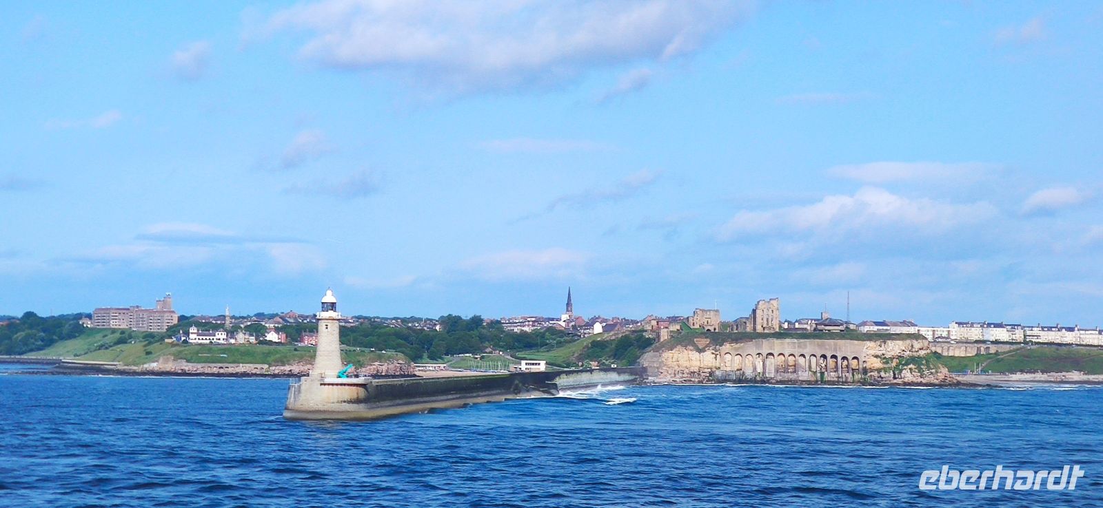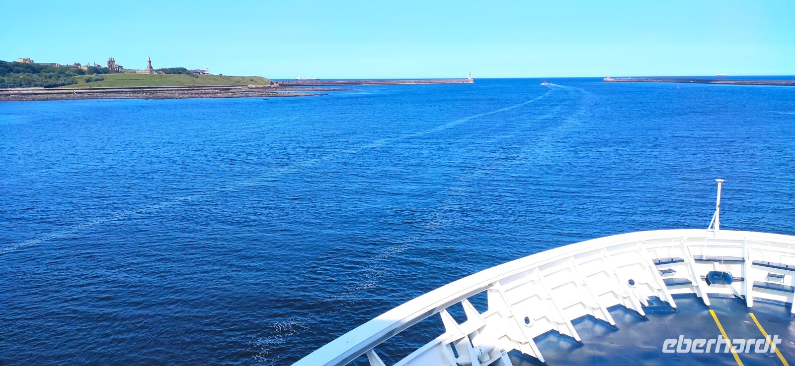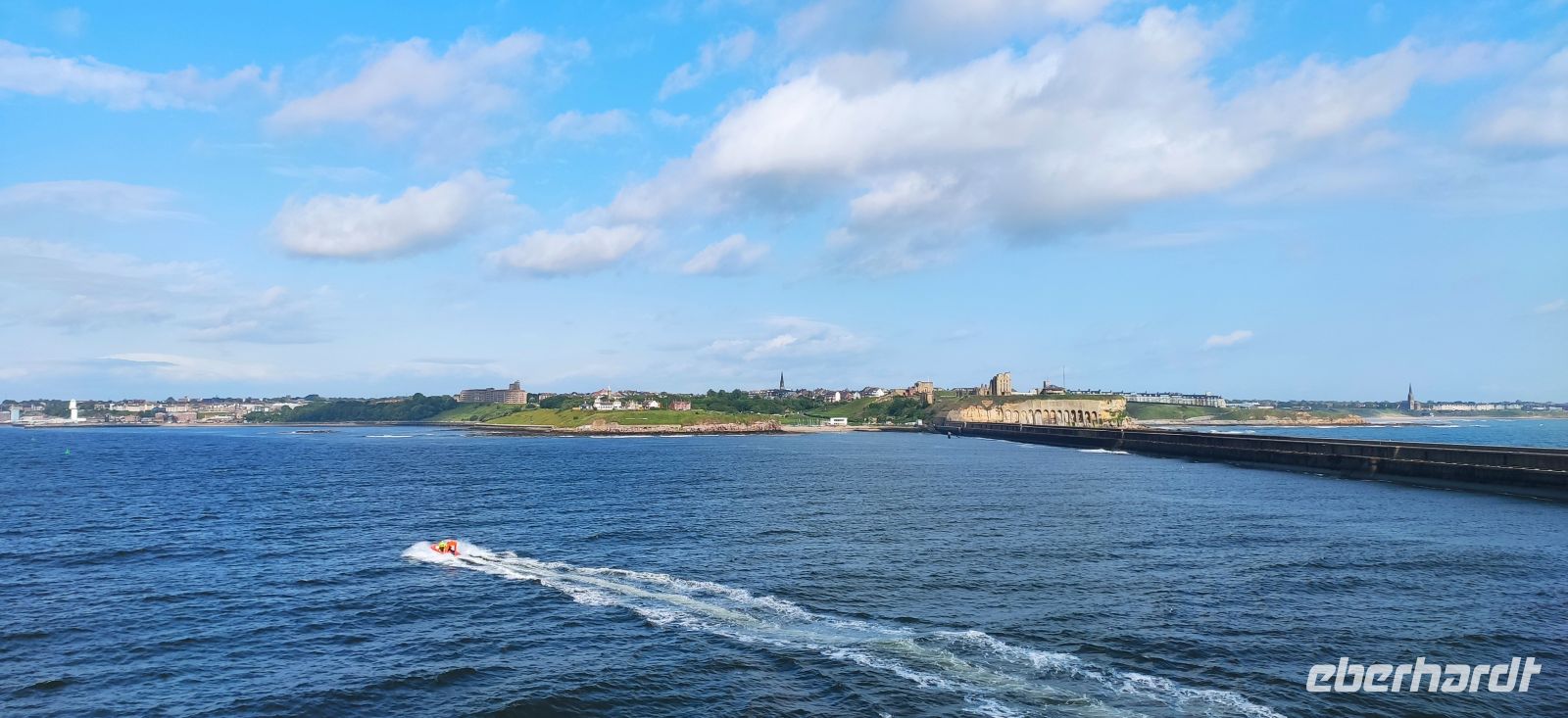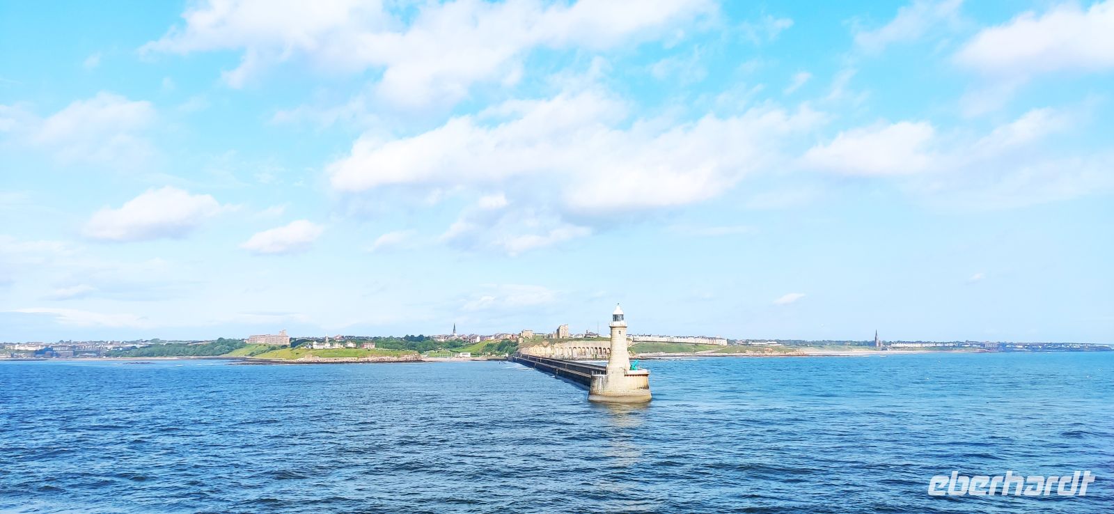 Das Frühstücksbuffet war perfekt und hat geschmeckt. Frisch gestärkt genießen wir die Einfahrt in den River Tyne bei Tynemouth, östlich von Newcastle. Tatsächlich begleiten hier Delphine ein Stück unseren Weg.