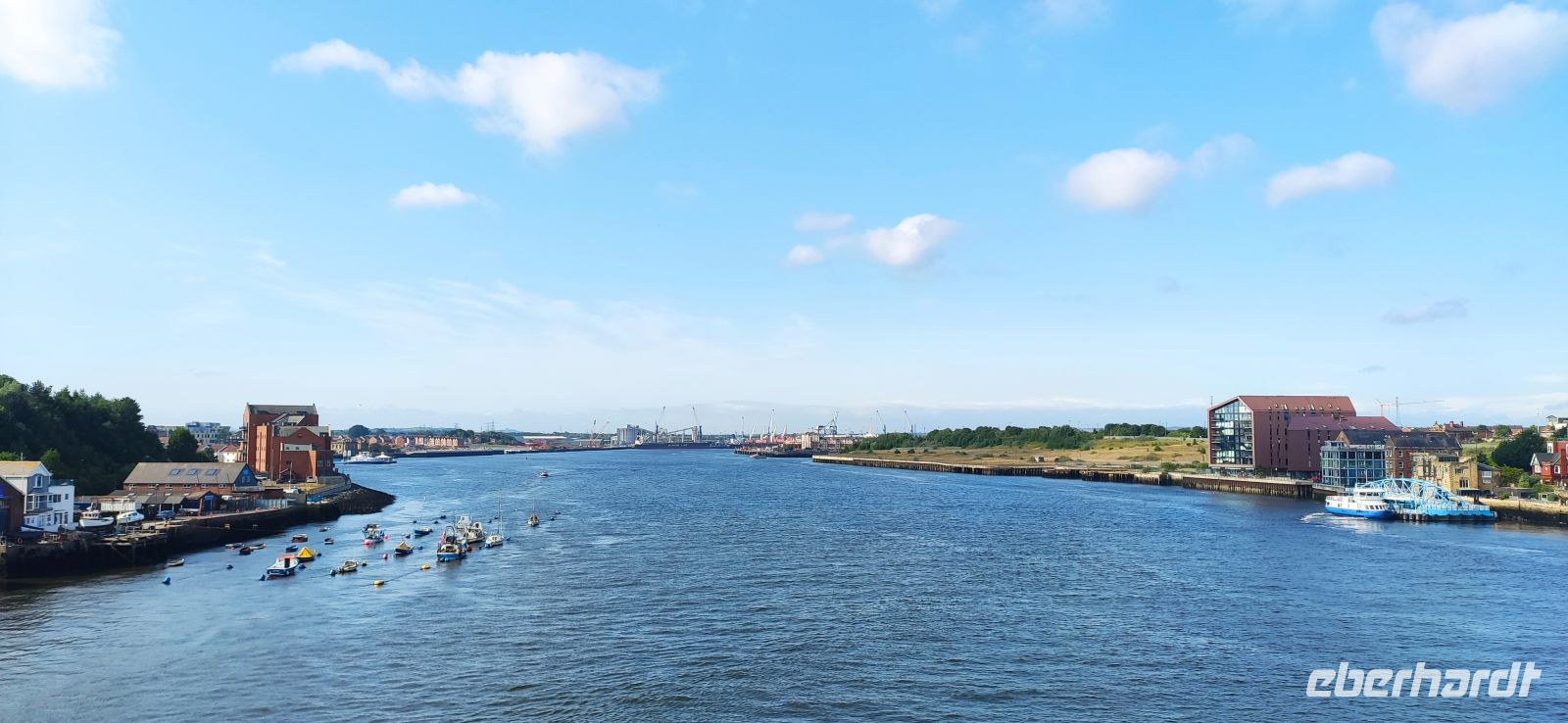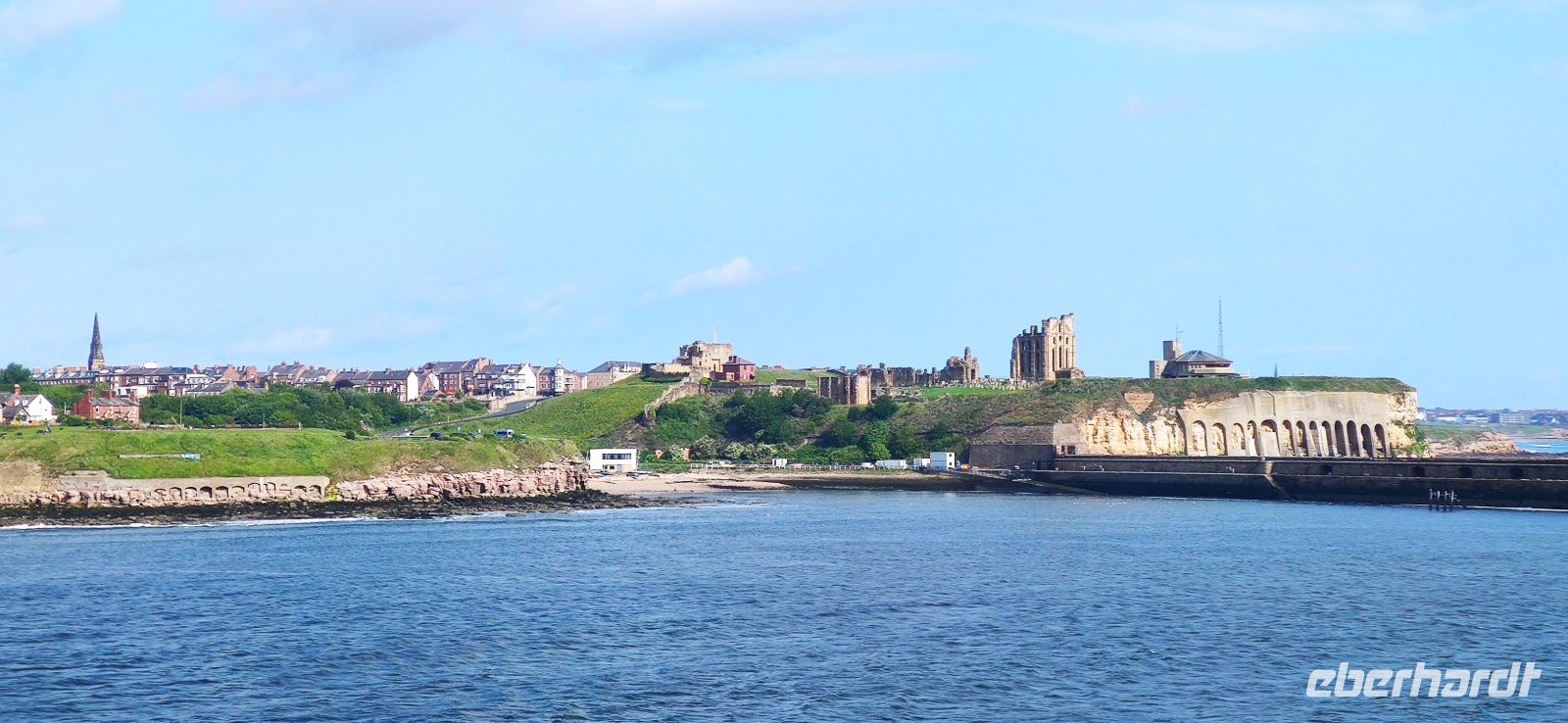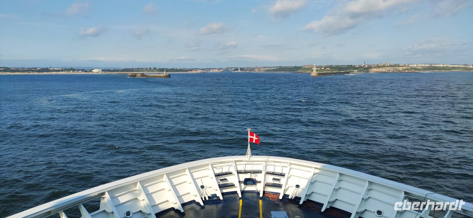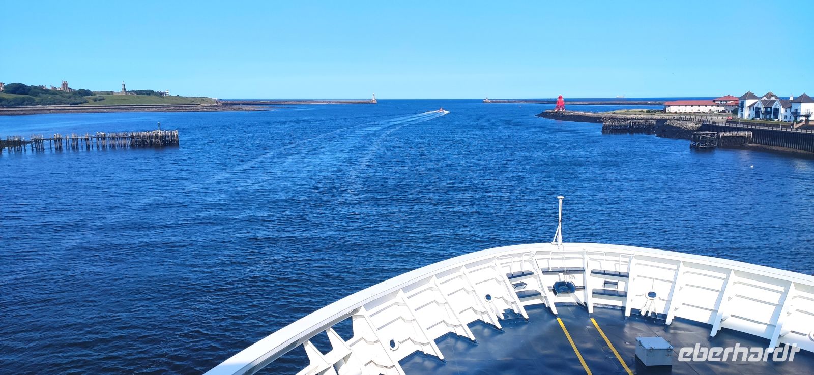 Das Frühstücksbuffet war perfekt und hat geschmeckt. Frisch gestärkt genießen wir die Einfahrt in den River Tyne bei Tynemouth, östlich von Newcastle. Tatsächlich begleiten hier Delphine ein Stück unseren Weg.