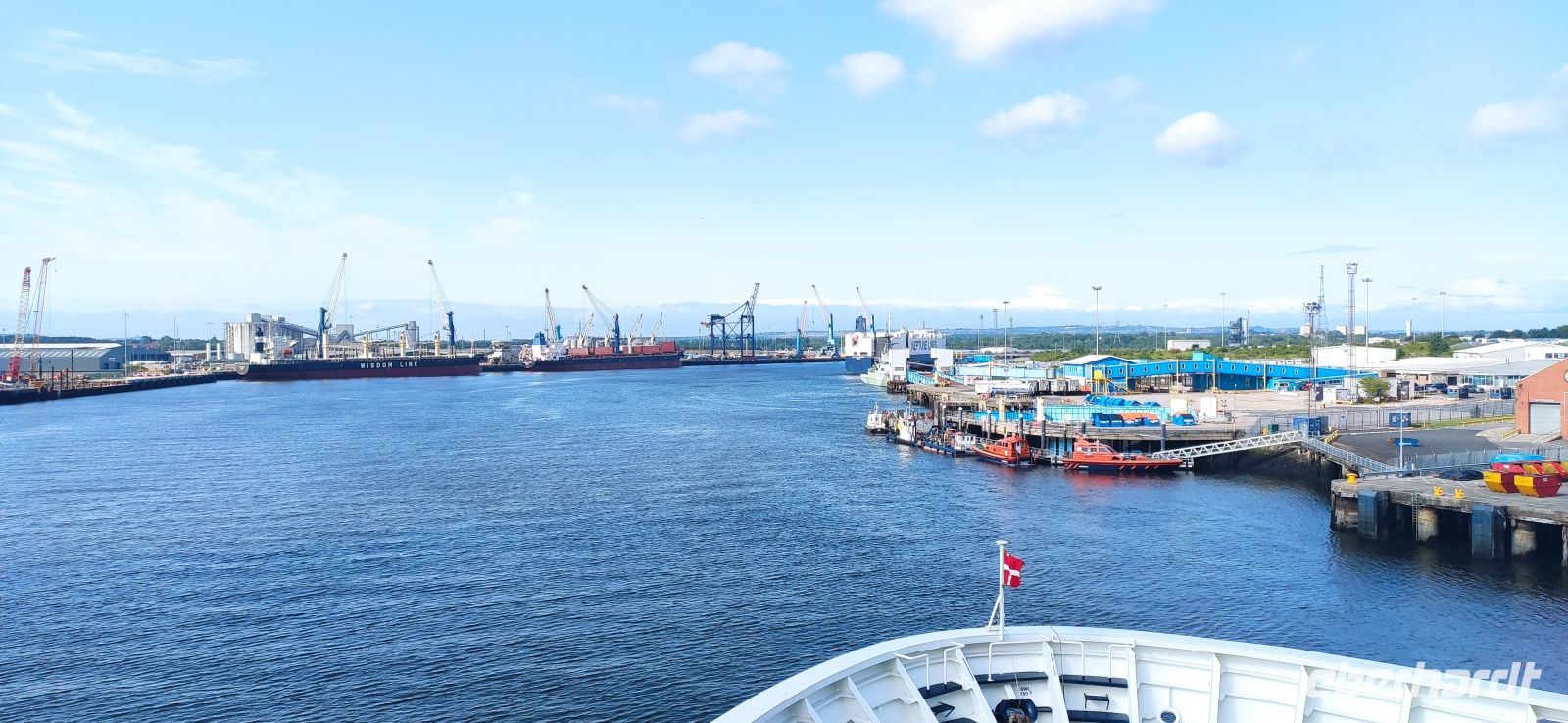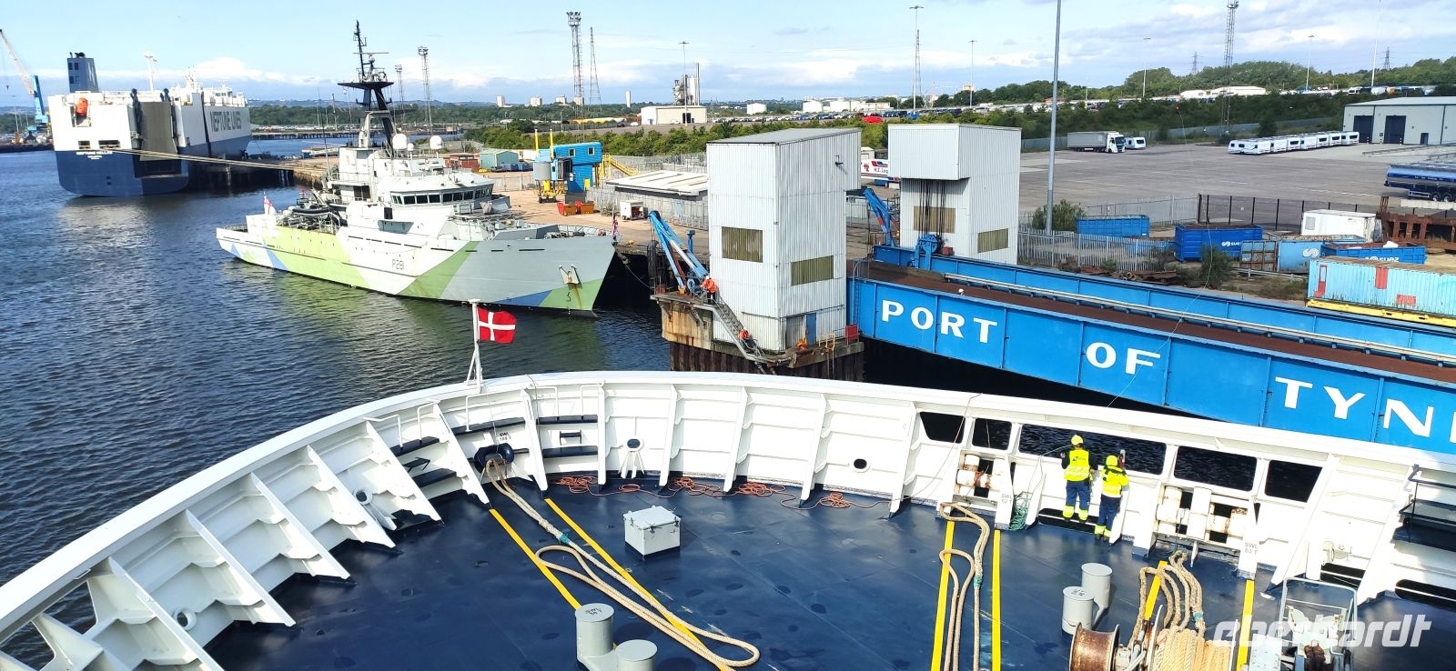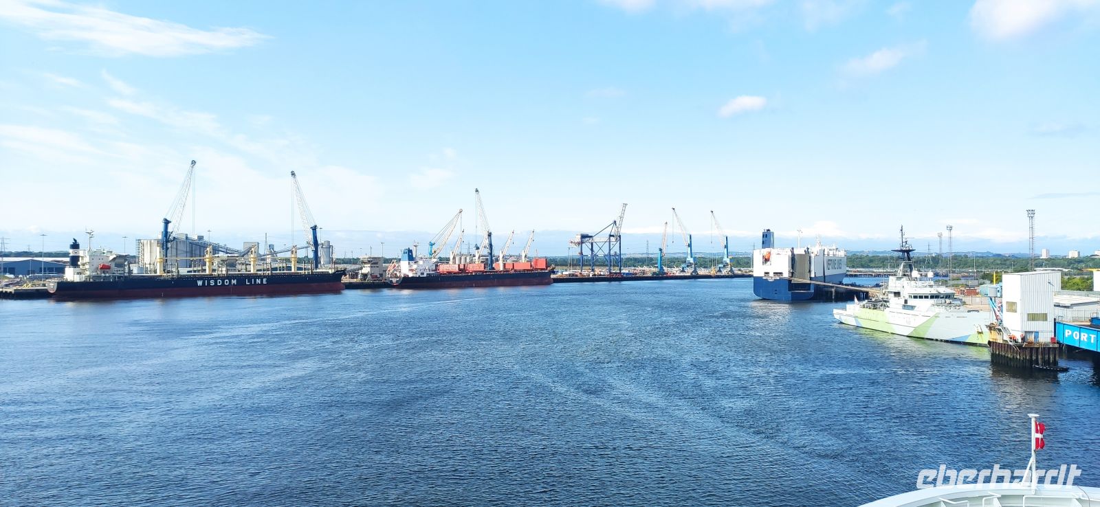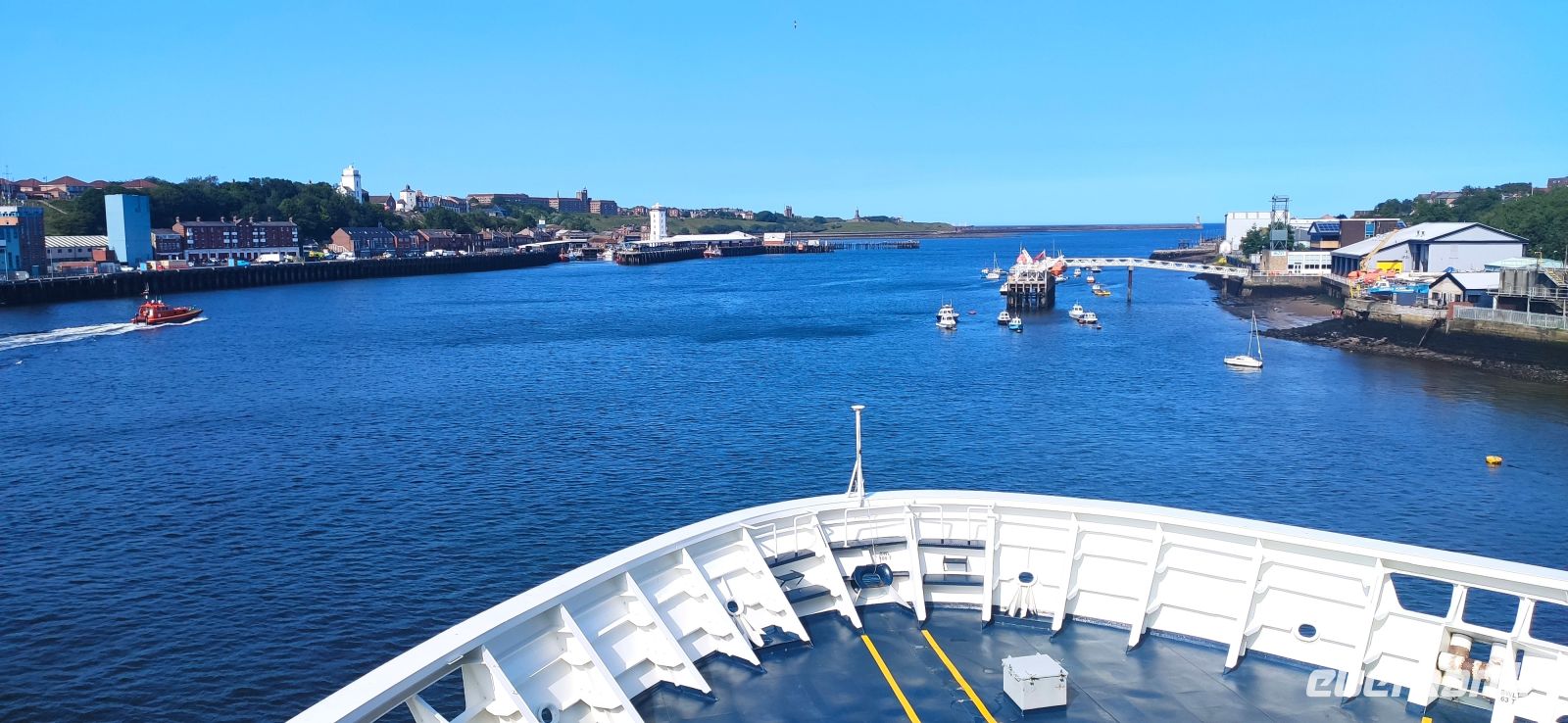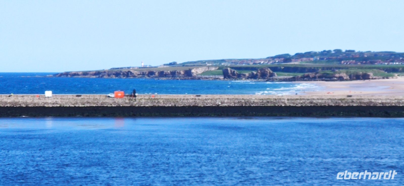 Das Frühstücksbuffet war perfekt und hat geschmeckt. Frisch gestärkt genießen wir die Einfahrt in den River Tyne bei Tynemouth, östlich von Newcastle. Tatsächlich begleiten hier Delphine ein Stück unseren Weg.