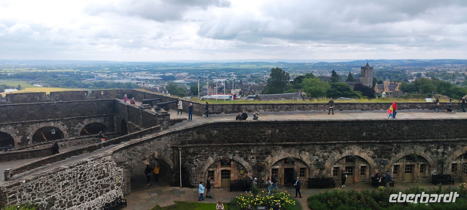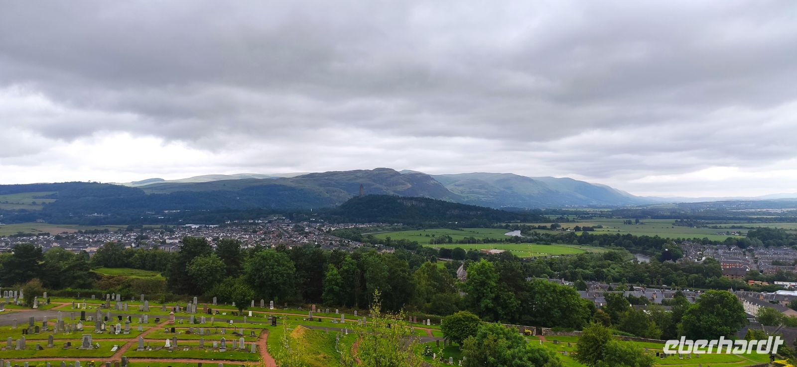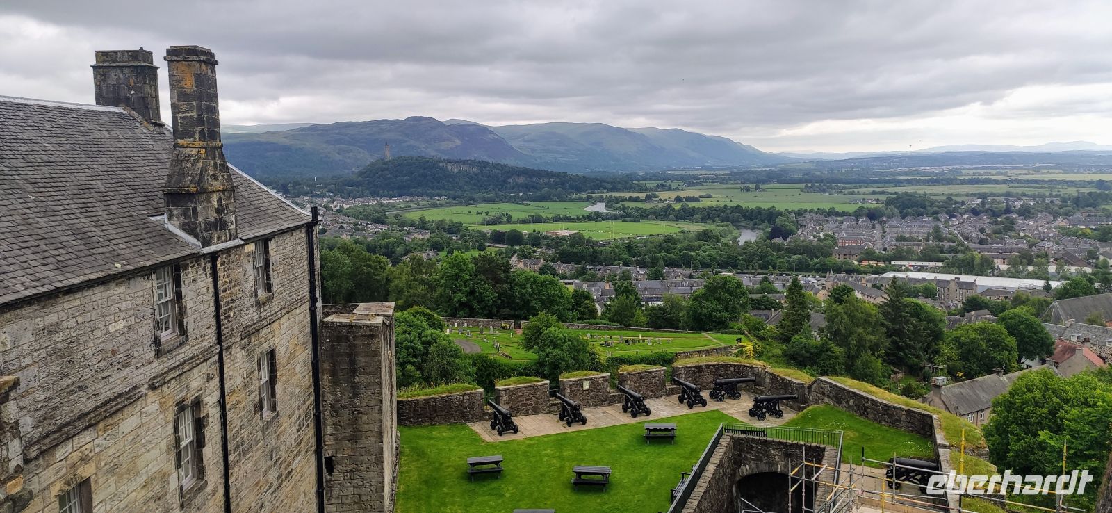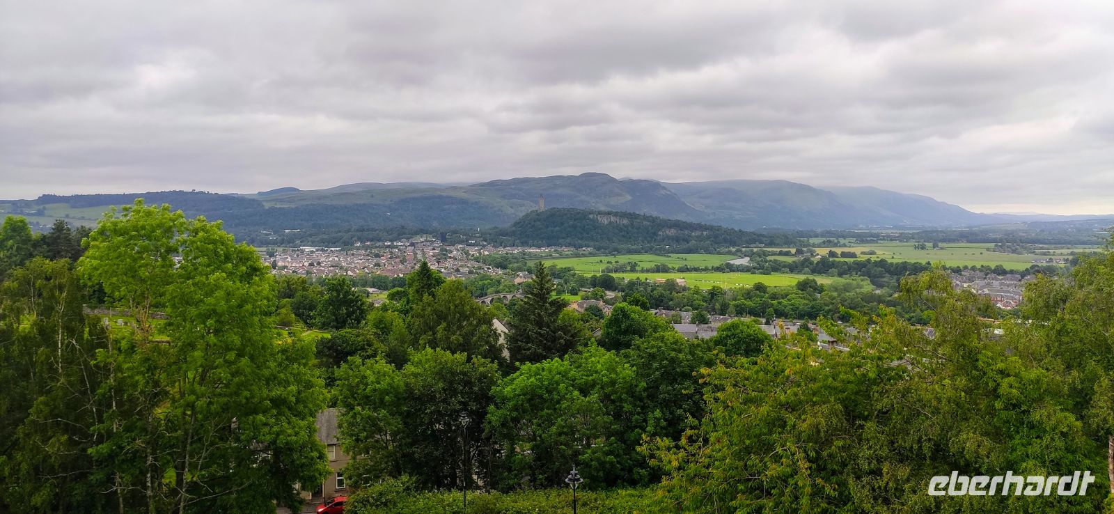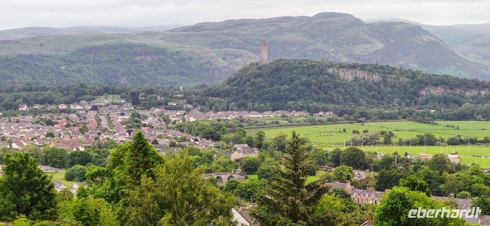 Nach der Ankunft auf der Esplanade, die auf einem 70 Meter hohen Basaltfelsen über der Stadt und neben dem Castle gelegen ist, lassen wir unseren Blick in die Umgebung rings herum schweifen. Vom Vulkanfelsen sehen wir die im Norden ansteigenden Berge, das William Wallace Denkmal auf dem Felsen gegenüber und die Wasserfläche des Firth of Forth im Osten sowie die alte Stirling Bridge am Fluss Forth unter uns.