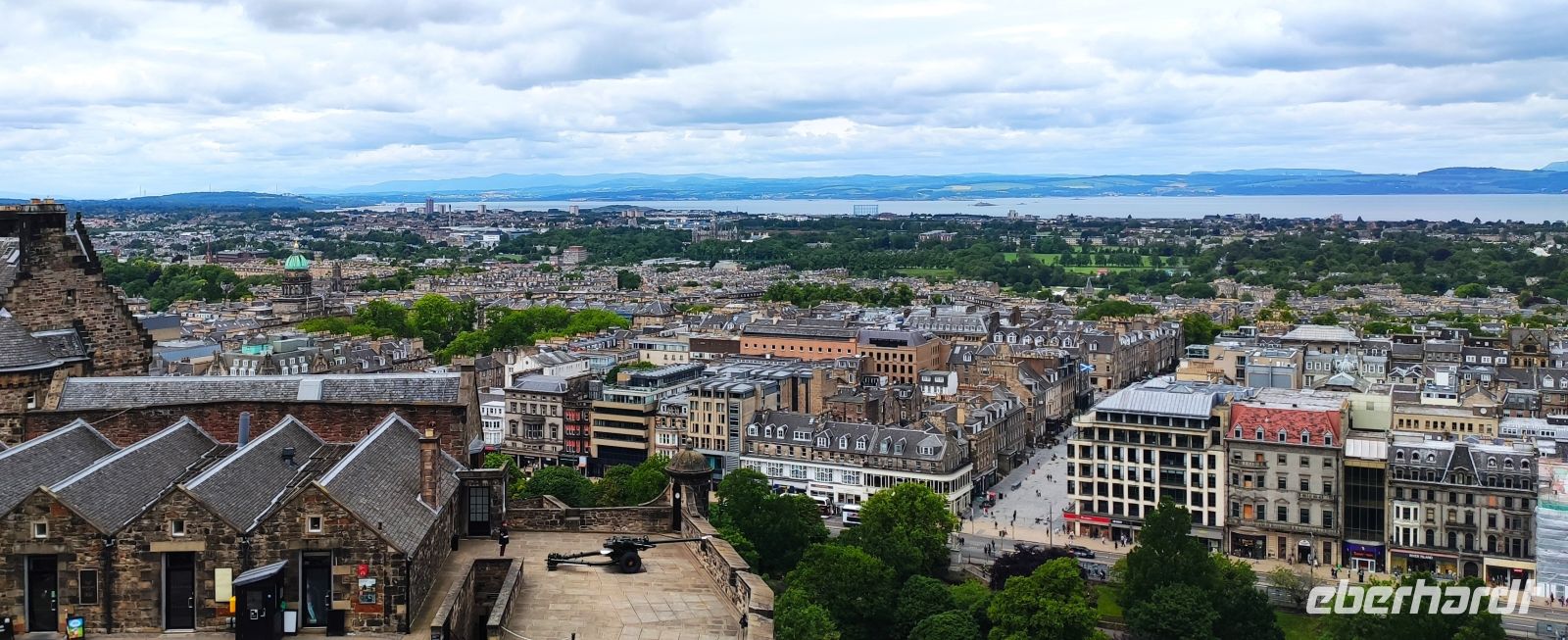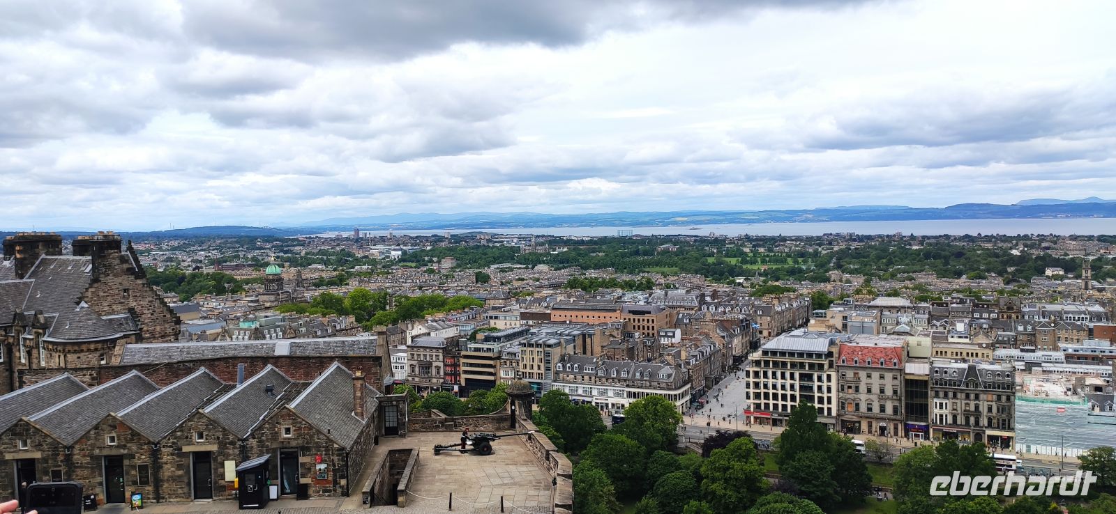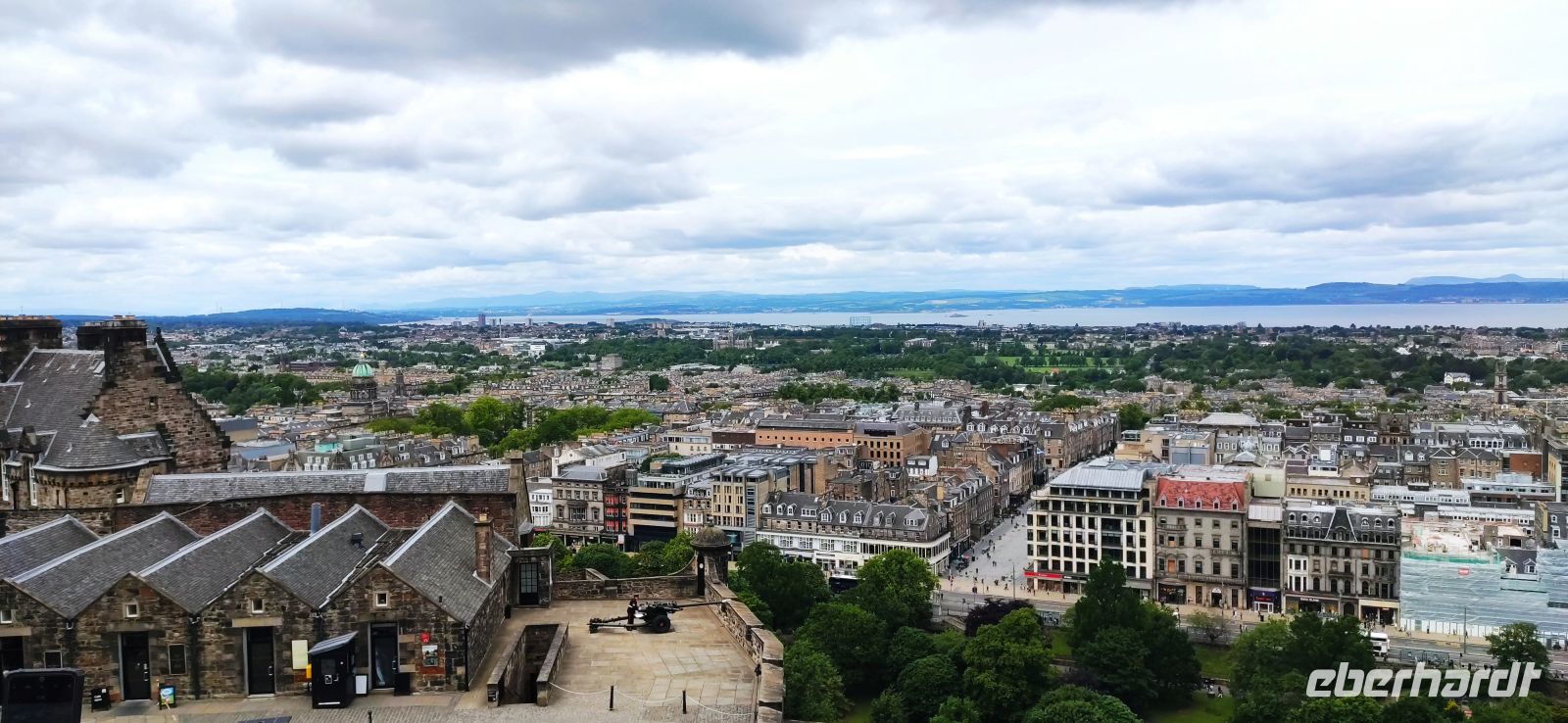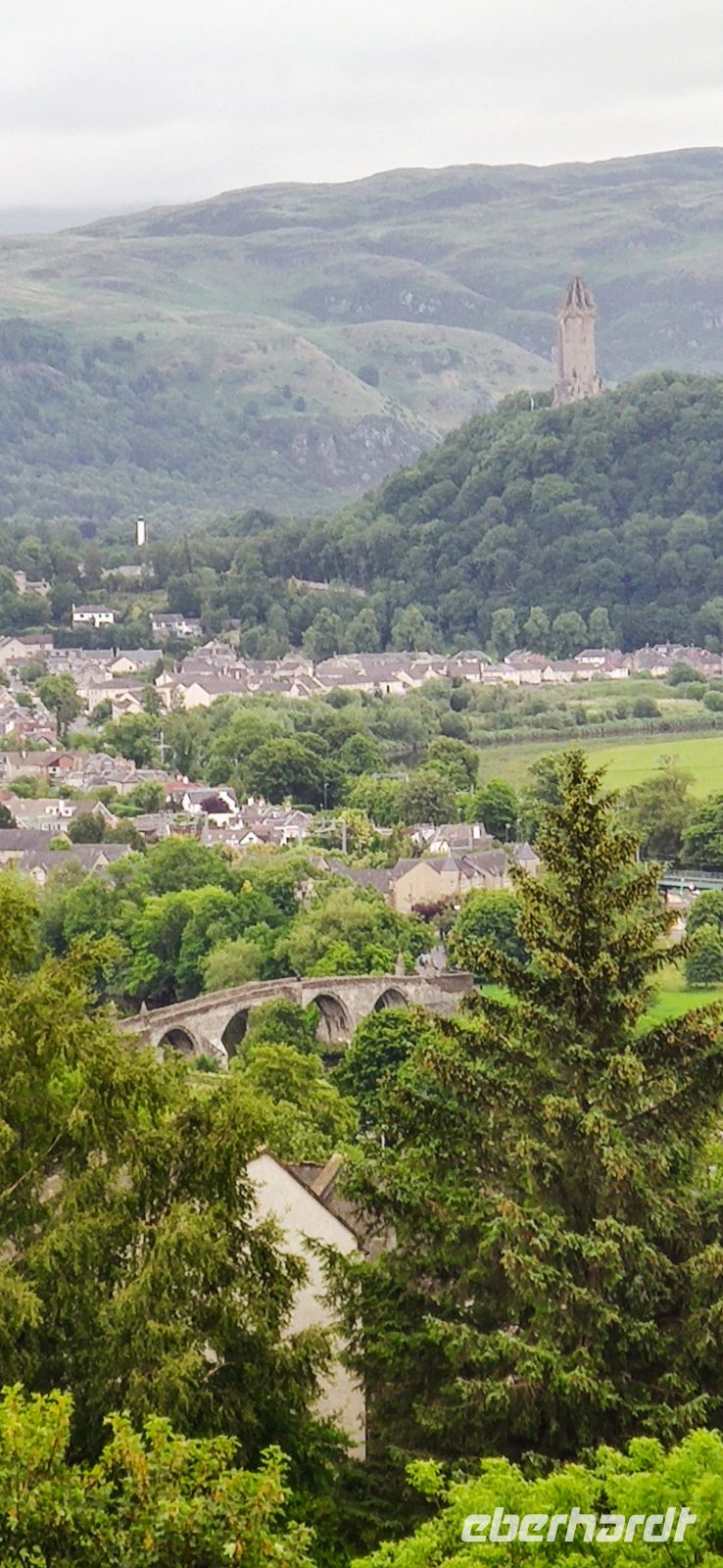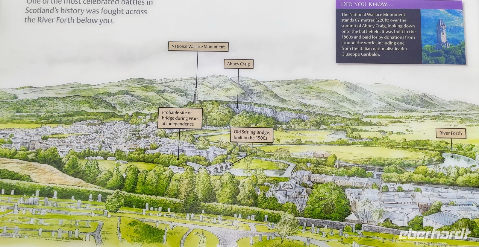 Nach der Ankunft auf der Esplanade, die auf einem 70 Meter hohen Basaltfelsen über der Stadt und neben dem Castle gelegen ist, lassen wir unseren Blick in die Umgebung rings herum schweifen. Vom Vulkanfelsen sehen wir die im Norden ansteigenden Berge, das William Wallace Denkmal auf dem Felsen gegenüber und die Wasserfläche des Firth of Forth im Osten sowie die alte Stirling Bridge am Fluss Forth unter uns.