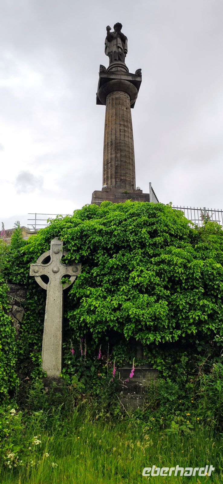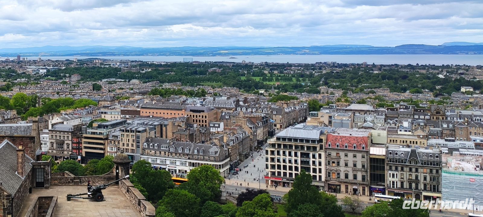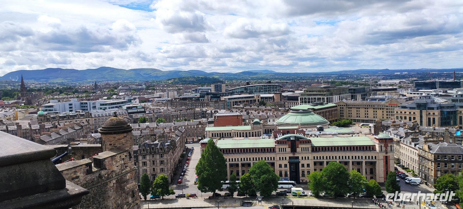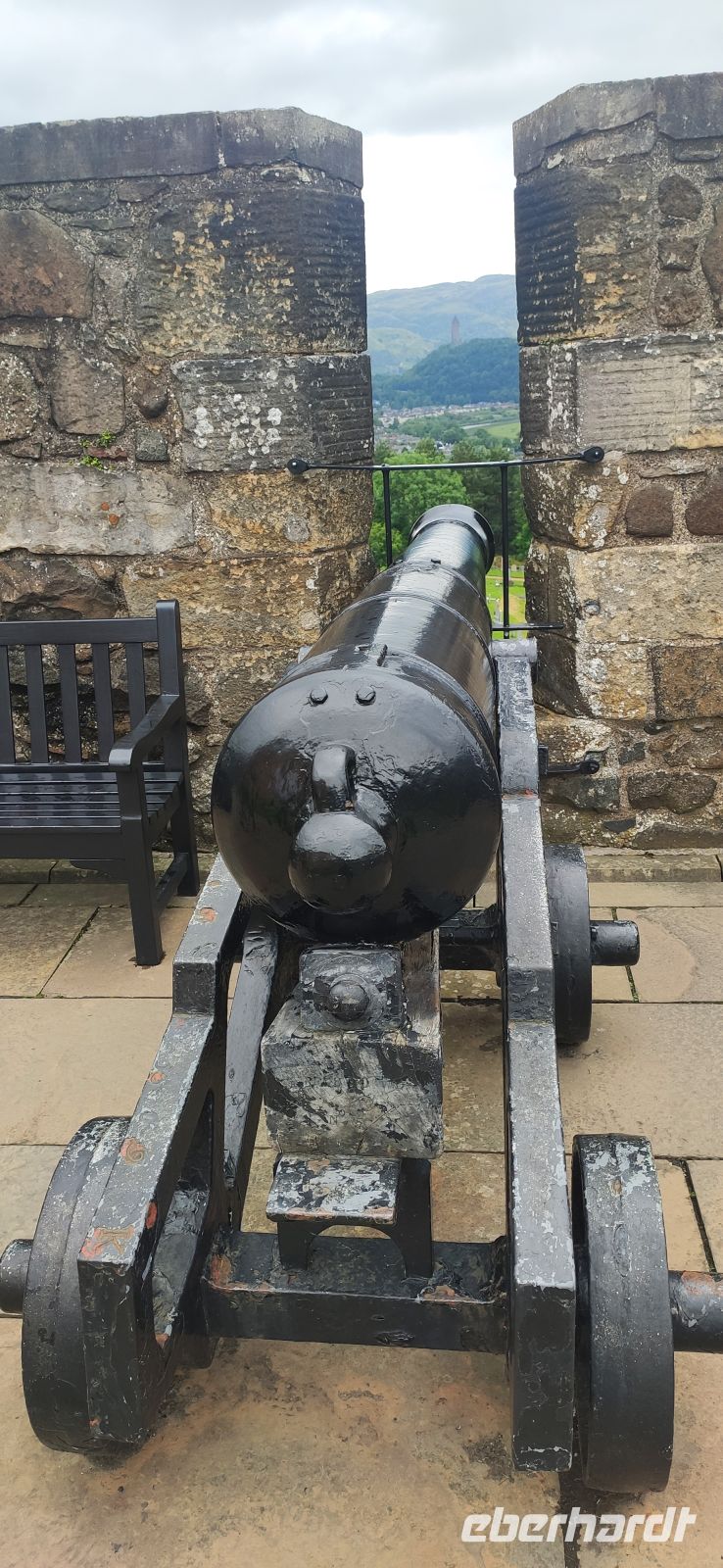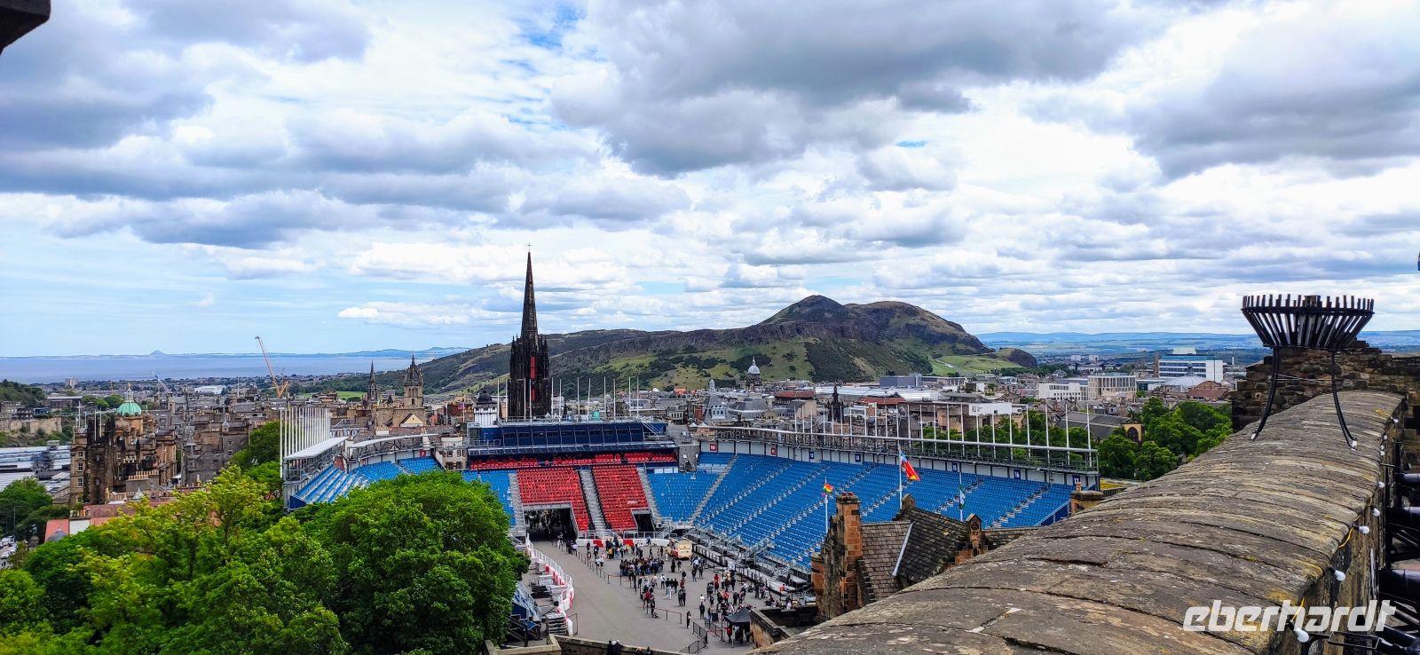 Nach der Ankunft auf der Esplanade, die auf einem 70 Meter hohen Basaltfelsen über der Stadt und neben dem Castle gelegen ist, lassen wir unseren Blick in die Umgebung rings herum schweifen. Vom Vulkanfelsen sehen wir die im Norden ansteigenden Berge, das William Wallace Denkmal auf dem Felsen gegenüber und die Wasserfläche des Firth of Forth im Osten sowie die alte Stirling Bridge am Fluss Forth unter uns.
