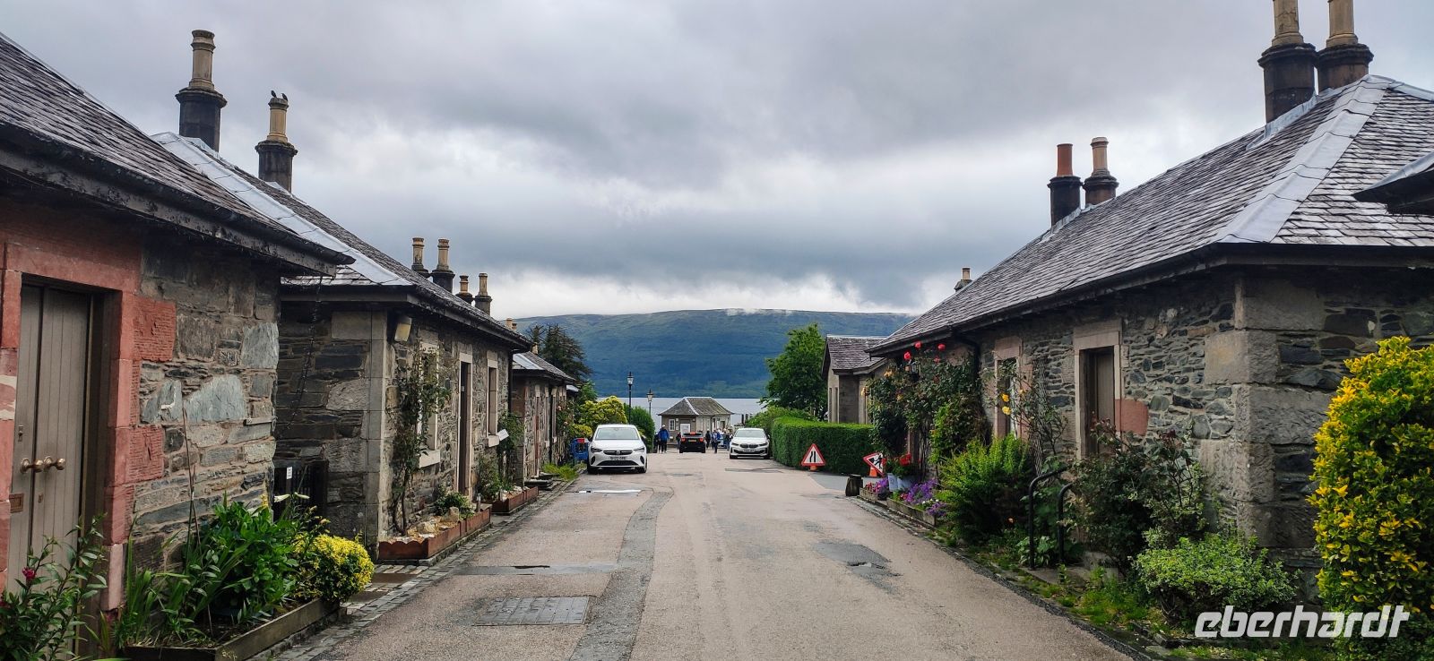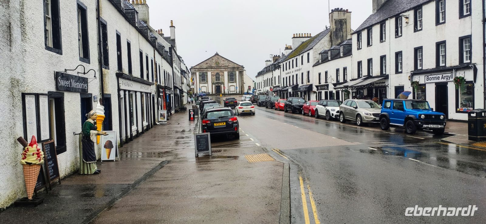 Schließlich erreichen wir das Örtchen Inverary am Loch Fyne. Leider regnet es jetzt heftig. Wir verschaffen und einen Überblick am Pier des Ortes und Blicken zum neuen Schloss der Campells, dem Inverary Castle. Hier wohnt der Duke of Argyll & Sutherland mit seiner Familie.