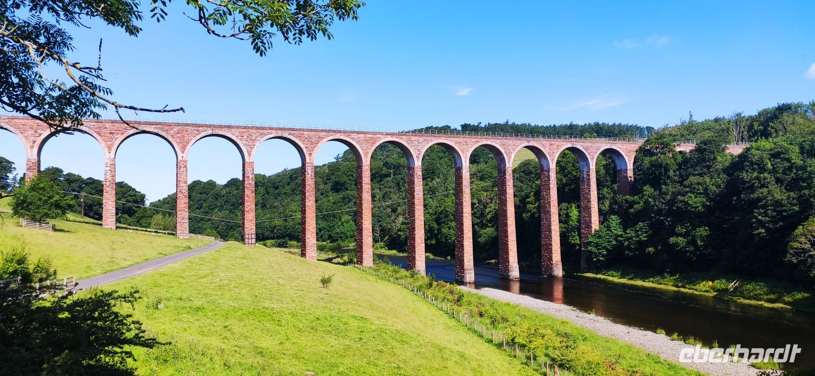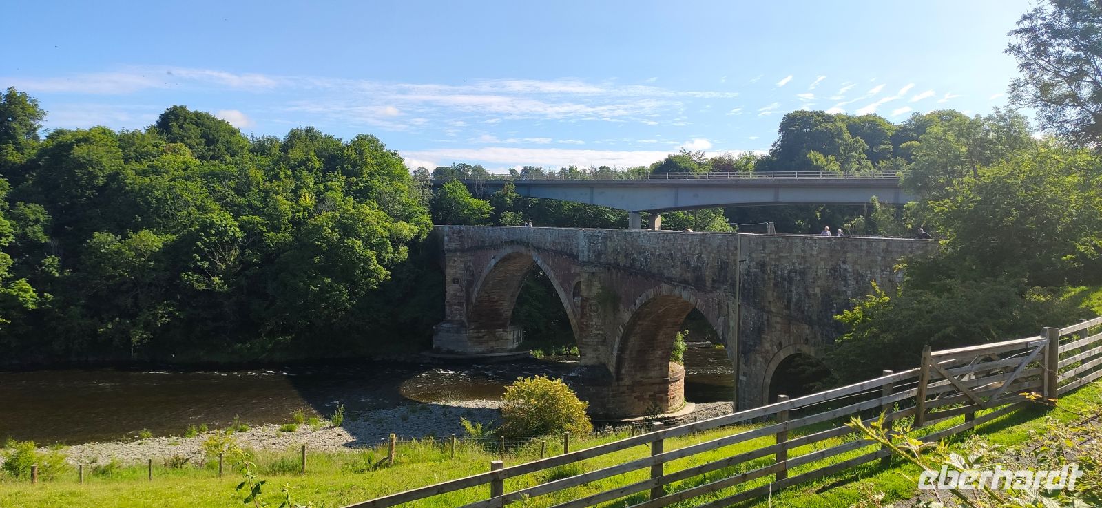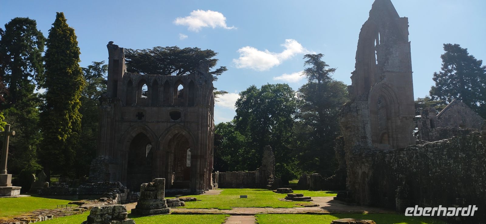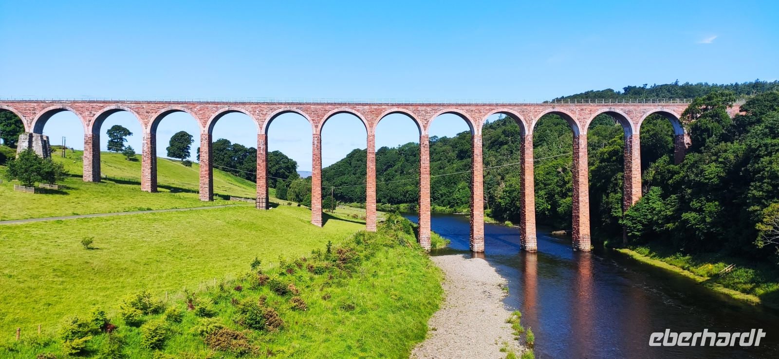 Es ist schönes Wetter und wir fahren nach Süden, hinein in die Borderlands und Richtung Jedburgh. Vorher genießen wir aber die schöne Hügellandschaft der Borders, Besuchen den Leaderfootviadukt über den Fluss Tweet, fahren hinauf zum Lieblingsplatz von Sir Walter Scott und zur romantischen Dryburgh Abbey mit dem schönen Landschaftspark und seinem Grab.