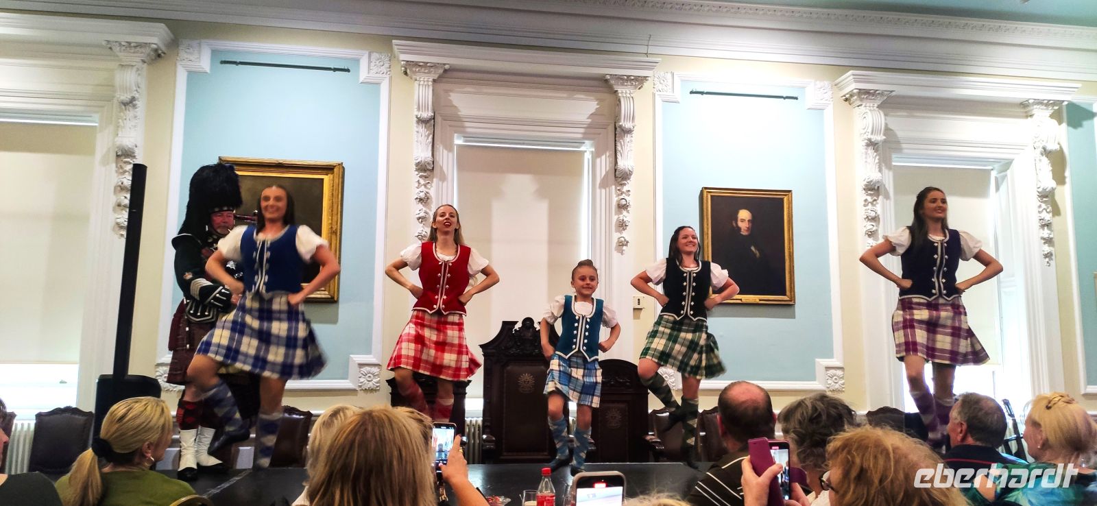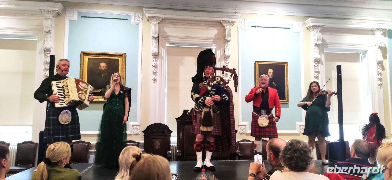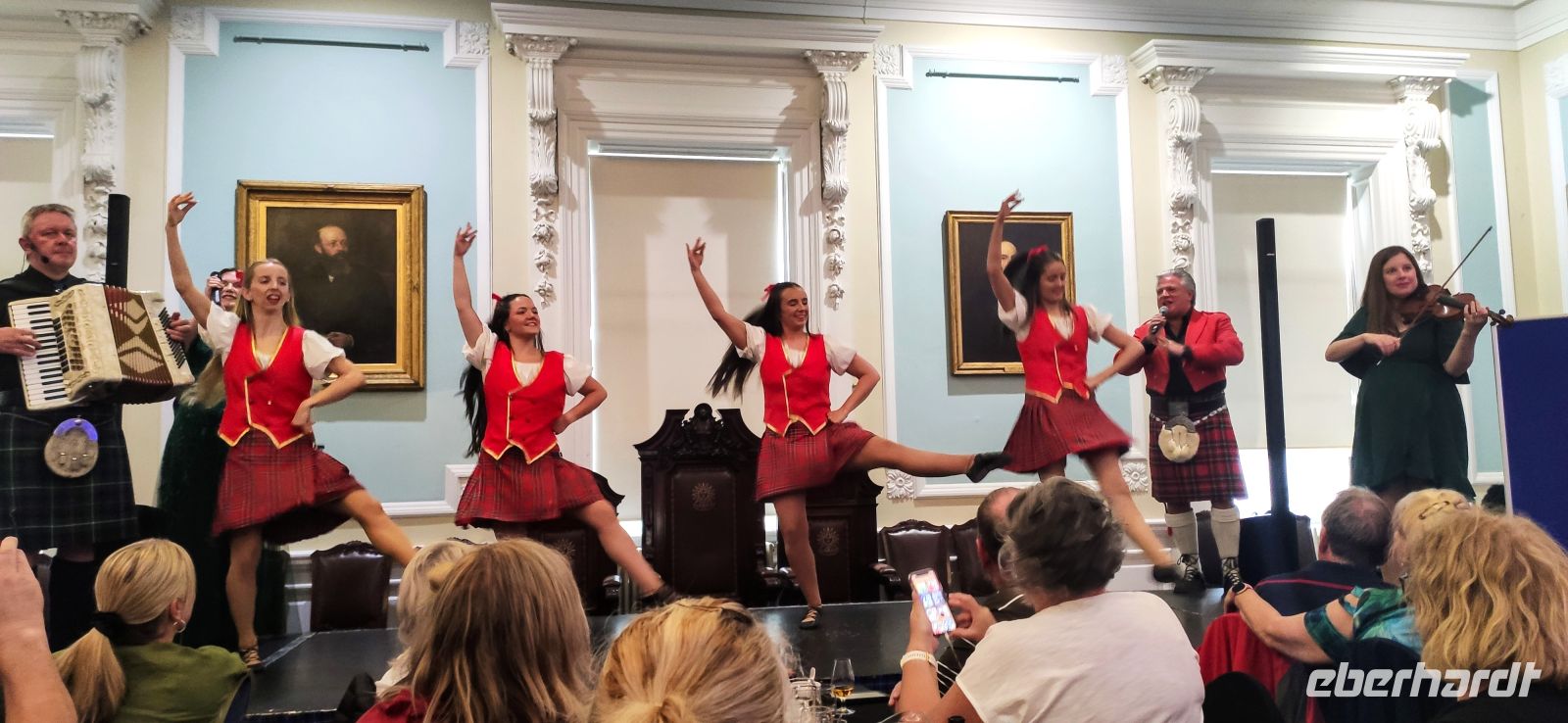 Piper, Harmonikaspieler, Sängerin und 4 Mädchen der Scottish Dancers gestalten uns einen tollen Abend, mit allen bekannten Hymnen und dem Zelebrieren von Whisky und Haggis.