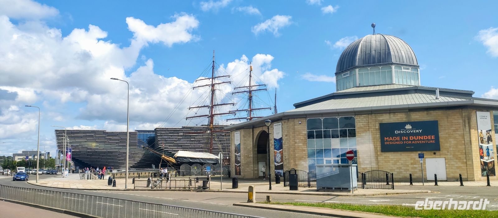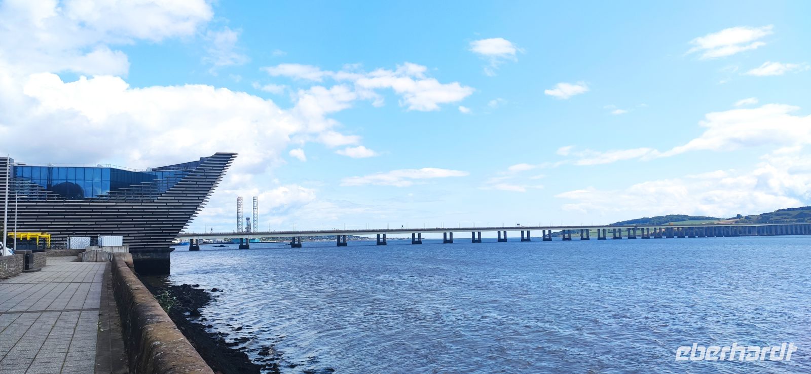 Von hier ist es nur noch ein kurzer Weg nach Süden, zu den Firth of Forth Bridges. Aber wir machen noch einen kleinen Umweg und fahren entlang des Firth of Tay nach Dundee. Die Stadt war früher für die Yute-Verarbeitung weltbekannt. Besondere Sehenswürdigkeiten sind neben der schönen Lage am Fjord die beiden Brücken darüber. Zitat des Gedichtes „Die Brück am Tay“ von Theodor Fontane. Vom Discovery Point aus, wo Scotts Polarschiff liegt, kann man auch das neue Victoria & Albert Museum besuchen.