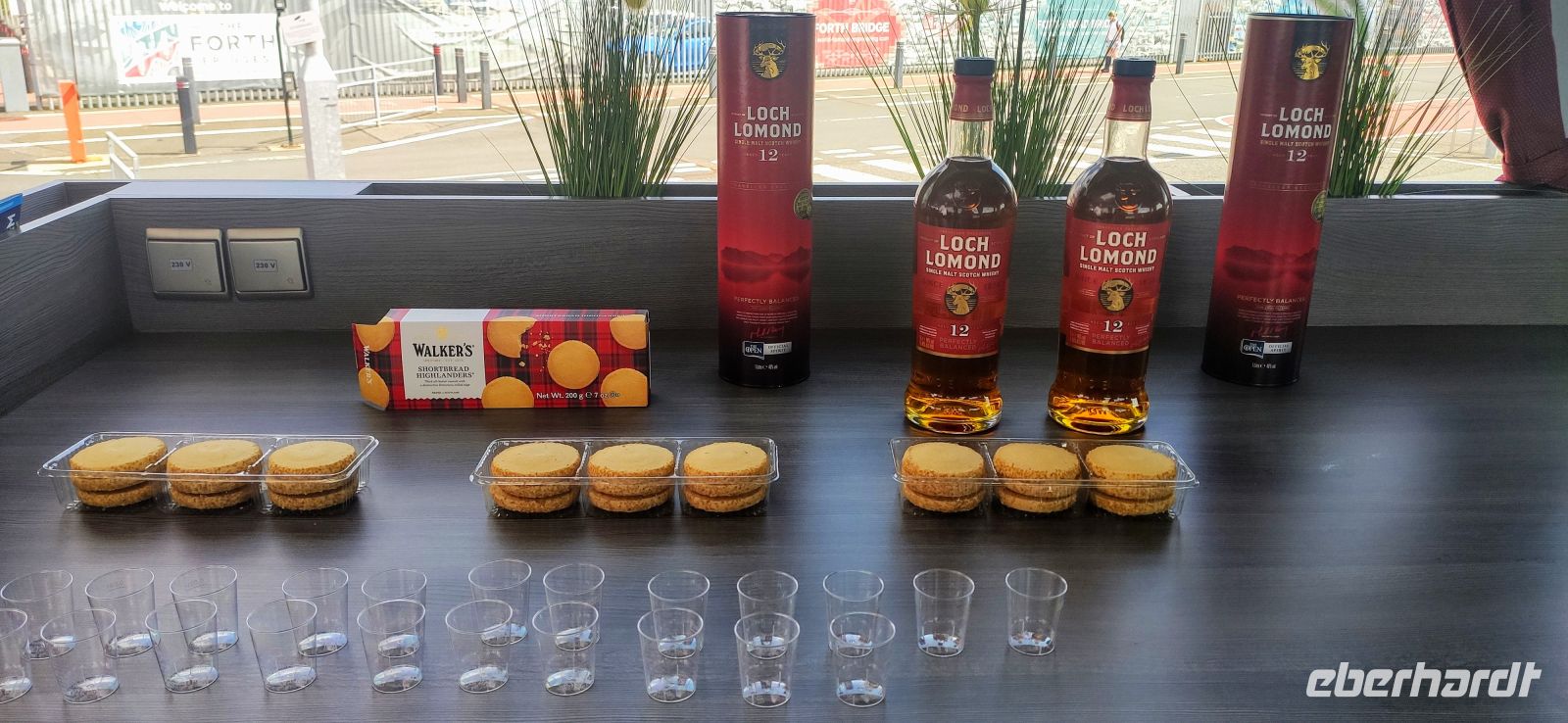 Vom Aussichtspunkt oberhalb von Queensferry können wir alle drei Brücken schön sehen. Mit einem Loch Lomond Single Malt Scotch Whisky stoßen wir gemeinsam auf die schöne Reise an und probieren auch ein schottisches Shortbread. Dann fahren wir noch hinunter an das Ufer nach South Queensferry, direkt unter die Eisenbahnbrücke, die von hier noch gewaltiger wirkt.
