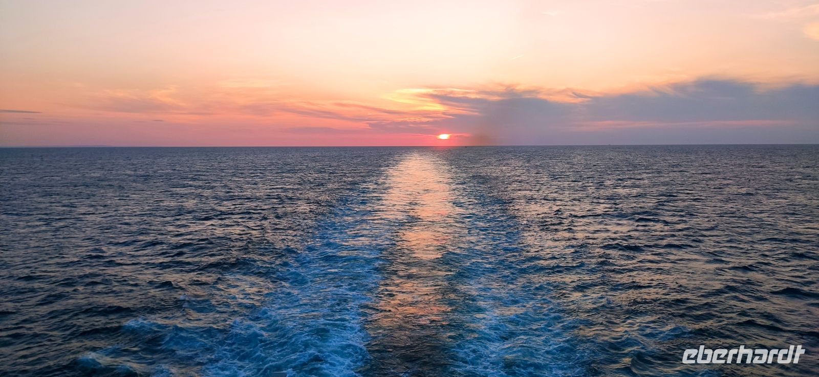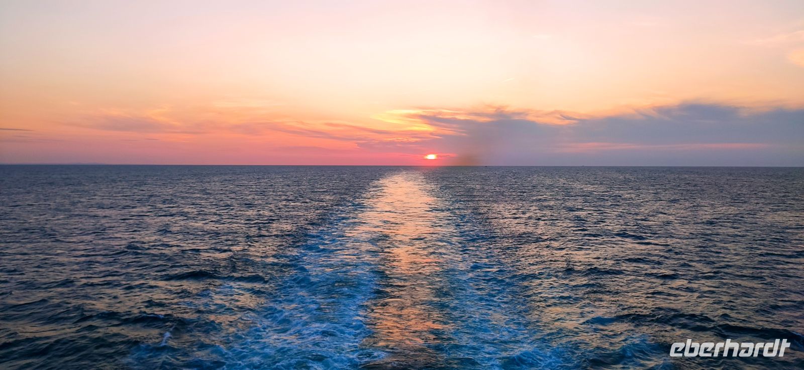 Eine wunderschöne Einstimmung in die Reise sind das tolle Buffet-Abendessen im „Kitchen-Restaurant“ des Schiffes und natürlich das Seeerlebnis während der Überfahrt. Sogar eine Wildlife-Waalbeobachterin befindet sich an Bord. Wir machen es uns in der Skybar auf dem Oberdeck gemütlich und beobachten den schönen Sonnenuntergang über der Nordsee.