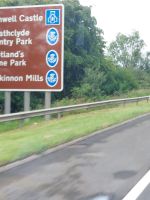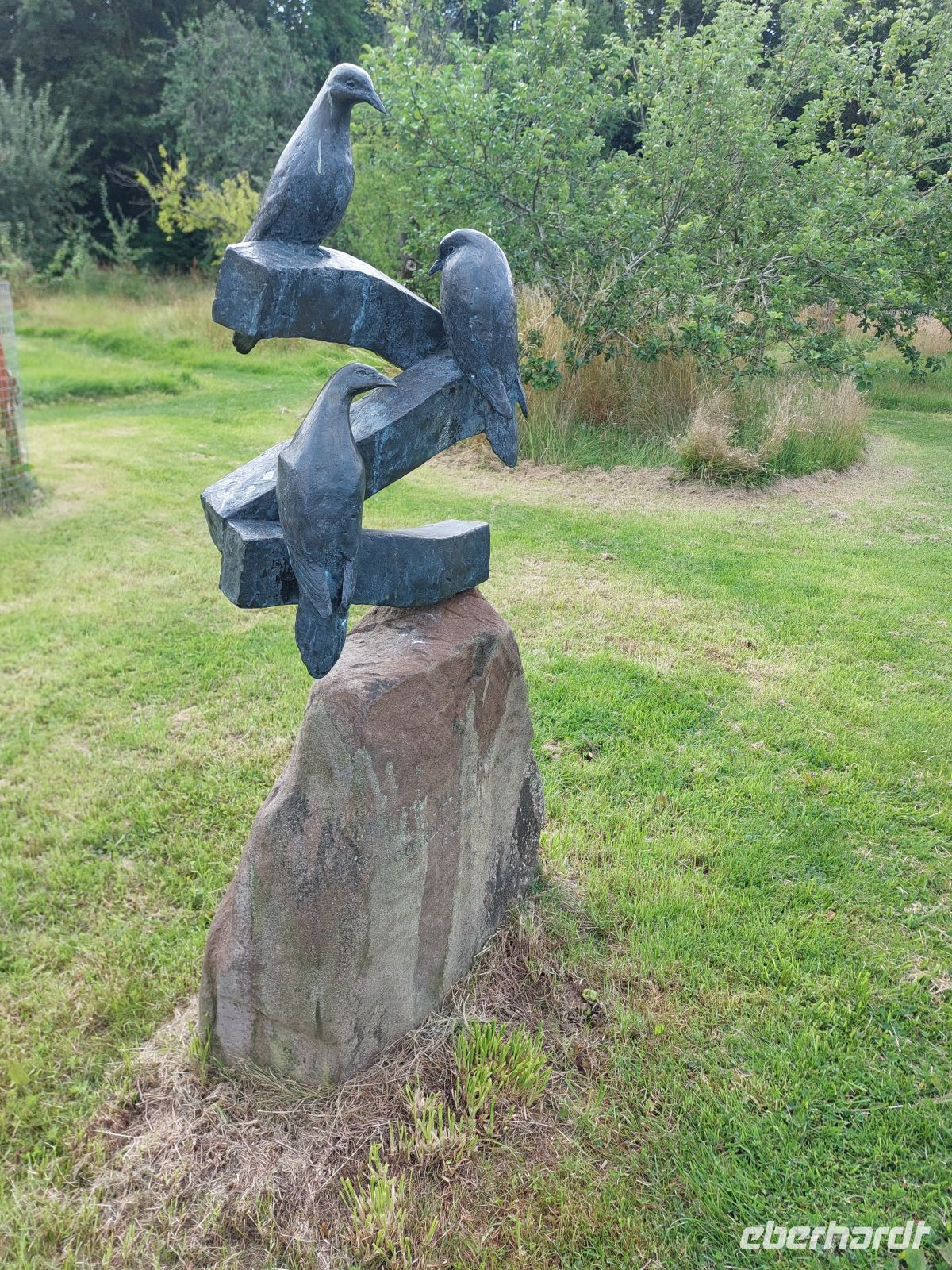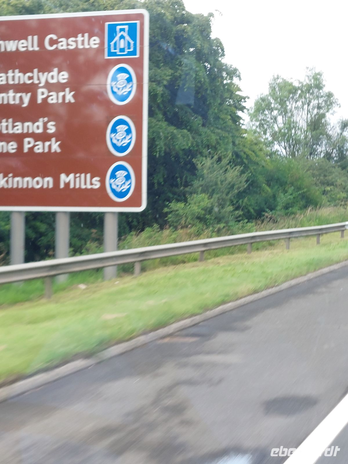 Auf dem Weg zur Autobahn fuhren wir kurz bei den Kelpies vorbei, zwei 30 Meter hohe und 300 Tonnen schwere Edelstahlskulpturen, die – stellvertretend – die beiden Arbeitspferde „Duke“ und „Baron“ (Clydesdale-Pferde) darstellen und an deren Arbeit in Industrie, Landwirtschaft und Kanalschifffahrt erinnern sollen.