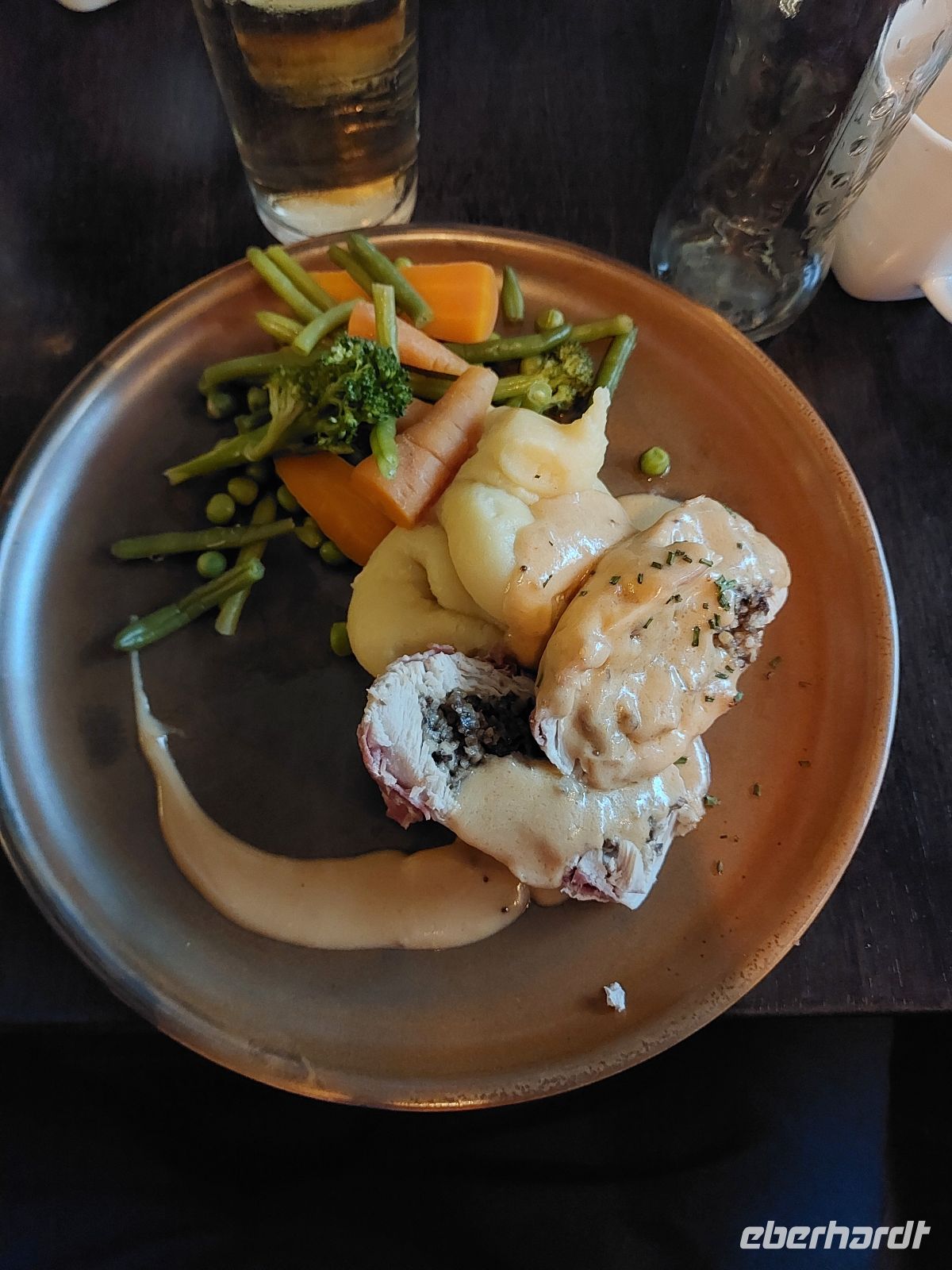 Das Abendessen, eine kräftige Tomatensuppe, Chicken Balmoral (Haggis in einer Ummantelung aus Hühnchenfleisch) mit den traditionellen Beilagen Kartoffelpüree und gemischtes Gemüse sowie Cranachan (traditioneller Nachtisch aus Himbeeren, Haferflocken, Schlagsahne und Whisky!), kam gut an und hat die Gruppe weiter zusammengebracht.