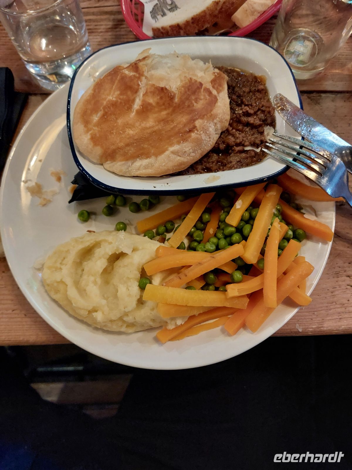 Das Abendessen im Van Winkle (Bruschetta; Minced Beef Pie mit Gemüse; Sticky Toffee Pudding) hat uns allen gut geschmeckt! Wieder ein schöner Tag in Schottland.