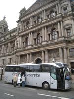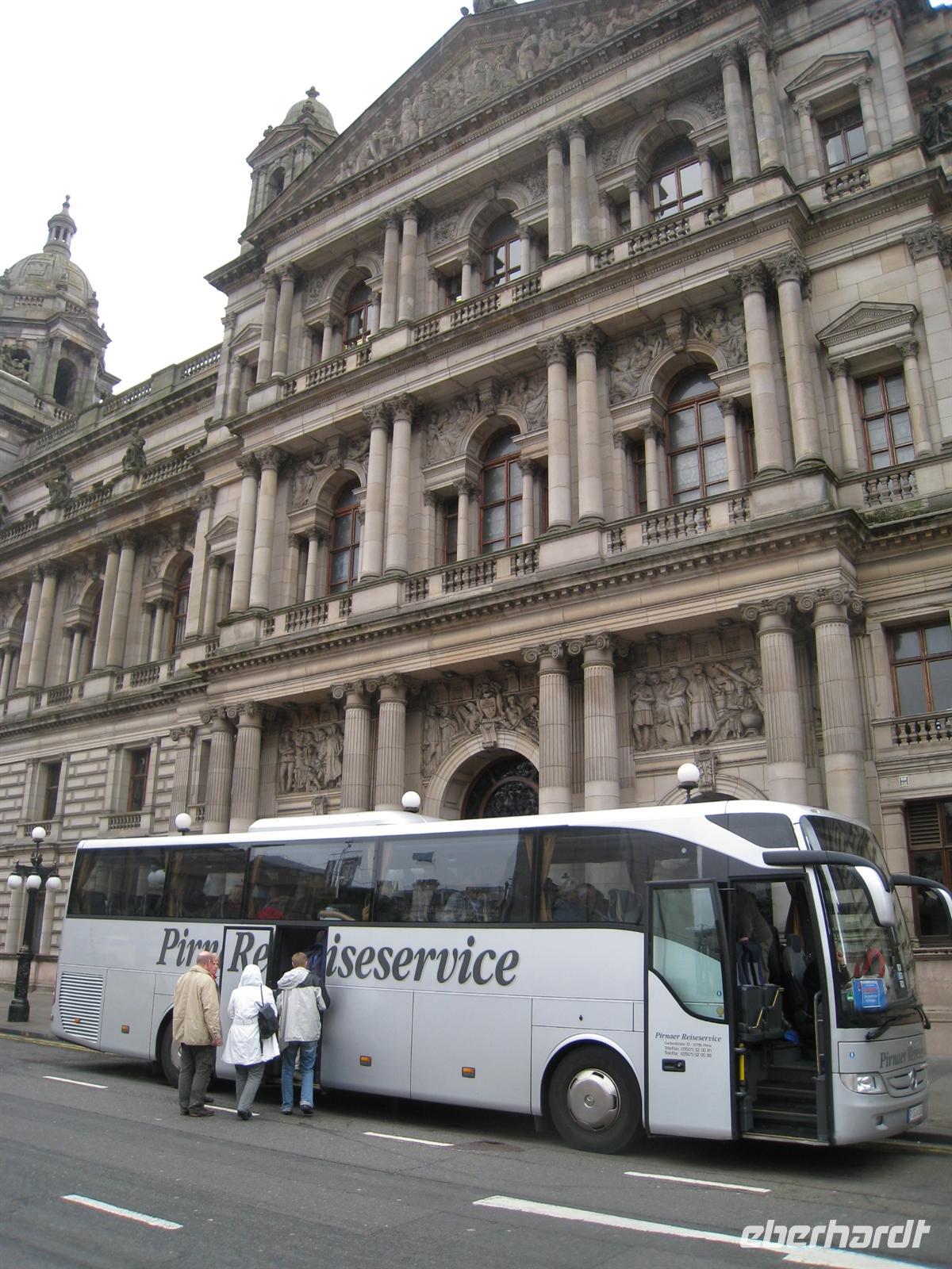 Stewart in Schottenhosen begleitet uns auf unserer Tour durch Glasgow. Zunächst zeigt er uns Glasgow als Stadt der modernen Architektur, dann die viktorianischen Gebäude aus Sandstein, die Marmortreppen des Rathauses und schloss ab an der St. Mungo Cathedrale. Glasgow des Jahres 2011 ist wahrlich keine vernebelte Arbeiterstadt, sondern hat viele Reize.