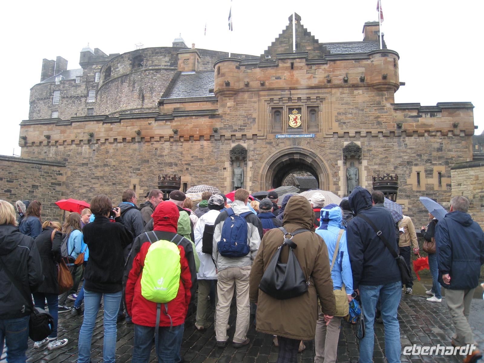 Am Vormittag fuhren wir nach Edinburgh, wo unser örtlicher Stadtführer, Ron, zustieg und uns bei Regen und Nebel den Weg durch die Neustadt - die auch nicht „neu" ist - und die Altstadt unterhalb des Castles zeigte. Wir hielten am Holyrood Palace und riskierten einen Blick durchs Eisentor auf den königlichen Palast, in dem auch die Queen wohnt, wenn sie nicht auf Balmoral Castle in Schottland ist. Im königlichen Park von Edinburgh thronen die Salisbury Hills, ein erloschener Vulkan über der Stadt; vom oft beschriebenen herrlichen Blick über den Firth of Forth und Edinburgh war bei Nebel nichts zu sehen. Am Fuße des Edinburgh Castles verließen wir unseren Bus und stiegen hinauf zur Burg. In fünf großen Steps erklärte uns Ron die wichtigsten Gebäude der Burg und ihre Bedeutung für das Königshaus. Anschließend ging jeder seiner Favorisierung nach: z.B. den schottischen Kronjuwelen, dem erwarteten Donner der One-o-clock-cannon oder der Militärgedenkstätte. Am Nachmittag trafen wir uns immer mal in kleinen Gruppen beim Schlendern durch die Straßen und Gassen, in Museen, Pubs oder Einkaufstempeln.