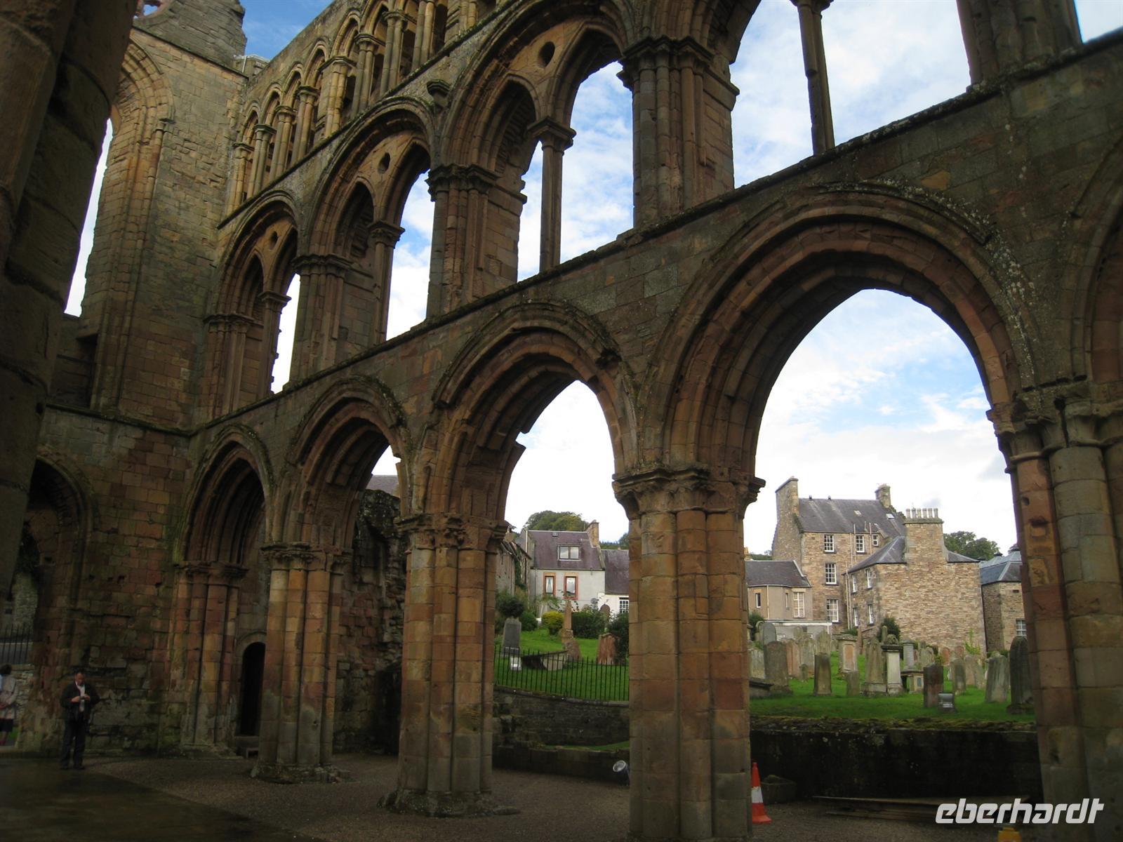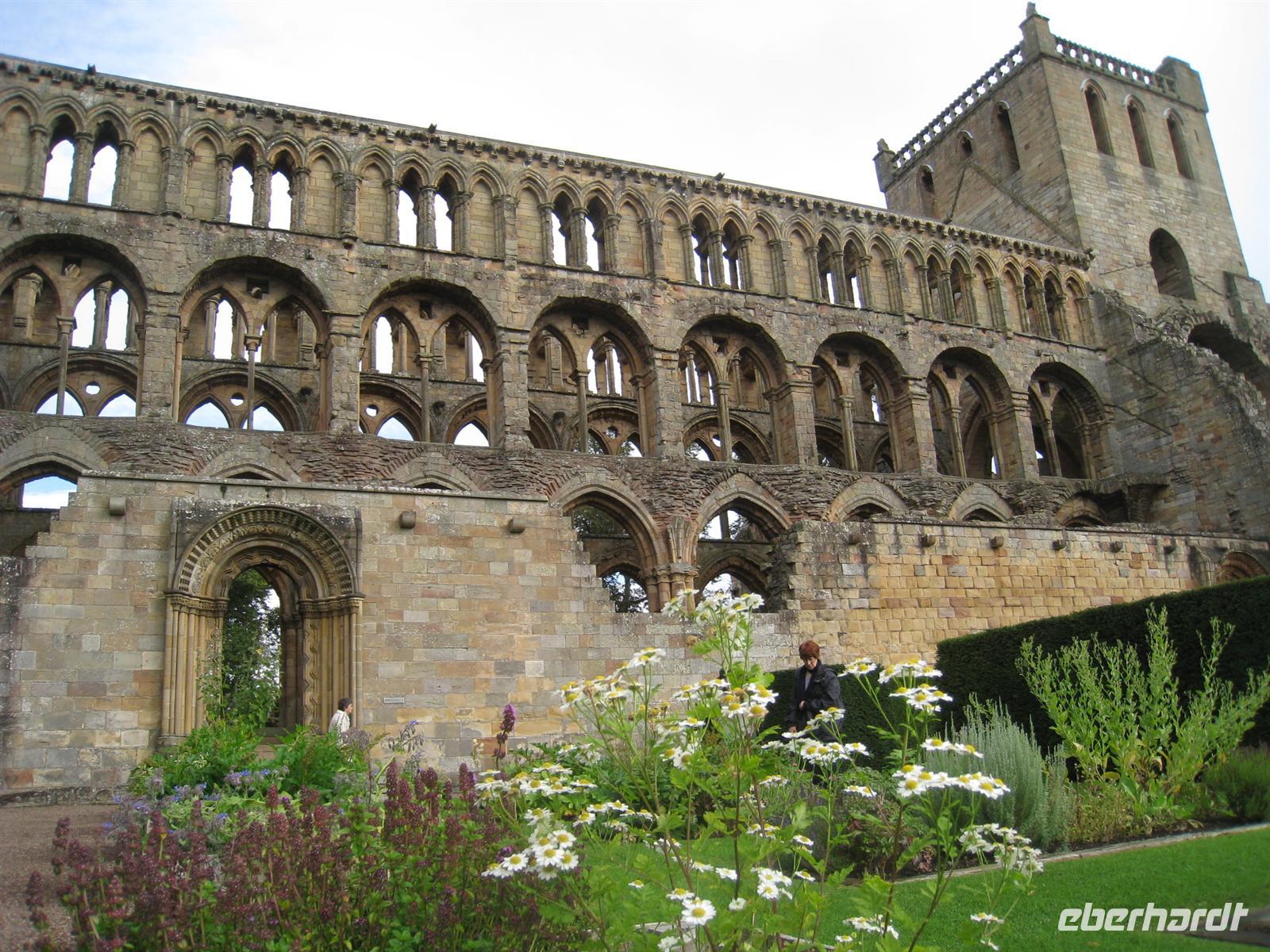 Die Busreisegruppe fuhr an Edinburgh vorbei nach Jedburgh. Wie aus einem Architekturlehrbuch für Frühgotik stehen in Jedburgh Reste der Abbey aus dem 12. Jahrhundert. Für Augustinermönche gegründet wurde die Abbey bereits im 16. Jahrhundert zerstört. Einen letzten Blick auf Schottland richteten wir von den Hügeln der Grenze zwischen Schottland und England zurück auf das Land der nun ablaufenden Urlaubstage. Eien weiteren Stopp machten wir in Hexham mit einer alten Altstadt nur wenige Kilometer vom Hadrianswall entfernt. Am späten Nachmittag erreichten wir den Fährhafen von Hull, wo wir rechtzeitig die „Pride of Rotterdam" besteigen konnten und auf der Fahrt durch die Nordsee die Reise ausklingen lassen konnten.