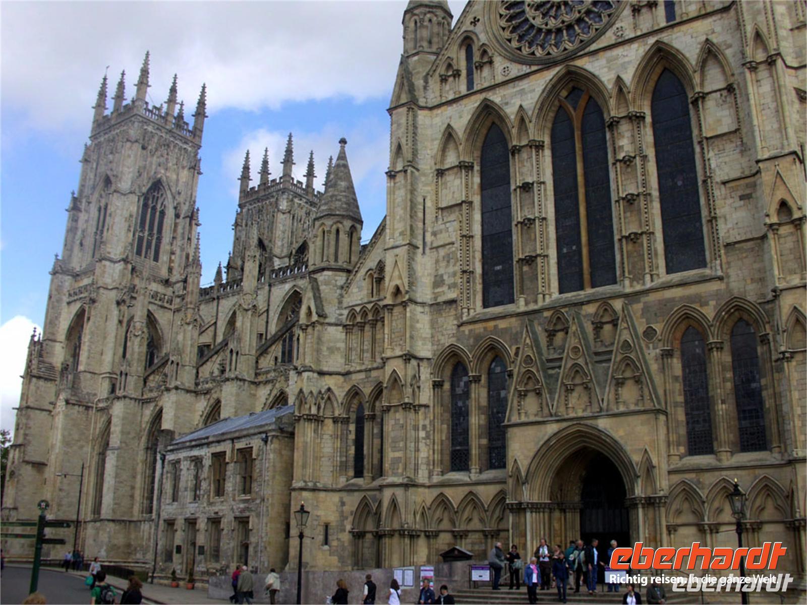 Nach kurzer Fahrt durch eine idyllische, mit Hecken bewachsene Landschaft kommt die uralte Stadt York in Sicht. Umgeben von dicken Stadtmauern ist das riesige Münster schon weit aus der Ferne sichtbar. Die größte Kirche Großbritanniens, von der Fläche her gesehen ist ein Meisterwerk der Gotik. Unter dem Münster sind sogar noch gut konservierte römische Relikte aus der Gründungsphase der Stadt zu bestaunen.