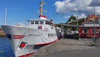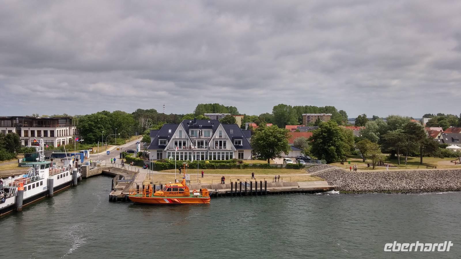 Um 17:55 Uhr fuhren wir mit dem Bus zum 1 Km entfernten Fährhafen wo wir gegen 18:00 Uhr mit der Fähre M/S „Leonora Christa" nach Roenne auf Bornholm ab- und um 19:40 anlegten.