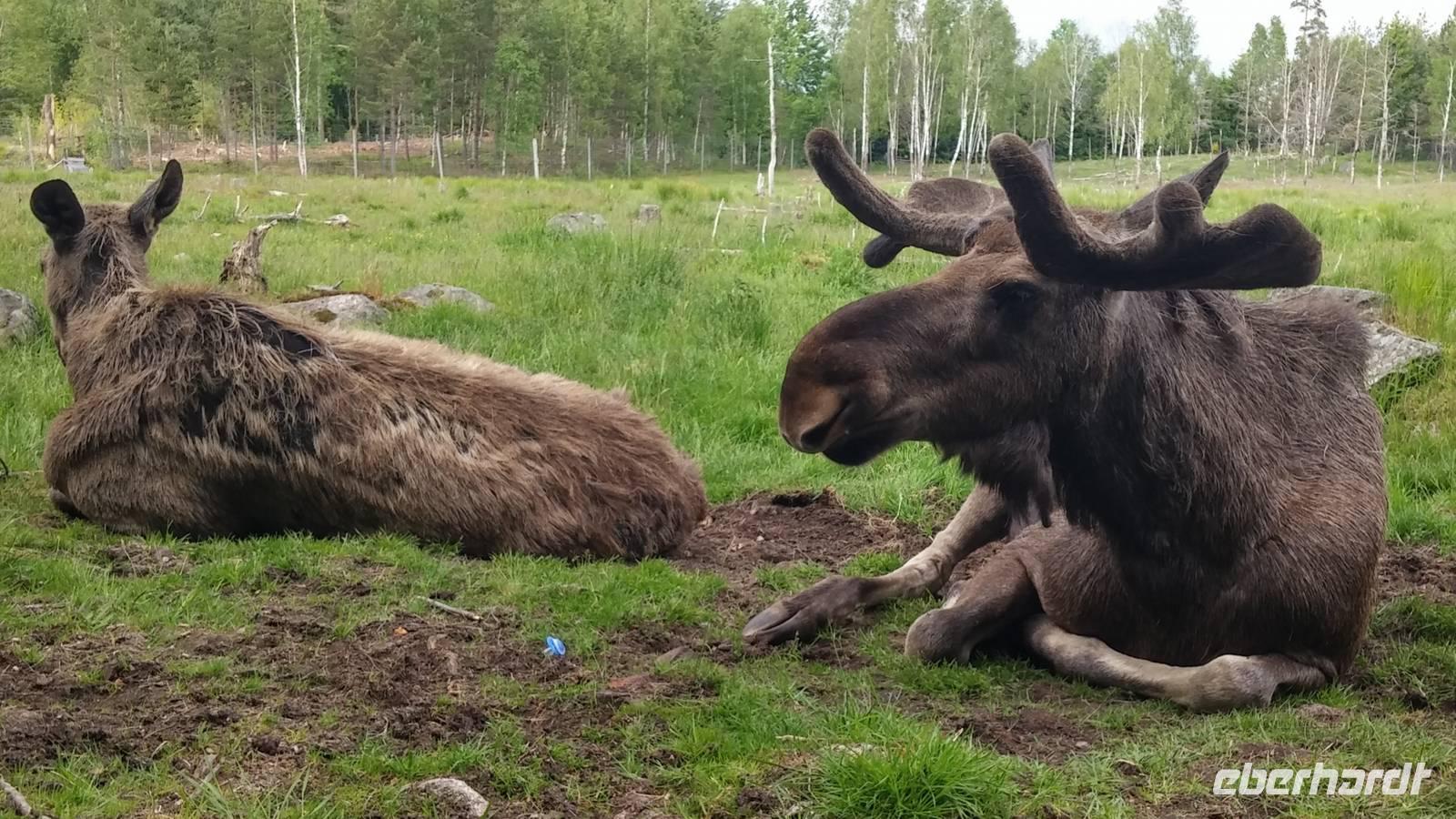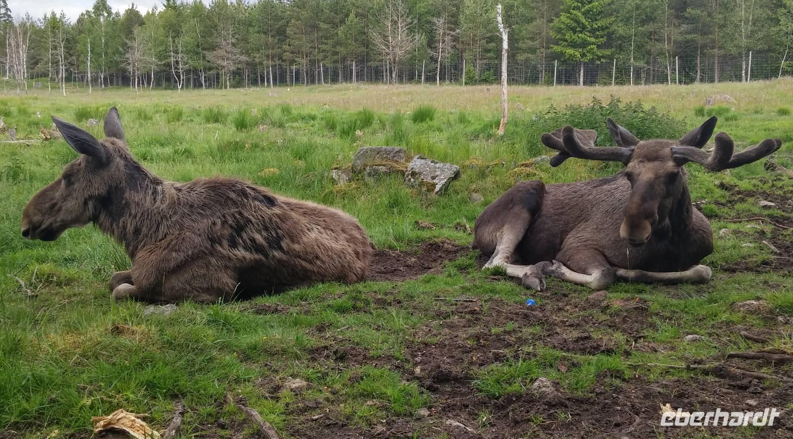 Neben den 2 zahmen Elchen nach dem Eingang zum Elchparks, die wir zur Freude einiger Gäste auch Füttern konnten, hatten wir das Glück 6 weitere Elche in Parkanlage zu sehen.