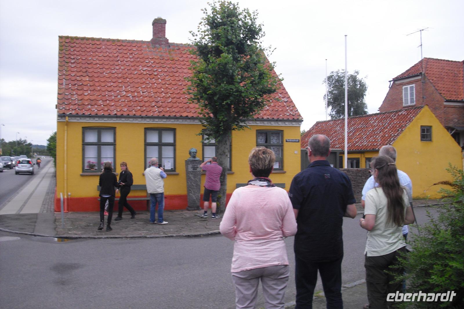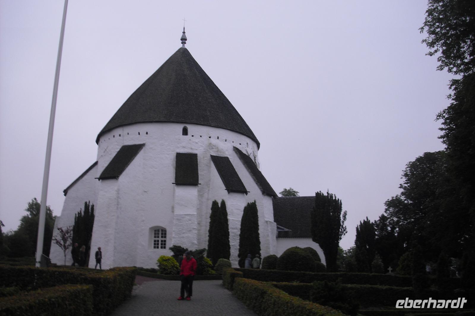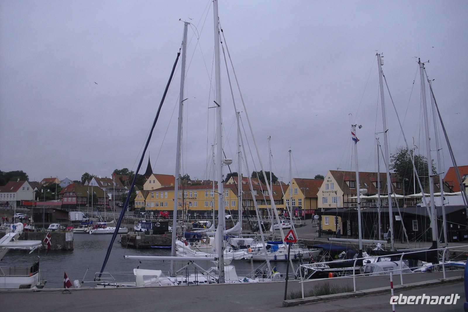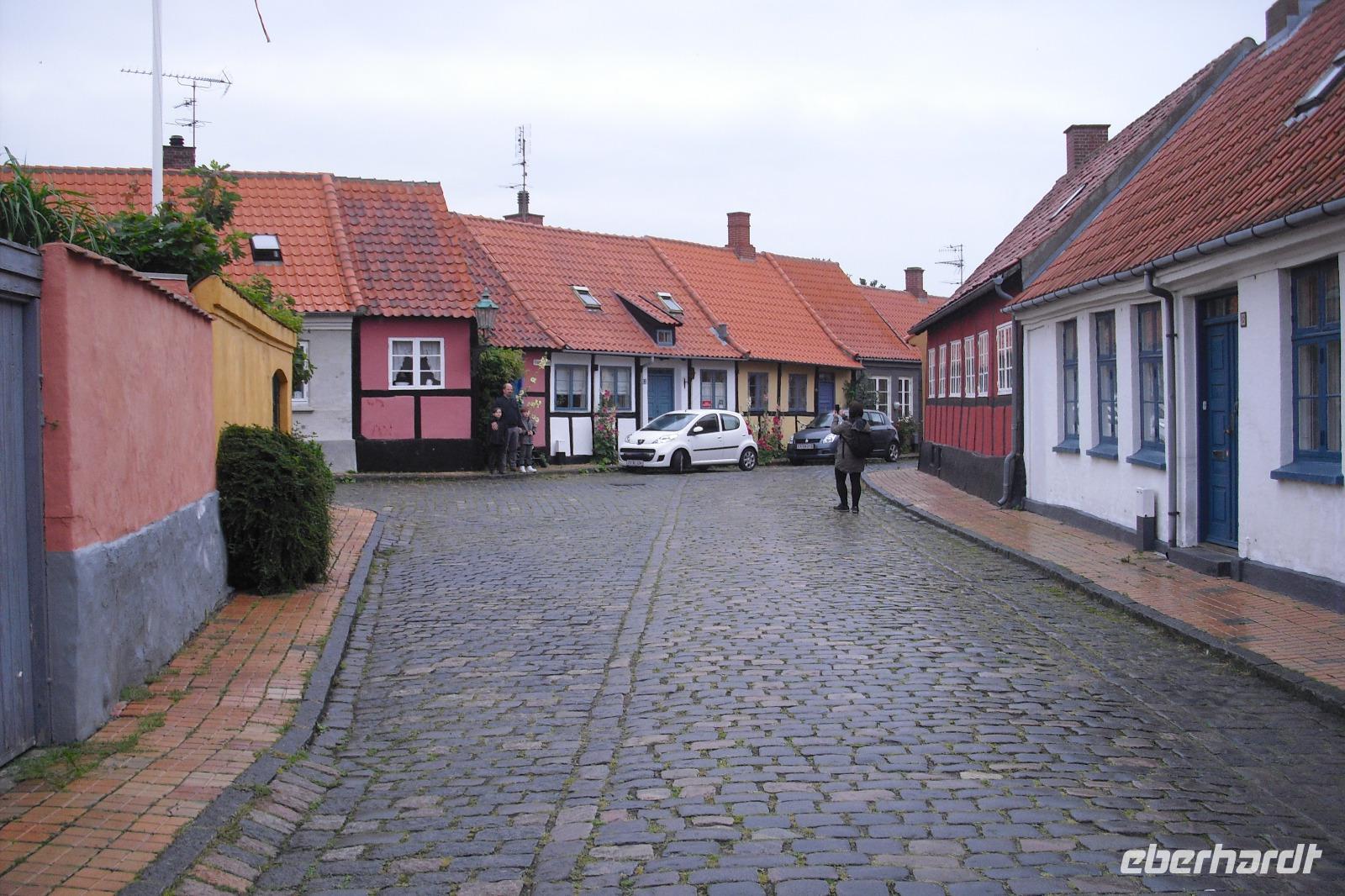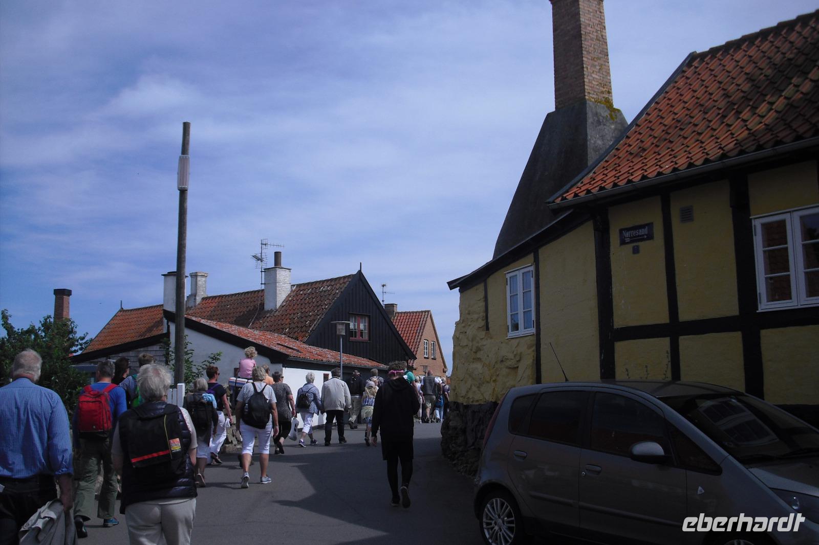 Heute zeigte sich das Wetter von einer anderen Seite, Wind und Regenschauer begleiteten uns abwechselnd. Wir waren gewappnet und fuhren nach dem Frühstück erst einmal nach Svaneke. Es ist die östlichste Stadt Dänemarks und erhielt ihre Stadtprivilegien im Mittelalter. Die alten Häuser bilden wohl das schönste Stadtbild Bornholms und ist nur an wenigen Stellen durch neuere Gebäude gestört. So ist es kein Wunder, daß Svaneke seit 1975 Besitzerin der europäischen Goldmedaille für Stadterhaltung ist. Am Hafen liegen die größten Anwesen, die ursprünglich Kaufleuten gehörten. Sehr viele Fachwerkhäuser mit einer charakterischen Steintreppe davor sind erhalten. Unser nächstes Ziel war die Osterlars Rundkirche, die größte Rundkirche Bornholms. Der Name bezieht sich auf den Heiligen der Kirche St. Laurentius, auf dänisch Lars. Die Kirche liegt etwa 100 m über dem Meer und etwa 3 km davon entfernt. Bornholms Rundkirchen sind als Kirchenburgen erbaut, um als Gotteshäuser und in unruhigen Zeiten als Zufluchtsstätten zu dienen. Wir konnten dieses Bauwerk von innen und außen in aller Ruhe besichtigen. Sicher war für Einzelne das eine oder andere Details von großem Interesse. Auch hier begegnete uns wieder ein Runenstein, wie schon in Växjö. Einen nächsten Halt auf unserer Inselrundfahrt machten wir in Hammershus, der im Nordwesten Bornholms gelegenen größten Burgruine Skandinaviens. Die ältesten Teile der Anlagen stammen mindestens aus der Zeit um 1250. Das Material dieser ältesten Teile sind Feldsteine, bei späteren Um- und Anbauten verwendete man große Backsteine. Noch heute sieht man innerhalb der Anlagen zwei Teiche mit Grundwasser, immerhin 70 m über dem Meeresspiegel, die die Trinkwasserversorgung sicher stellten. Mit der wachsenden Bedeutung von Schusswaffen wurde die Burganlage um 1600 wertlos, aber immer noch als Residenz benutzt. Mit der Schaffung der Befestigung auf Christiansoe (Erbseninsel) war das Schicksal von Hammershus besiegelt - man brauchte Steine von Hammershus. Die Ruinen stehen seit 1822 unter Denkmalsschutz und heute investiert man viel zur Erhaltung der Anlage sowie zur Schaffung eines neuen Besucherzentrums. Wir sahen es in Form von Baustellen. Das Mittagessen nahmen wir in Hasle ein. Hier gibt es noch eine von zehn Fischräuchereien, die über glimmendem Erlenholz bei maximal 80 Grad aus silbernen Fischen das Bornholmer Gold werden lassen. Wir bekamen den geräucherten Bornholmer Hering serviert und konnten unserem Magen um die Mittagszeit etwas ganz Typisches anbieten, lecker. Frisch gestärkt fuhren wir nun nach Roenne, der "Hauptstadt" Bornholms. Hier unternahmen wir einen kleinen Stadtspaziergang und konnten auch noch etwas bummeln.Roenne, die größte Stadt Bornholms mit ca. 15000 Einwohnern, entstand im frühen Mittelalter an einem Naturhafen zwischen zwei Riffen. Der Hafen und damit einhergehend der Handel besonders mit deutschen Kaufleuten aus Greifswald bestimmten die Entwicklung. Es sind noch eine Reihe schöner Stadtteile in Roenne erhalten. Wir bummelten an der Stadtkirche vorbei, der St. Nicolai Kirche, besichtigten die Hausfassaden in der Vimmelskaftet, standen vor dem ältesten privaten Theater Dänemarks und wissen auch, das Roenne im Mai 1945 sehr stark durch russische Bombenangriffe zerstört wurde. Bornholm war von 1940-1945 von deutschen Truppen besetzt und der Kommandant wollte sich nicht ergeben. Heute ist der wesentliche Teil von Industrie und Verkehrsverbindungen in Roenne konzentriert. Nach dem es gelang, uns alle wieder zur Weiterfahrt zu finden setzten wir die Rundfahrt mit einem Fotostopp am Elternhaus von Martin Andersen Nexö fort. Anschließend besuchten wir noch den wunderschönen, wenn nicht wunderschönsten Sandstrand von Dueodde. Es war im Anschluß nur noch ein Katzensprung bis zum Hotel, wo es bald das Abendessen gab.