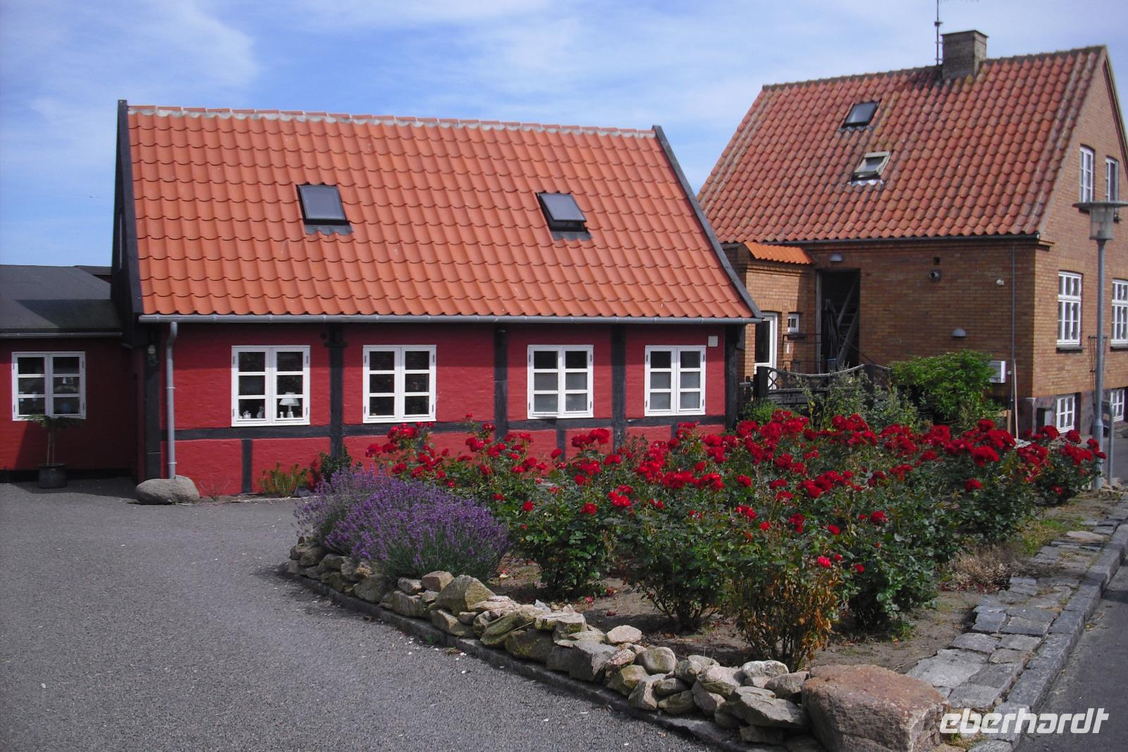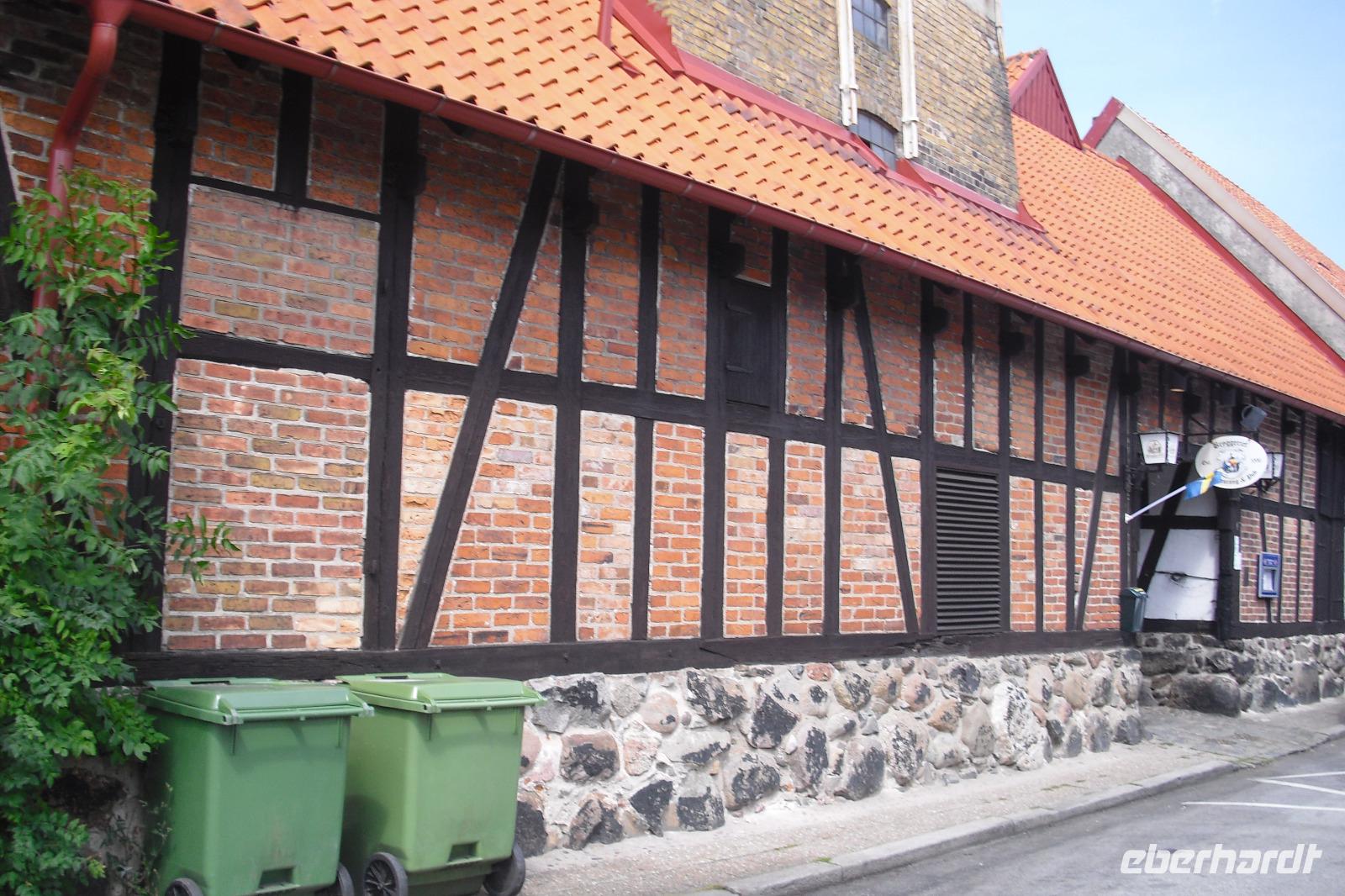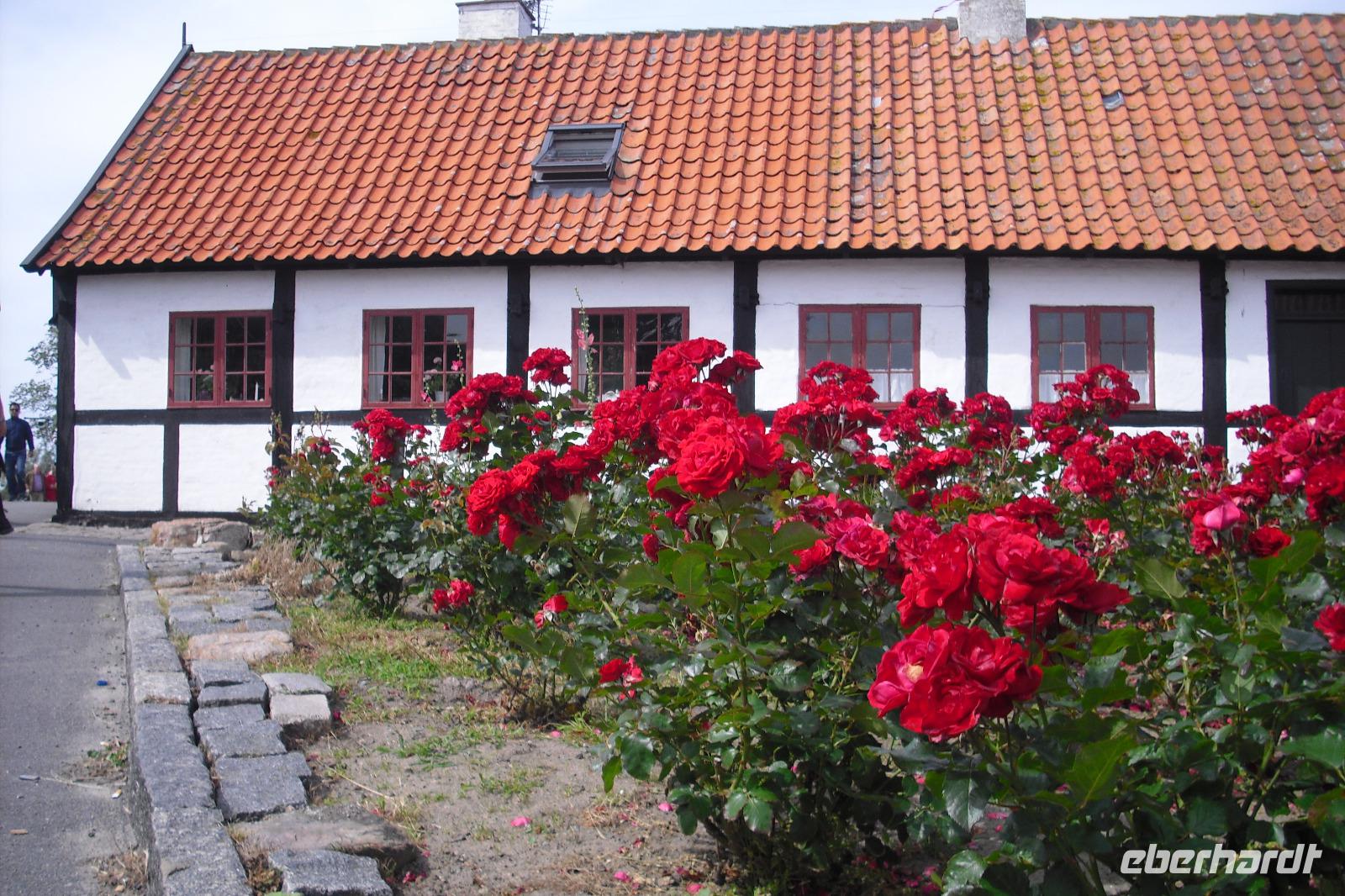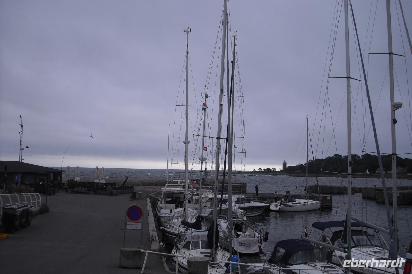 Heute zeigte sich das Wetter von einer anderen Seite, Wind und Regenschauer begleiteten uns abwechselnd. Wir waren gewappnet und fuhren nach dem Frühstück erst einmal nach Svaneke. Es ist die östlichste Stadt Dänemarks und erhielt ihre Stadtprivilegien im Mittelalter. Die alten Häuser bilden wohl das schönste Stadtbild Bornholms und ist nur an wenigen Stellen durch neuere Gebäude gestört. So ist es kein Wunder, daß Svaneke seit 1975 Besitzerin der europäischen Goldmedaille für Stadterhaltung ist. Am Hafen liegen die größten Anwesen, die ursprünglich Kaufleuten gehörten. Sehr viele Fachwerkhäuser mit einer charakterischen Steintreppe davor sind erhalten. Unser nächstes Ziel war die Osterlars Rundkirche, die größte Rundkirche Bornholms. Der Name bezieht sich auf den Heiligen der Kirche St. Laurentius, auf dänisch Lars. Die Kirche liegt etwa 100 m über dem Meer und etwa 3 km davon entfernt. Bornholms Rundkirchen sind als Kirchenburgen erbaut, um als Gotteshäuser und in unruhigen Zeiten als Zufluchtsstätten zu dienen. Wir konnten dieses Bauwerk von innen und außen in aller Ruhe besichtigen. Sicher war für Einzelne das eine oder andere Details von großem Interesse. Auch hier begegnete uns wieder ein Runenstein, wie schon in Växjö. Einen nächsten Halt auf unserer Inselrundfahrt machten wir in Hammershus, der im Nordwesten Bornholms gelegenen größten Burgruine Skandinaviens. Die ältesten Teile der Anlagen stammen mindestens aus der Zeit um 1250. Das Material dieser ältesten Teile sind Feldsteine, bei späteren Um- und Anbauten verwendete man große Backsteine. Noch heute sieht man innerhalb der Anlagen zwei Teiche mit Grundwasser, immerhin 70 m über dem Meeresspiegel, die die Trinkwasserversorgung sicher stellten. Mit der wachsenden Bedeutung von Schusswaffen wurde die Burganlage um 1600 wertlos, aber immer noch als Residenz benutzt. Mit der Schaffung der Befestigung auf Christiansoe (Erbseninsel) war das Schicksal von Hammershus besiegelt - man brauchte Steine von Hammershus. Die Ruinen stehen seit 1822 unter Denkmalsschutz und heute investiert man viel zur Erhaltung der Anlage sowie zur Schaffung eines neuen Besucherzentrums. Wir sahen es in Form von Baustellen. Das Mittagessen nahmen wir in Hasle ein. Hier gibt es noch eine von zehn Fischräuchereien, die über glimmendem Erlenholz bei maximal 80 Grad aus silbernen Fischen das Bornholmer Gold werden lassen. Wir bekamen den geräucherten Bornholmer Hering serviert und konnten unserem Magen um die Mittagszeit etwas ganz Typisches anbieten, lecker. Frisch gestärkt fuhren wir nun nach Roenne, der "Hauptstadt" Bornholms. Hier unternahmen wir einen kleinen Stadtspaziergang und konnten auch noch etwas bummeln.Roenne, die größte Stadt Bornholms mit ca. 15000 Einwohnern, entstand im frühen Mittelalter an einem Naturhafen zwischen zwei Riffen. Der Hafen und damit einhergehend der Handel besonders mit deutschen Kaufleuten aus Greifswald bestimmten die Entwicklung. Es sind noch eine Reihe schöner Stadtteile in Roenne erhalten. Wir bummelten an der Stadtkirche vorbei, der St. Nicolai Kirche, besichtigten die Hausfassaden in der Vimmelskaftet, standen vor dem ältesten privaten Theater Dänemarks und wissen auch, das Roenne im Mai 1945 sehr stark durch russische Bombenangriffe zerstört wurde. Bornholm war von 1940-1945 von deutschen Truppen besetzt und der Kommandant wollte sich nicht ergeben. Heute ist der wesentliche Teil von Industrie und Verkehrsverbindungen in Roenne konzentriert. Nach dem es gelang, uns alle wieder zur Weiterfahrt zu finden setzten wir die Rundfahrt mit einem Fotostopp am Elternhaus von Martin Andersen Nexö fort. Anschließend besuchten wir noch den wunderschönen, wenn nicht wunderschönsten Sandstrand von Dueodde. Es war im Anschluß nur noch ein Katzensprung bis zum Hotel, wo es bald das Abendessen gab.