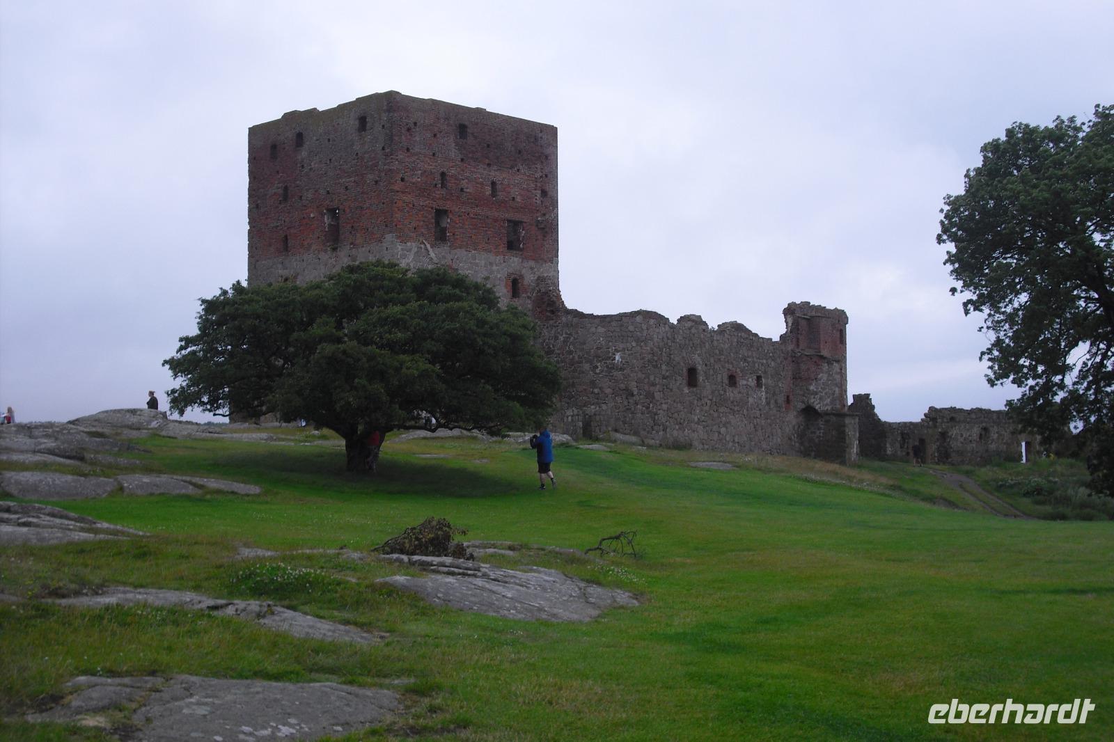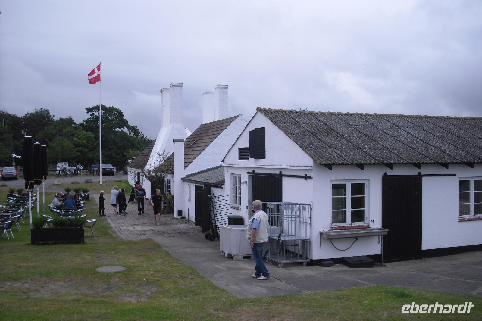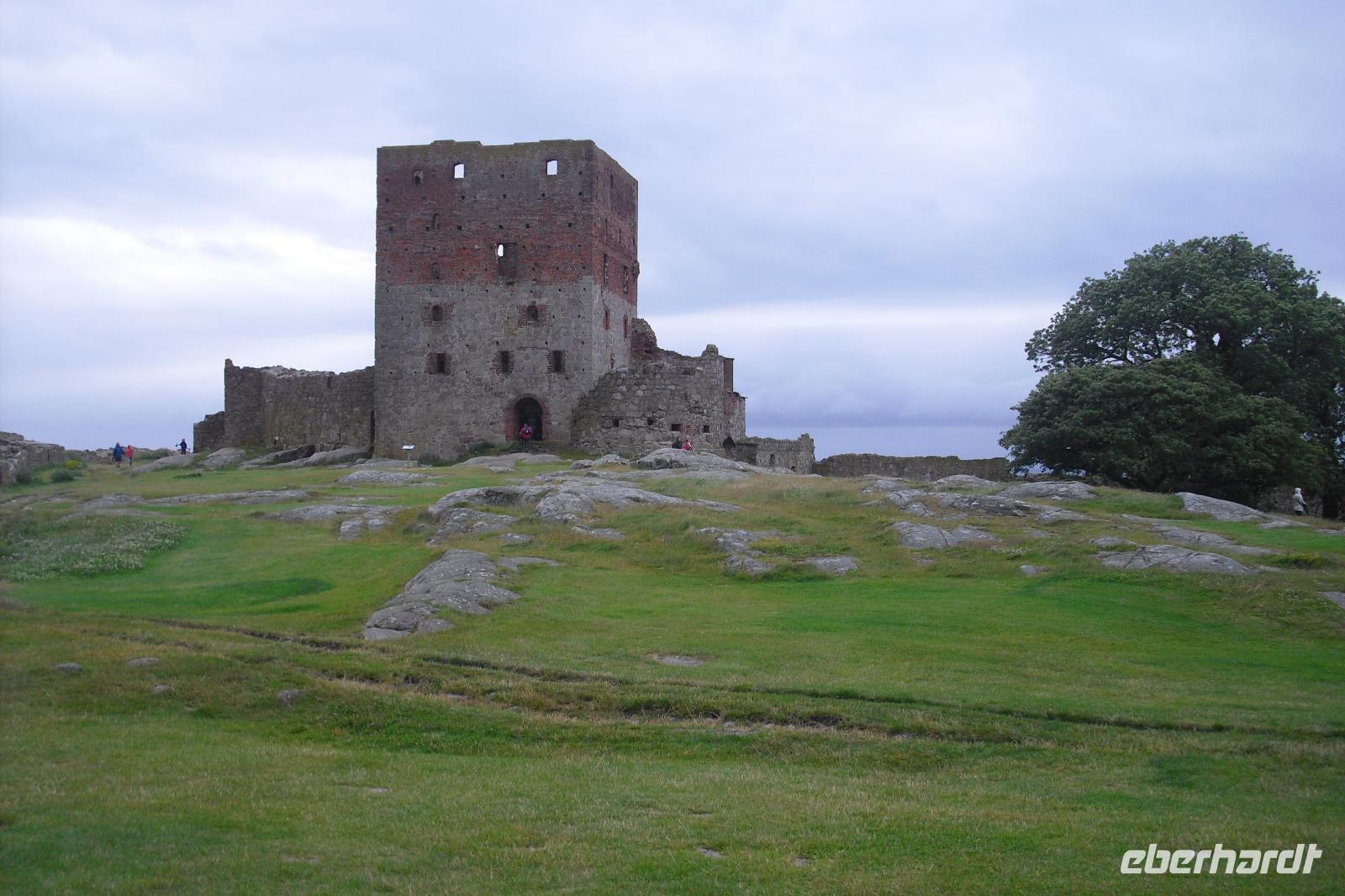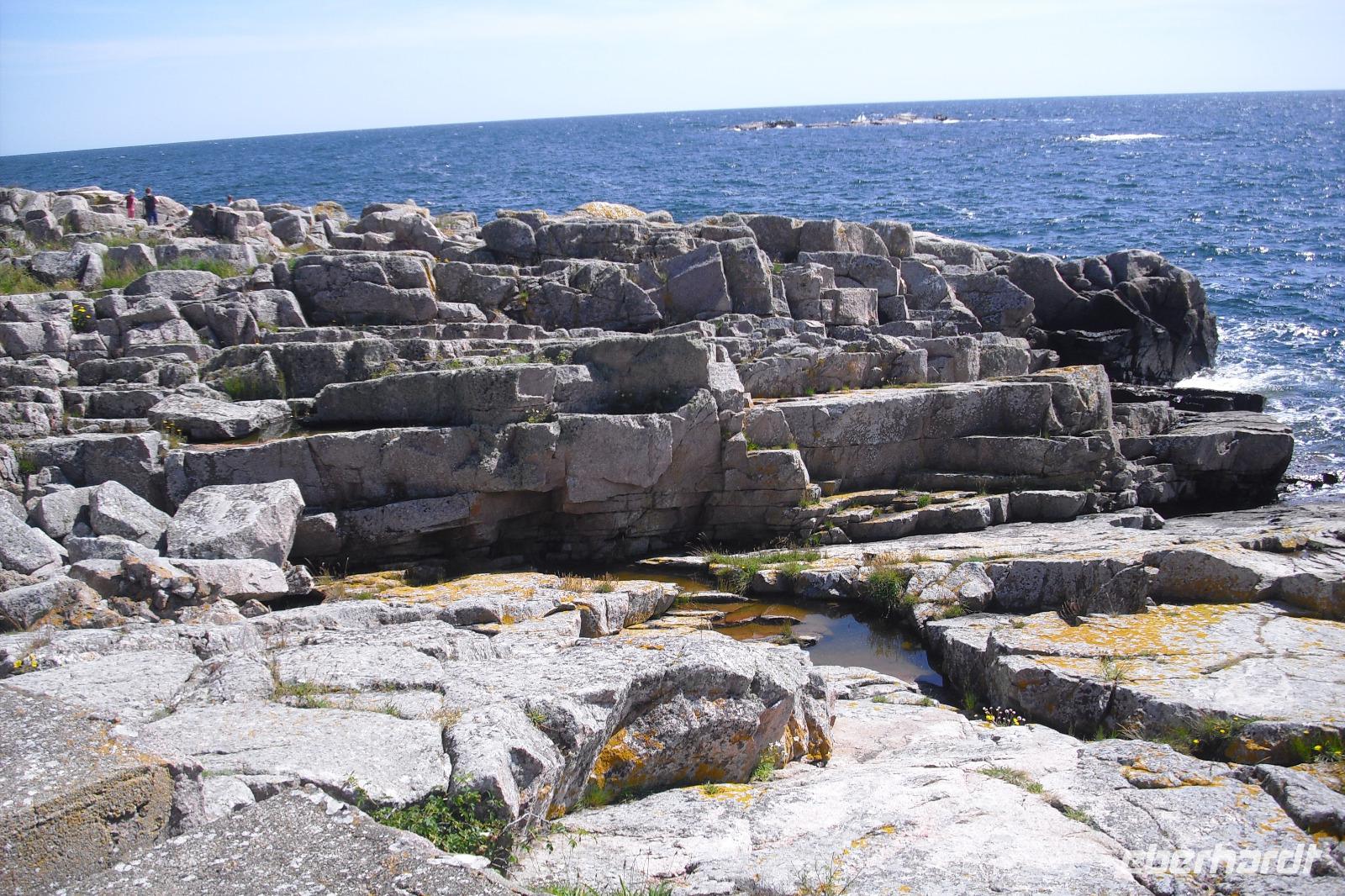 Heute zeigte sich das Wetter von einer anderen Seite, Wind und Regenschauer begleiteten uns abwechselnd. Wir waren gewappnet und fuhren nach dem Frühstück erst einmal nach Svaneke. Es ist die östlichste Stadt Dänemarks und erhielt ihre Stadtprivilegien im Mittelalter. Die alten Häuser bilden wohl das schönste Stadtbild Bornholms und ist nur an wenigen Stellen durch neuere Gebäude gestört. So ist es kein Wunder, daß Svaneke seit 1975 Besitzerin der europäischen Goldmedaille für Stadterhaltung ist. Am Hafen liegen die größten Anwesen, die ursprünglich Kaufleuten gehörten. Sehr viele Fachwerkhäuser mit einer charakterischen Steintreppe davor sind erhalten. Unser nächstes Ziel war die Osterlars Rundkirche, die größte Rundkirche Bornholms. Der Name bezieht sich auf den Heiligen der Kirche St. Laurentius, auf dänisch Lars. Die Kirche liegt etwa 100 m über dem Meer und etwa 3 km davon entfernt. Bornholms Rundkirchen sind als Kirchenburgen erbaut, um als Gotteshäuser und in unruhigen Zeiten als Zufluchtsstätten zu dienen. Wir konnten dieses Bauwerk von innen und außen in aller Ruhe besichtigen. Sicher war für Einzelne das eine oder andere Details von großem Interesse. Auch hier begegnete uns wieder ein Runenstein, wie schon in Växjö. Einen nächsten Halt auf unserer Inselrundfahrt machten wir in Hammershus, der im Nordwesten Bornholms gelegenen größten Burgruine Skandinaviens. Die ältesten Teile der Anlagen stammen mindestens aus der Zeit um 1250. Das Material dieser ältesten Teile sind Feldsteine, bei späteren Um- und Anbauten verwendete man große Backsteine. Noch heute sieht man innerhalb der Anlagen zwei Teiche mit Grundwasser, immerhin 70 m über dem Meeresspiegel, die die Trinkwasserversorgung sicher stellten. Mit der wachsenden Bedeutung von Schusswaffen wurde die Burganlage um 1600 wertlos, aber immer noch als Residenz benutzt. Mit der Schaffung der Befestigung auf Christiansoe (Erbseninsel) war das Schicksal von Hammershus besiegelt - man brauchte Steine von Hammershus. Die Ruinen stehen seit 1822 unter Denkmalsschutz und heute investiert man viel zur Erhaltung der Anlage sowie zur Schaffung eines neuen Besucherzentrums. Wir sahen es in Form von Baustellen. Das Mittagessen nahmen wir in Hasle ein. Hier gibt es noch eine von zehn Fischräuchereien, die über glimmendem Erlenholz bei maximal 80 Grad aus silbernen Fischen das Bornholmer Gold werden lassen. Wir bekamen den geräucherten Bornholmer Hering serviert und konnten unserem Magen um die Mittagszeit etwas ganz Typisches anbieten, lecker. Frisch gestärkt fuhren wir nun nach Roenne, der "Hauptstadt" Bornholms. Hier unternahmen wir einen kleinen Stadtspaziergang und konnten auch noch etwas bummeln.Roenne, die größte Stadt Bornholms mit ca. 15000 Einwohnern, entstand im frühen Mittelalter an einem Naturhafen zwischen zwei Riffen. Der Hafen und damit einhergehend der Handel besonders mit deutschen Kaufleuten aus Greifswald bestimmten die Entwicklung. Es sind noch eine Reihe schöner Stadtteile in Roenne erhalten. Wir bummelten an der Stadtkirche vorbei, der St. Nicolai Kirche, besichtigten die Hausfassaden in der Vimmelskaftet, standen vor dem ältesten privaten Theater Dänemarks und wissen auch, das Roenne im Mai 1945 sehr stark durch russische Bombenangriffe zerstört wurde. Bornholm war von 1940-1945 von deutschen Truppen besetzt und der Kommandant wollte sich nicht ergeben. Heute ist der wesentliche Teil von Industrie und Verkehrsverbindungen in Roenne konzentriert. Nach dem es gelang, uns alle wieder zur Weiterfahrt zu finden setzten wir die Rundfahrt mit einem Fotostopp am Elternhaus von Martin Andersen Nexö fort. Anschließend besuchten wir noch den wunderschönen, wenn nicht wunderschönsten Sandstrand von Dueodde. Es war im Anschluß nur noch ein Katzensprung bis zum Hotel, wo es bald das Abendessen gab.