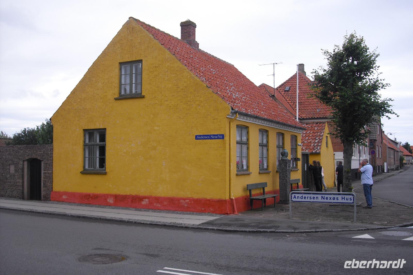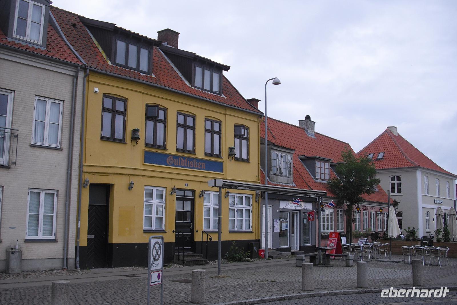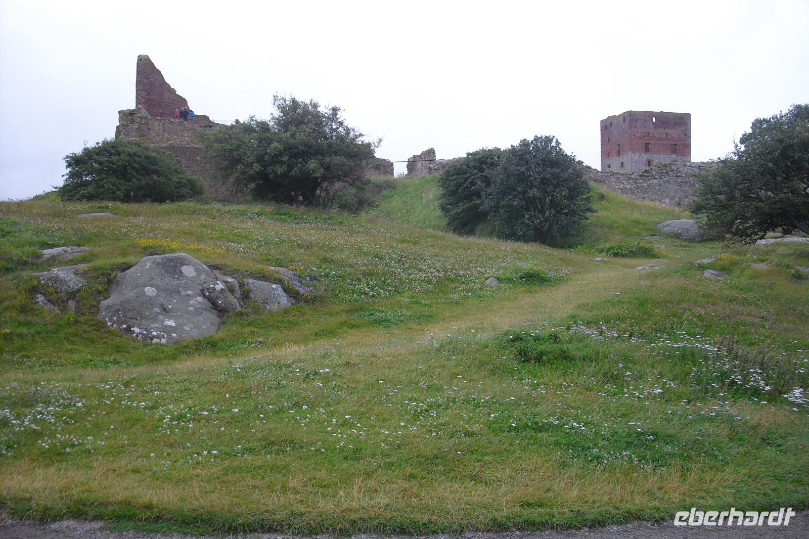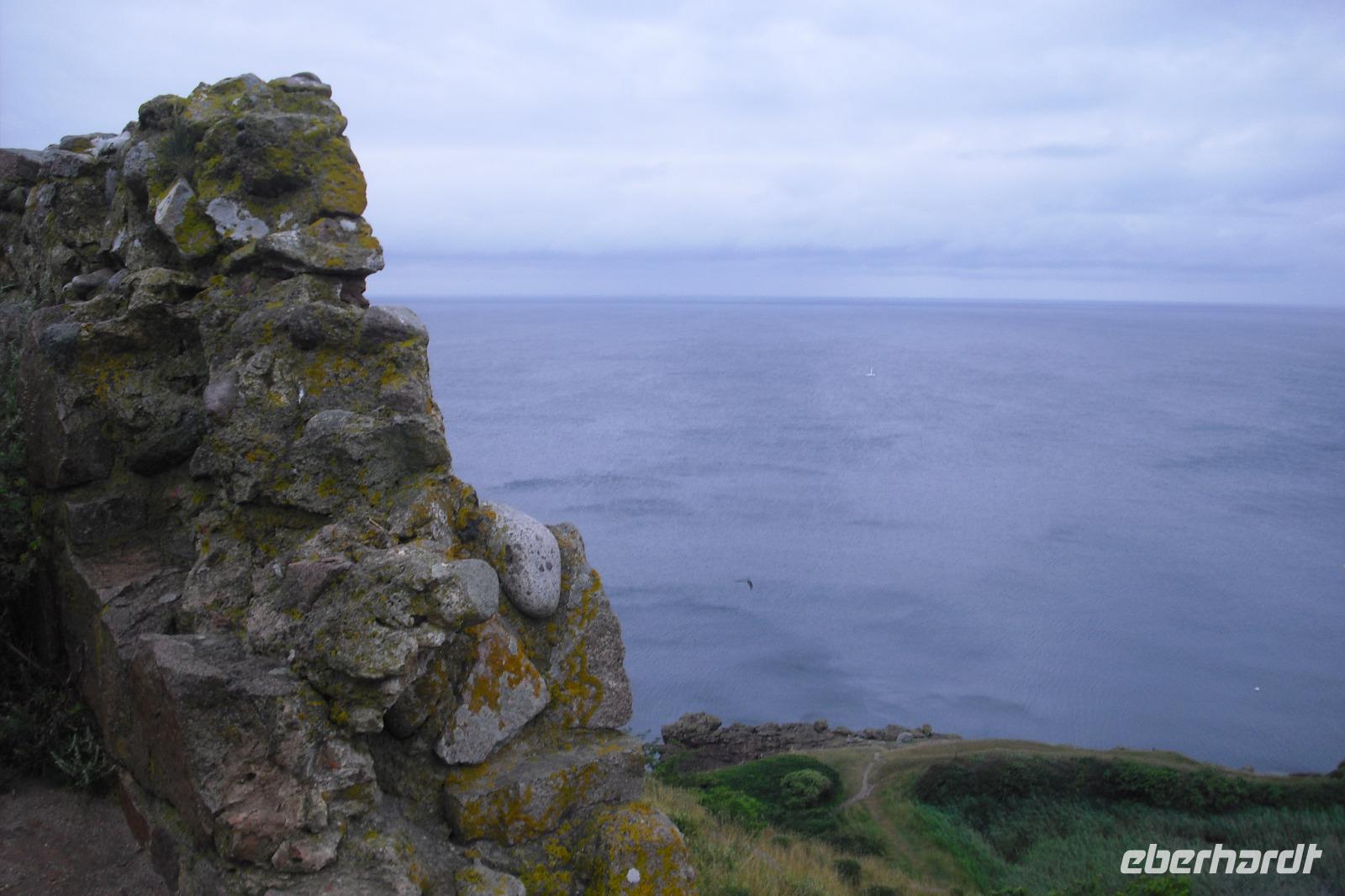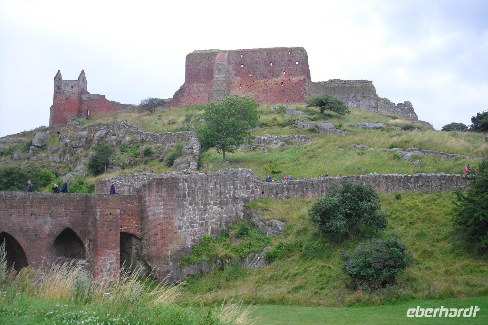 Heute zeigte sich das Wetter von einer anderen Seite, Wind und Regenschauer begleiteten uns abwechselnd. Wir waren gewappnet und fuhren nach dem Frühstück erst einmal nach Svaneke. Es ist die östlichste Stadt Dänemarks und erhielt ihre Stadtprivilegien im Mittelalter. Die alten Häuser bilden wohl das schönste Stadtbild Bornholms und ist nur an wenigen Stellen durch neuere Gebäude gestört. So ist es kein Wunder, daß Svaneke seit 1975 Besitzerin der europäischen Goldmedaille für Stadterhaltung ist. Am Hafen liegen die größten Anwesen, die ursprünglich Kaufleuten gehörten. Sehr viele Fachwerkhäuser mit einer charakterischen Steintreppe davor sind erhalten. Unser nächstes Ziel war die Osterlars Rundkirche, die größte Rundkirche Bornholms. Der Name bezieht sich auf den Heiligen der Kirche St. Laurentius, auf dänisch Lars. Die Kirche liegt etwa 100 m über dem Meer und etwa 3 km davon entfernt. Bornholms Rundkirchen sind als Kirchenburgen erbaut, um als Gotteshäuser und in unruhigen Zeiten als Zufluchtsstätten zu dienen. Wir konnten dieses Bauwerk von innen und außen in aller Ruhe besichtigen. Sicher war für Einzelne das eine oder andere Details von großem Interesse. Auch hier begegnete uns wieder ein Runenstein, wie schon in Växjö. Einen nächsten Halt auf unserer Inselrundfahrt machten wir in Hammershus, der im Nordwesten Bornholms gelegenen größten Burgruine Skandinaviens. Die ältesten Teile der Anlagen stammen mindestens aus der Zeit um 1250. Das Material dieser ältesten Teile sind Feldsteine, bei späteren Um- und Anbauten verwendete man große Backsteine. Noch heute sieht man innerhalb der Anlagen zwei Teiche mit Grundwasser, immerhin 70 m über dem Meeresspiegel, die die Trinkwasserversorgung sicher stellten. Mit der wachsenden Bedeutung von Schusswaffen wurde die Burganlage um 1600 wertlos, aber immer noch als Residenz benutzt. Mit der Schaffung der Befestigung auf Christiansoe (Erbseninsel) war das Schicksal von Hammershus besiegelt - man brauchte Steine von Hammershus. Die Ruinen stehen seit 1822 unter Denkmalsschutz und heute investiert man viel zur Erhaltung der Anlage sowie zur Schaffung eines neuen Besucherzentrums. Wir sahen es in Form von Baustellen. Das Mittagessen nahmen wir in Hasle ein. Hier gibt es noch eine von zehn Fischräuchereien, die über glimmendem Erlenholz bei maximal 80 Grad aus silbernen Fischen das Bornholmer Gold werden lassen. Wir bekamen den geräucherten Bornholmer Hering serviert und konnten unserem Magen um die Mittagszeit etwas ganz Typisches anbieten, lecker. Frisch gestärkt fuhren wir nun nach Roenne, der "Hauptstadt" Bornholms. Hier unternahmen wir einen kleinen Stadtspaziergang und konnten auch noch etwas bummeln.Roenne, die größte Stadt Bornholms mit ca. 15000 Einwohnern, entstand im frühen Mittelalter an einem Naturhafen zwischen zwei Riffen. Der Hafen und damit einhergehend der Handel besonders mit deutschen Kaufleuten aus Greifswald bestimmten die Entwicklung. Es sind noch eine Reihe schöner Stadtteile in Roenne erhalten. Wir bummelten an der Stadtkirche vorbei, der St. Nicolai Kirche, besichtigten die Hausfassaden in der Vimmelskaftet, standen vor dem ältesten privaten Theater Dänemarks und wissen auch, das Roenne im Mai 1945 sehr stark durch russische Bombenangriffe zerstört wurde. Bornholm war von 1940-1945 von deutschen Truppen besetzt und der Kommandant wollte sich nicht ergeben. Heute ist der wesentliche Teil von Industrie und Verkehrsverbindungen in Roenne konzentriert. Nach dem es gelang, uns alle wieder zur Weiterfahrt zu finden setzten wir die Rundfahrt mit einem Fotostopp am Elternhaus von Martin Andersen Nexö fort. Anschließend besuchten wir noch den wunderschönen, wenn nicht wunderschönsten Sandstrand von Dueodde. Es war im Anschluß nur noch ein Katzensprung bis zum Hotel, wo es bald das Abendessen gab.