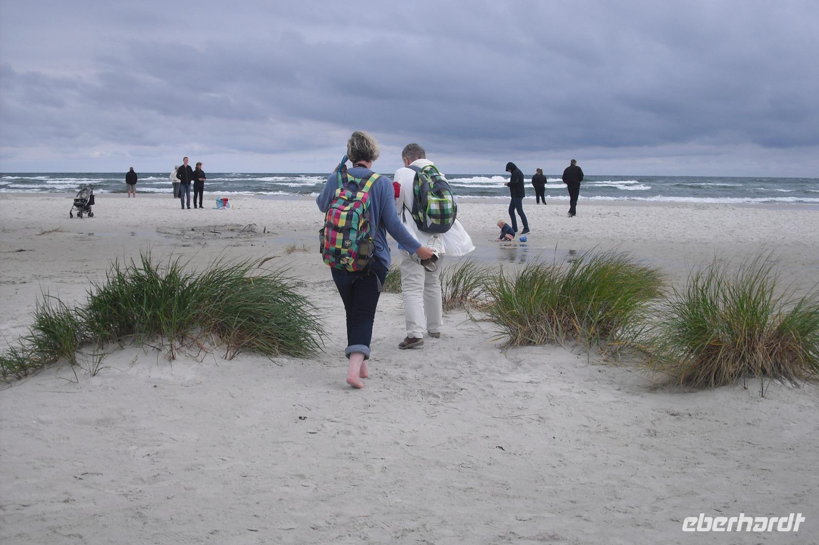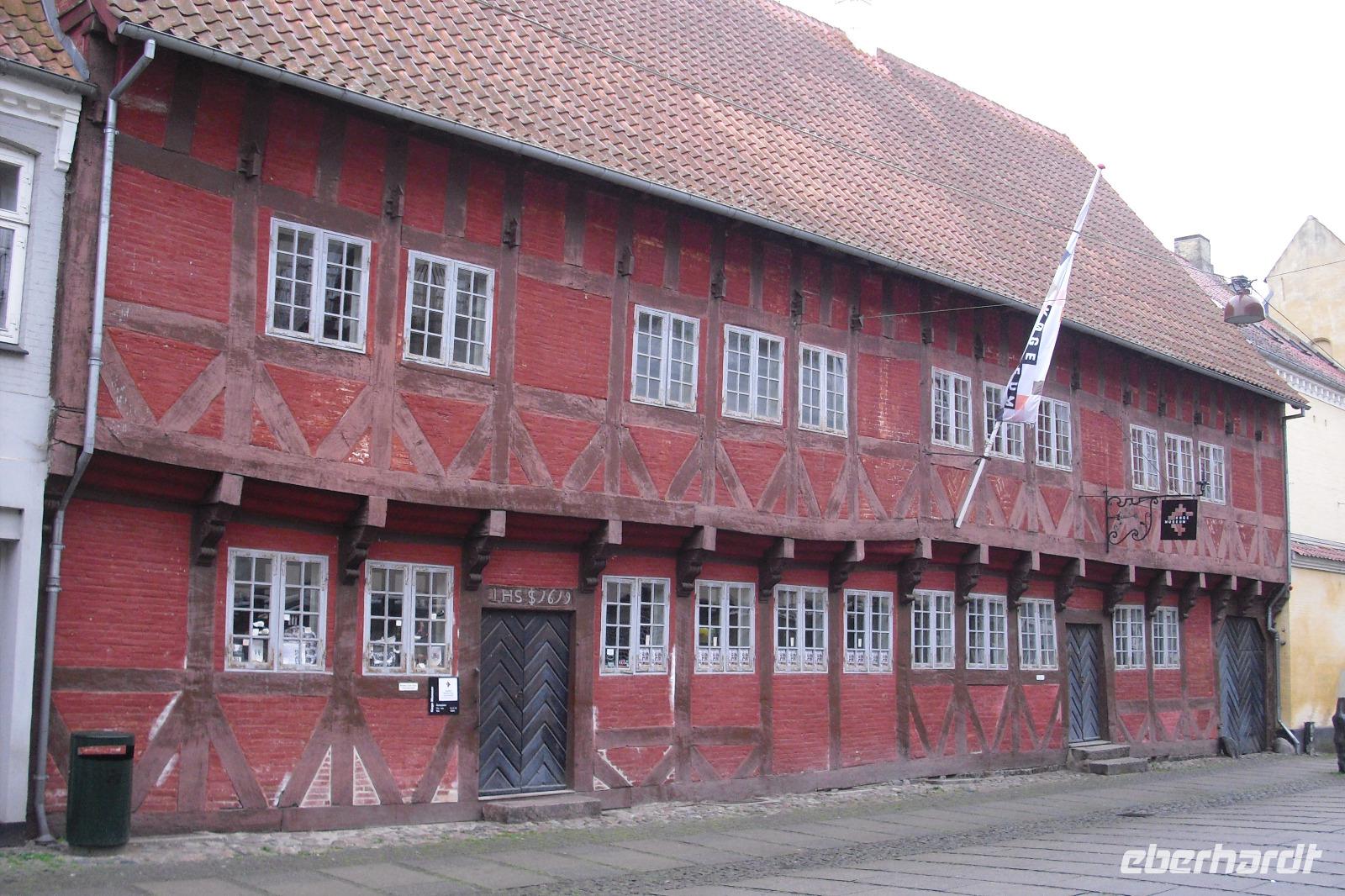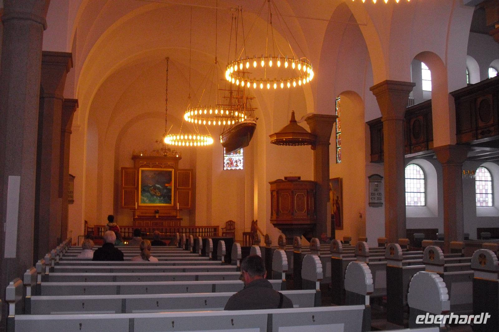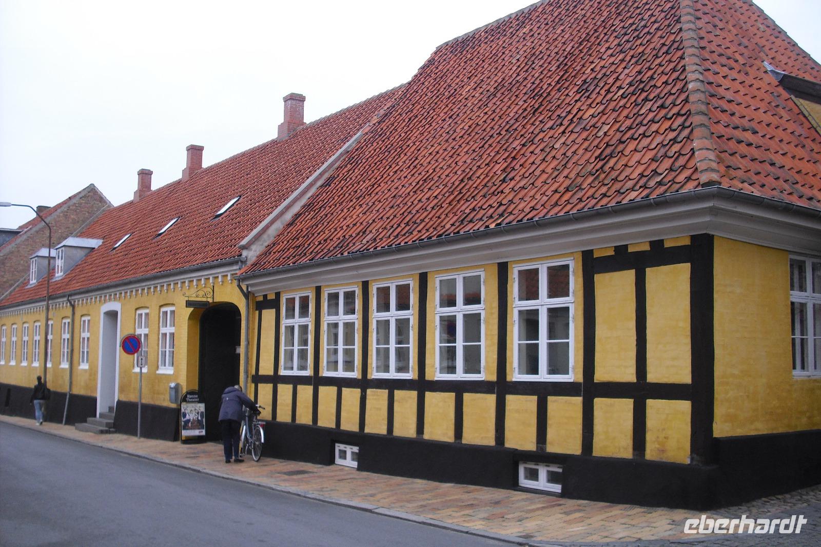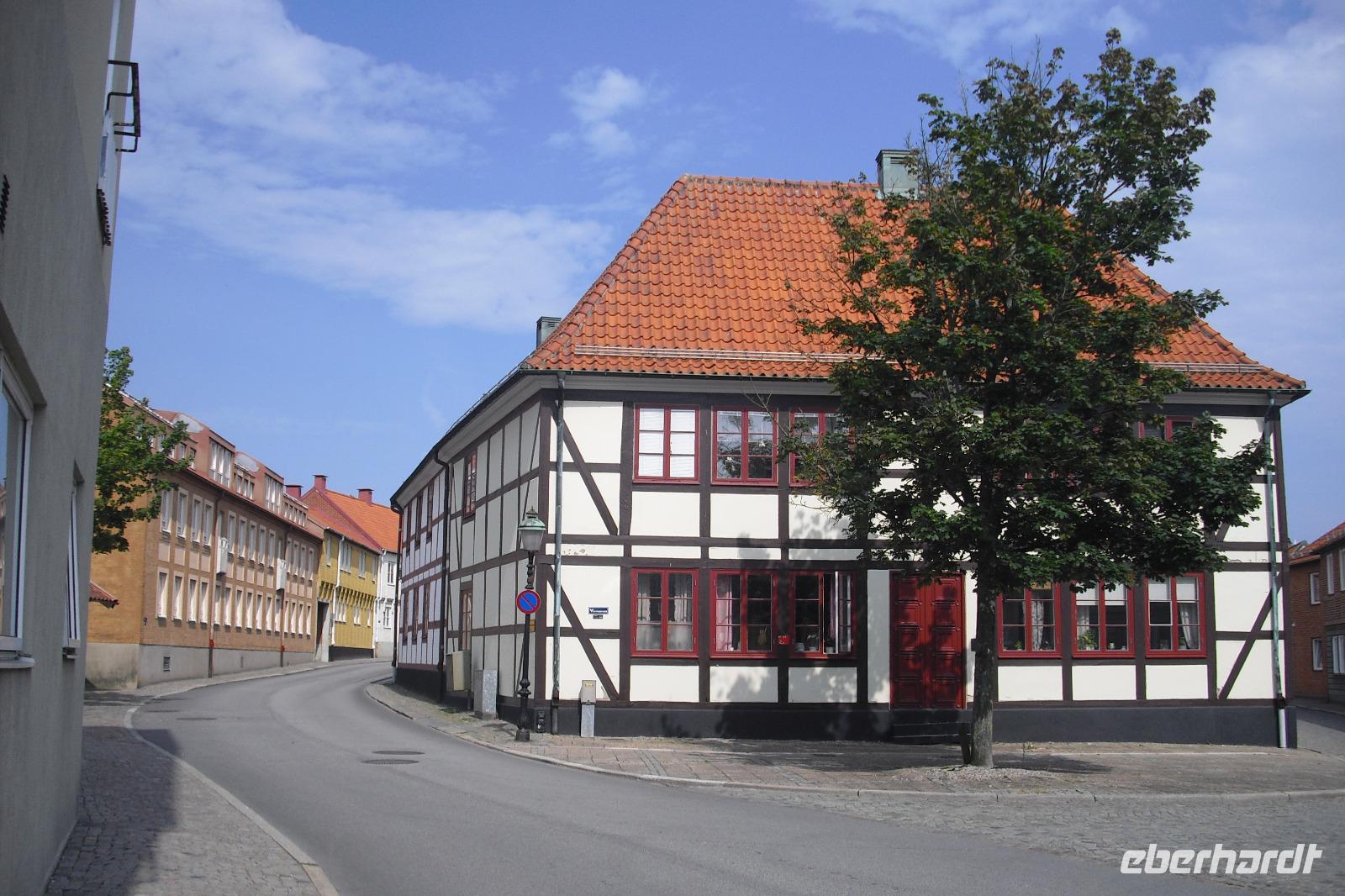 Heute zeigte sich das Wetter von einer anderen Seite, Wind und Regenschauer begleiteten uns abwechselnd. Wir waren gewappnet und fuhren nach dem Frühstück erst einmal nach Svaneke. Es ist die östlichste Stadt Dänemarks und erhielt ihre Stadtprivilegien im Mittelalter. Die alten Häuser bilden wohl das schönste Stadtbild Bornholms und ist nur an wenigen Stellen durch neuere Gebäude gestört. So ist es kein Wunder, daß Svaneke seit 1975 Besitzerin der europäischen Goldmedaille für Stadterhaltung ist. Am Hafen liegen die größten Anwesen, die ursprünglich Kaufleuten gehörten. Sehr viele Fachwerkhäuser mit einer charakterischen Steintreppe davor sind erhalten. Unser nächstes Ziel war die Osterlars Rundkirche, die größte Rundkirche Bornholms. Der Name bezieht sich auf den Heiligen der Kirche St. Laurentius, auf dänisch Lars. Die Kirche liegt etwa 100 m über dem Meer und etwa 3 km davon entfernt. Bornholms Rundkirchen sind als Kirchenburgen erbaut, um als Gotteshäuser und in unruhigen Zeiten als Zufluchtsstätten zu dienen. Wir konnten dieses Bauwerk von innen und außen in aller Ruhe besichtigen. Sicher war für Einzelne das eine oder andere Details von großem Interesse. Auch hier begegnete uns wieder ein Runenstein, wie schon in Växjö. Einen nächsten Halt auf unserer Inselrundfahrt machten wir in Hammershus, der im Nordwesten Bornholms gelegenen größten Burgruine Skandinaviens. Die ältesten Teile der Anlagen stammen mindestens aus der Zeit um 1250. Das Material dieser ältesten Teile sind Feldsteine, bei späteren Um- und Anbauten verwendete man große Backsteine. Noch heute sieht man innerhalb der Anlagen zwei Teiche mit Grundwasser, immerhin 70 m über dem Meeresspiegel, die die Trinkwasserversorgung sicher stellten. Mit der wachsenden Bedeutung von Schusswaffen wurde die Burganlage um 1600 wertlos, aber immer noch als Residenz benutzt. Mit der Schaffung der Befestigung auf Christiansoe (Erbseninsel) war das Schicksal von Hammershus besiegelt - man brauchte Steine von Hammershus. Die Ruinen stehen seit 1822 unter Denkmalsschutz und heute investiert man viel zur Erhaltung der Anlage sowie zur Schaffung eines neuen Besucherzentrums. Wir sahen es in Form von Baustellen. Das Mittagessen nahmen wir in Hasle ein. Hier gibt es noch eine von zehn Fischräuchereien, die über glimmendem Erlenholz bei maximal 80 Grad aus silbernen Fischen das Bornholmer Gold werden lassen. Wir bekamen den geräucherten Bornholmer Hering serviert und konnten unserem Magen um die Mittagszeit etwas ganz Typisches anbieten, lecker. Frisch gestärkt fuhren wir nun nach Roenne, der "Hauptstadt" Bornholms. Hier unternahmen wir einen kleinen Stadtspaziergang und konnten auch noch etwas bummeln.Roenne, die größte Stadt Bornholms mit ca. 15000 Einwohnern, entstand im frühen Mittelalter an einem Naturhafen zwischen zwei Riffen. Der Hafen und damit einhergehend der Handel besonders mit deutschen Kaufleuten aus Greifswald bestimmten die Entwicklung. Es sind noch eine Reihe schöner Stadtteile in Roenne erhalten. Wir bummelten an der Stadtkirche vorbei, der St. Nicolai Kirche, besichtigten die Hausfassaden in der Vimmelskaftet, standen vor dem ältesten privaten Theater Dänemarks und wissen auch, das Roenne im Mai 1945 sehr stark durch russische Bombenangriffe zerstört wurde. Bornholm war von 1940-1945 von deutschen Truppen besetzt und der Kommandant wollte sich nicht ergeben. Heute ist der wesentliche Teil von Industrie und Verkehrsverbindungen in Roenne konzentriert. Nach dem es gelang, uns alle wieder zur Weiterfahrt zu finden setzten wir die Rundfahrt mit einem Fotostopp am Elternhaus von Martin Andersen Nexö fort. Anschließend besuchten wir noch den wunderschönen, wenn nicht wunderschönsten Sandstrand von Dueodde. Es war im Anschluß nur noch ein Katzensprung bis zum Hotel, wo es bald das Abendessen gab.