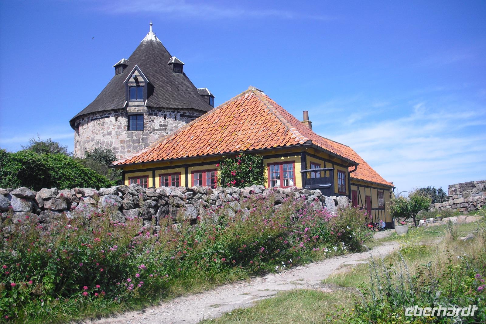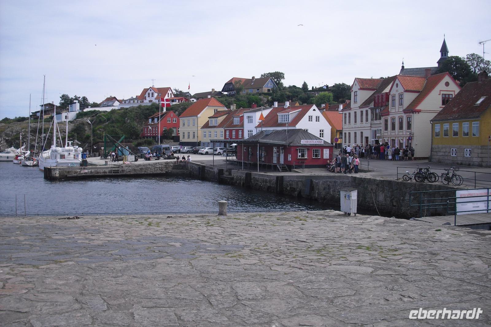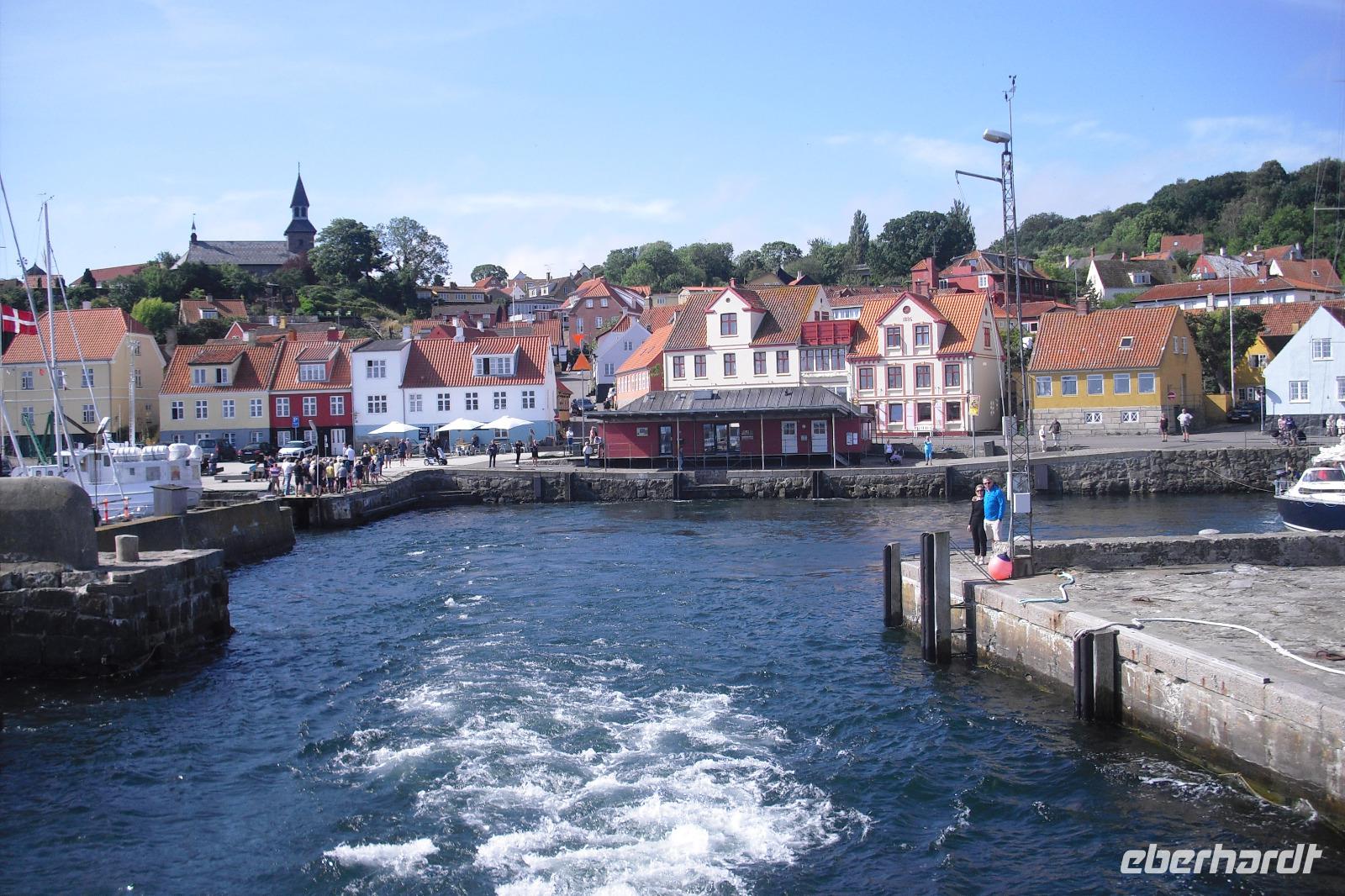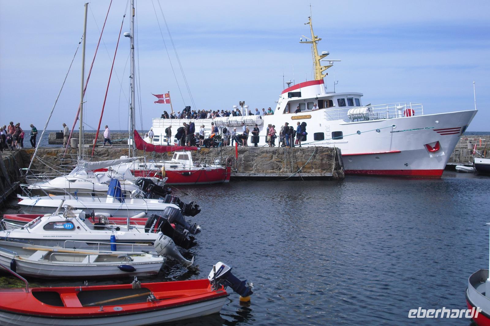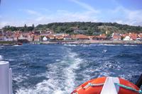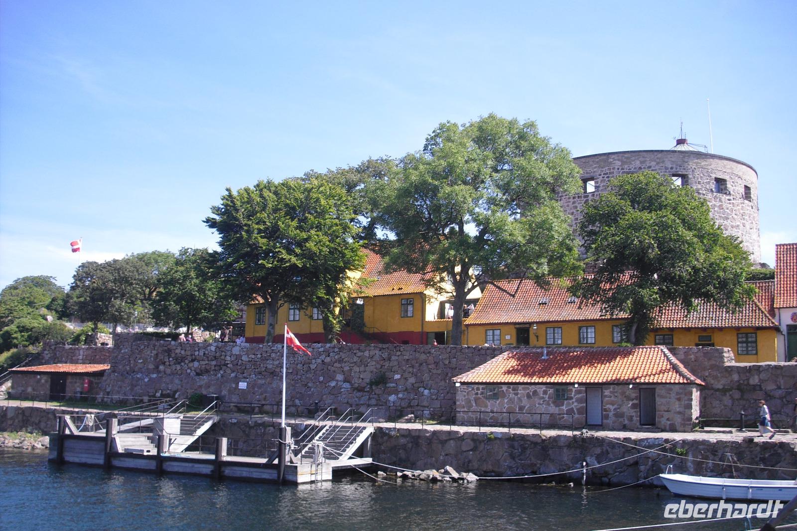 Mit 16 Reisegästen ging es nach dem Frühstück zum Hafen in Gudhjem. Nach 1660, als Dänemark die Provinzen östlich vom Öresund abtreten mußte (außer Bornholm), hatte man sich neue Gedanken zu machen über den Ersatz der verlorengegangenen Festungsanlagen. Bereits 1684 begannen die Arbeiten auf den Inseln, die auch Erbseninseln genannt werden und die östlichsten, bewohnten Inseln Dänemarks sind - Christiansoe und Frederiksoe. Die wollten wir besuchen und legten pünktlich mit dem Schiff in Gudhjem ab. Ein kleiner Chor im Hafen verabschiedete uns, das allerdings konnten nur die Passagiere hören, die auf dem Oberdeck waren. Bei schönstem Wetter und strahlenstem Sonnenschein hatten wir knapp drei Stunden Zeit, die Inseln, die historischen Festungsanlagen kennenzulernen oder aber auch im Restaurant einen Imbiss bzw. einen Kaffee zu genießen. Die Festung wurde 1855 aufgegeben, unterstand stets aber dem Marineministerium - heute dem Verteidigungsministerium von Dänemark. Auf den streng umweltgeschützten Inseln leben heute noch etwa 90 Menschen. Pünktlich vom Boot wieder abgeholt, konnten wir noch durch Gudhjem bummeln und fuhren schließlich in unser Hotel zurück. Hier wartete auf alle wieder das Abendessen.