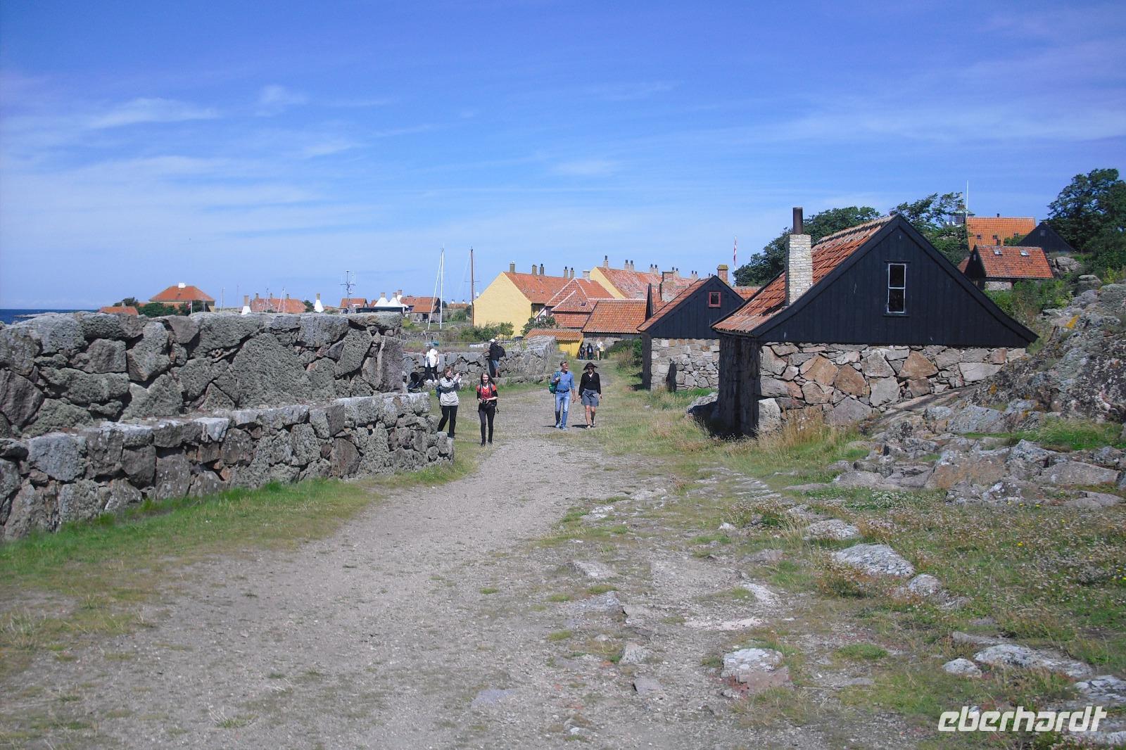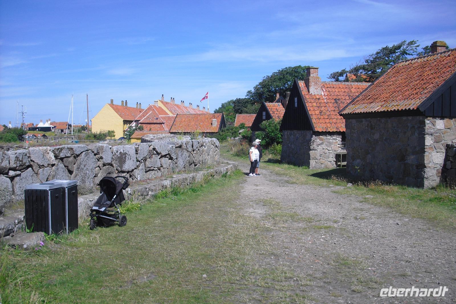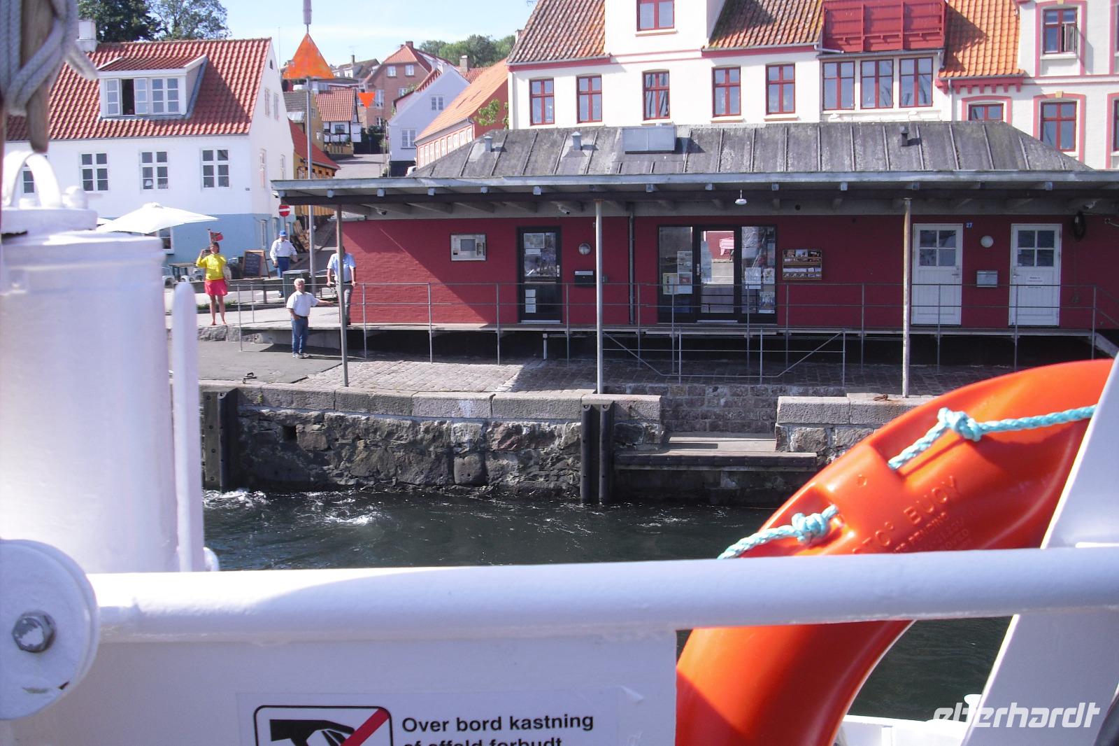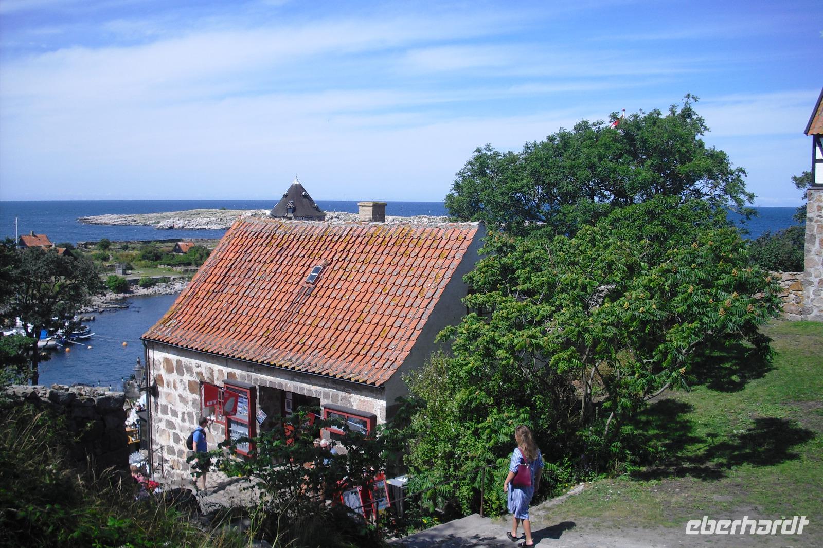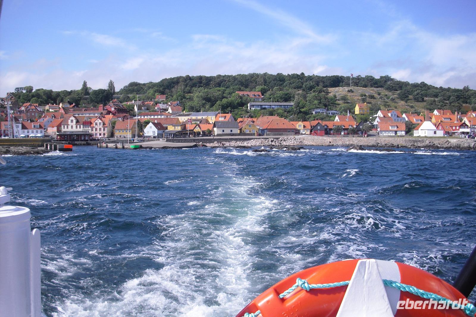 Mit 16 Reisegästen ging es nach dem Frühstück zum Hafen in Gudhjem. Nach 1660, als Dänemark die Provinzen östlich vom Öresund abtreten mußte (außer Bornholm), hatte man sich neue Gedanken zu machen über den Ersatz der verlorengegangenen Festungsanlagen. Bereits 1684 begannen die Arbeiten auf den Inseln, die auch Erbseninseln genannt werden und die östlichsten, bewohnten Inseln Dänemarks sind - Christiansoe und Frederiksoe. Die wollten wir besuchen und legten pünktlich mit dem Schiff in Gudhjem ab. Ein kleiner Chor im Hafen verabschiedete uns, das allerdings konnten nur die Passagiere hören, die auf dem Oberdeck waren. Bei schönstem Wetter und strahlenstem Sonnenschein hatten wir knapp drei Stunden Zeit, die Inseln, die historischen Festungsanlagen kennenzulernen oder aber auch im Restaurant einen Imbiss bzw. einen Kaffee zu genießen. Die Festung wurde 1855 aufgegeben, unterstand stets aber dem Marineministerium - heute dem Verteidigungsministerium von Dänemark. Auf den streng umweltgeschützten Inseln leben heute noch etwa 90 Menschen. Pünktlich vom Boot wieder abgeholt, konnten wir noch durch Gudhjem bummeln und fuhren schließlich in unser Hotel zurück. Hier wartete auf alle wieder das Abendessen.
