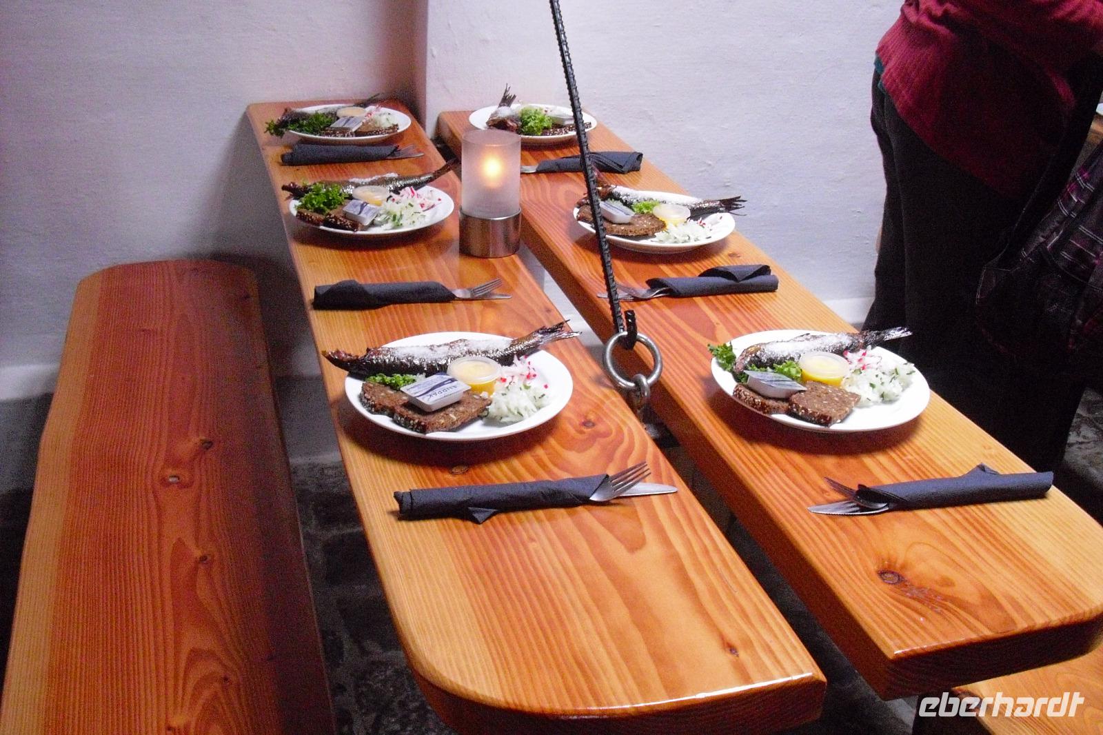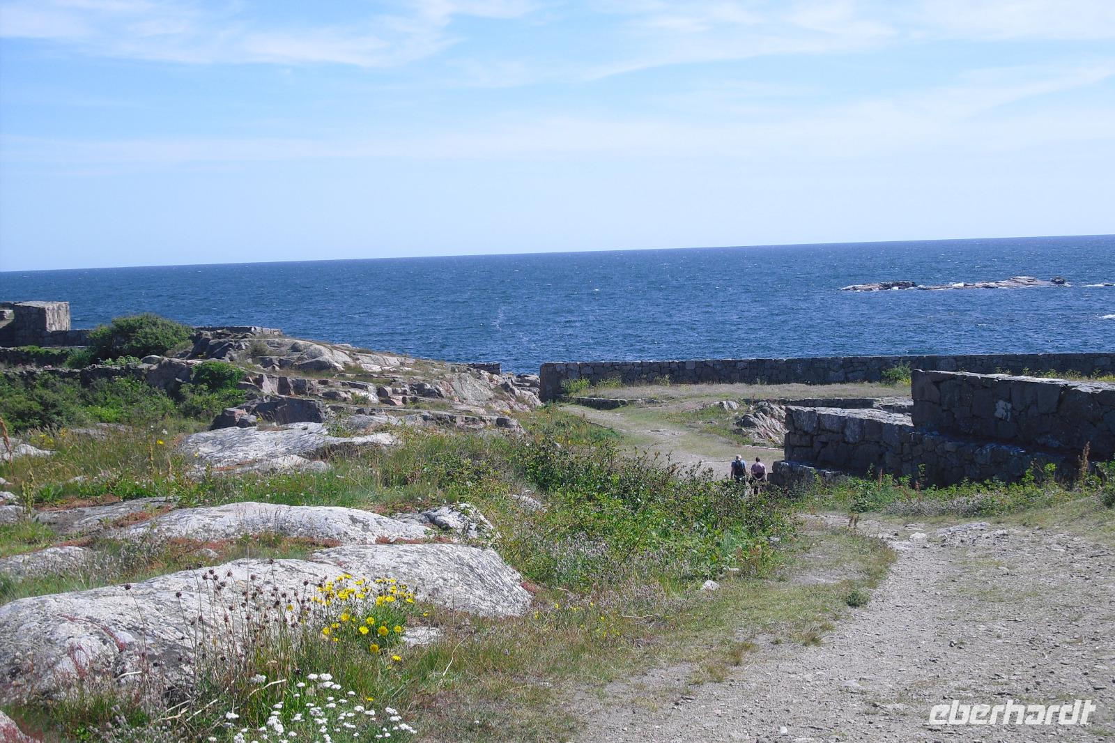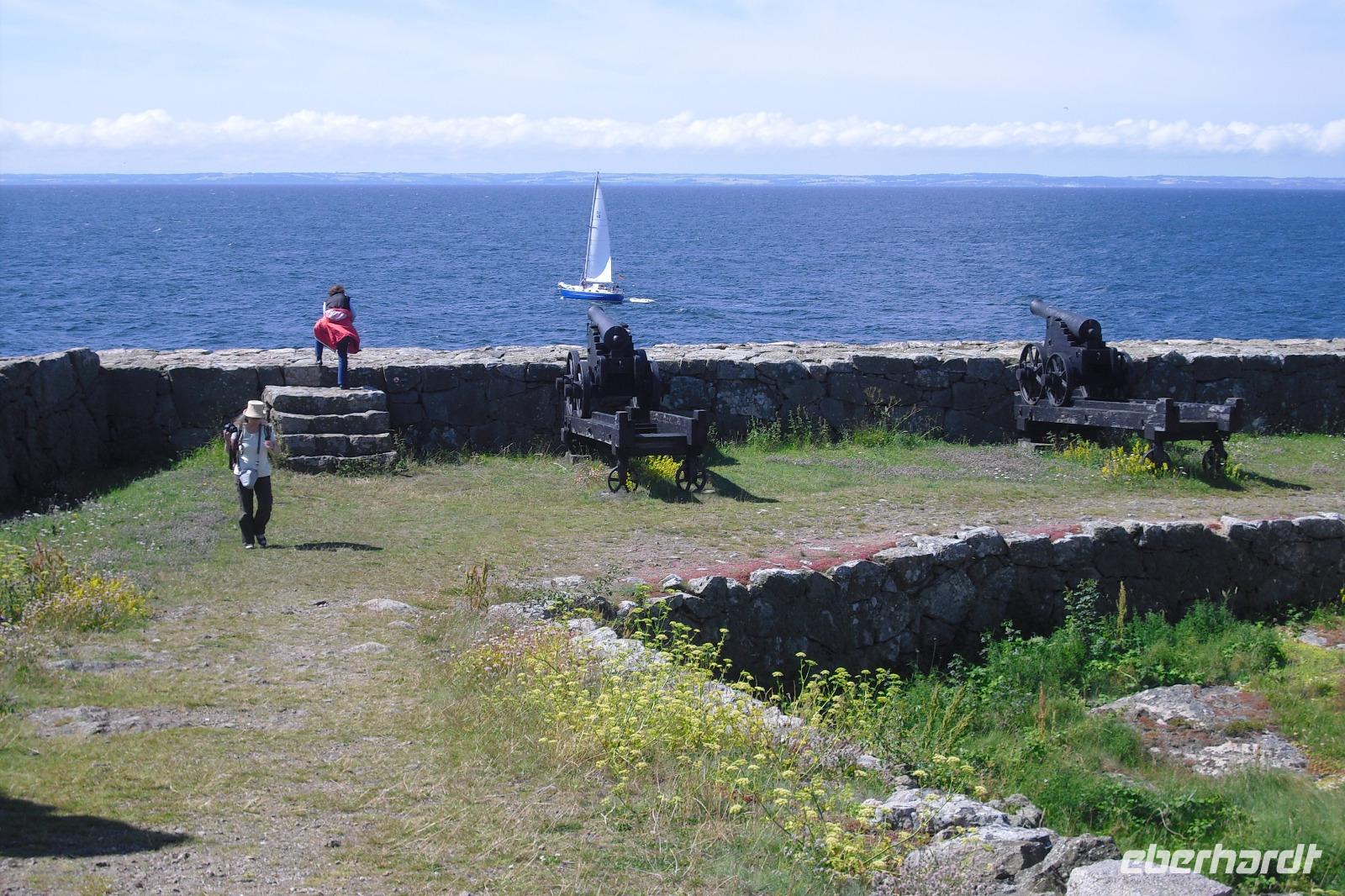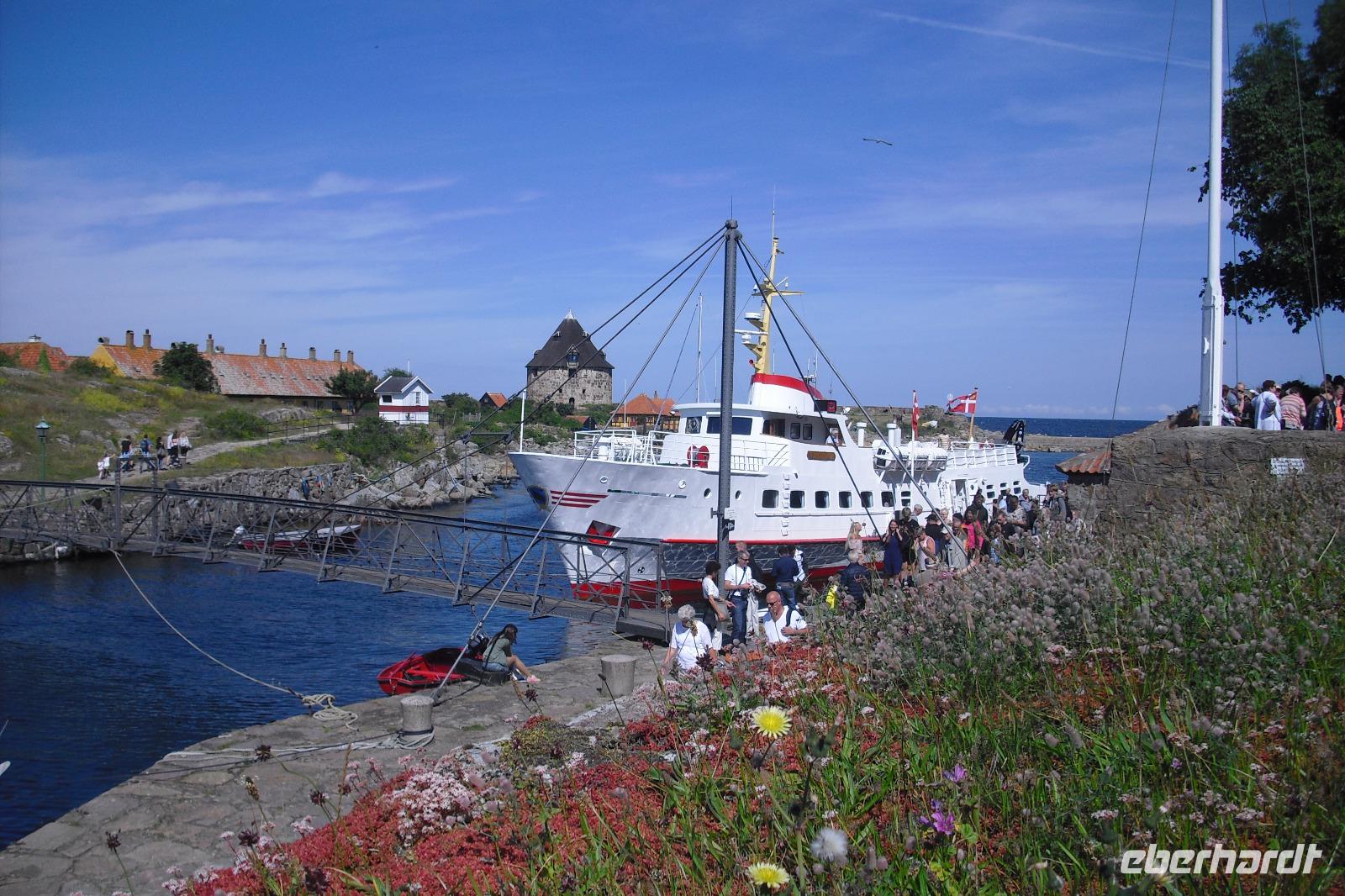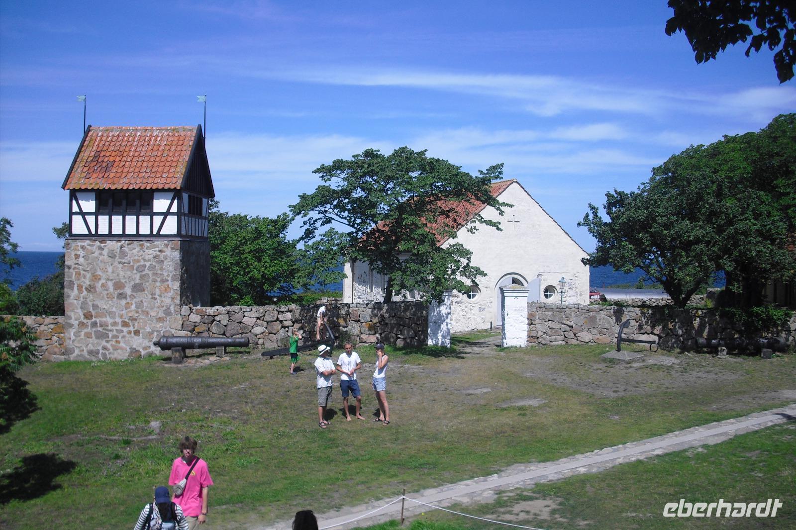 Mit 16 Reisegästen ging es nach dem Frühstück zum Hafen in Gudhjem. Nach 1660, als Dänemark die Provinzen östlich vom Öresund abtreten mußte (außer Bornholm), hatte man sich neue Gedanken zu machen über den Ersatz der verlorengegangenen Festungsanlagen. Bereits 1684 begannen die Arbeiten auf den Inseln, die auch Erbseninseln genannt werden und die östlichsten, bewohnten Inseln Dänemarks sind - Christiansoe und Frederiksoe. Die wollten wir besuchen und legten pünktlich mit dem Schiff in Gudhjem ab. Ein kleiner Chor im Hafen verabschiedete uns, das allerdings konnten nur die Passagiere hören, die auf dem Oberdeck waren. Bei schönstem Wetter und strahlenstem Sonnenschein hatten wir knapp drei Stunden Zeit, die Inseln, die historischen Festungsanlagen kennenzulernen oder aber auch im Restaurant einen Imbiss bzw. einen Kaffee zu genießen. Die Festung wurde 1855 aufgegeben, unterstand stets aber dem Marineministerium - heute dem Verteidigungsministerium von Dänemark. Auf den streng umweltgeschützten Inseln leben heute noch etwa 90 Menschen. Pünktlich vom Boot wieder abgeholt, konnten wir noch durch Gudhjem bummeln und fuhren schließlich in unser Hotel zurück. Hier wartete auf alle wieder das Abendessen.