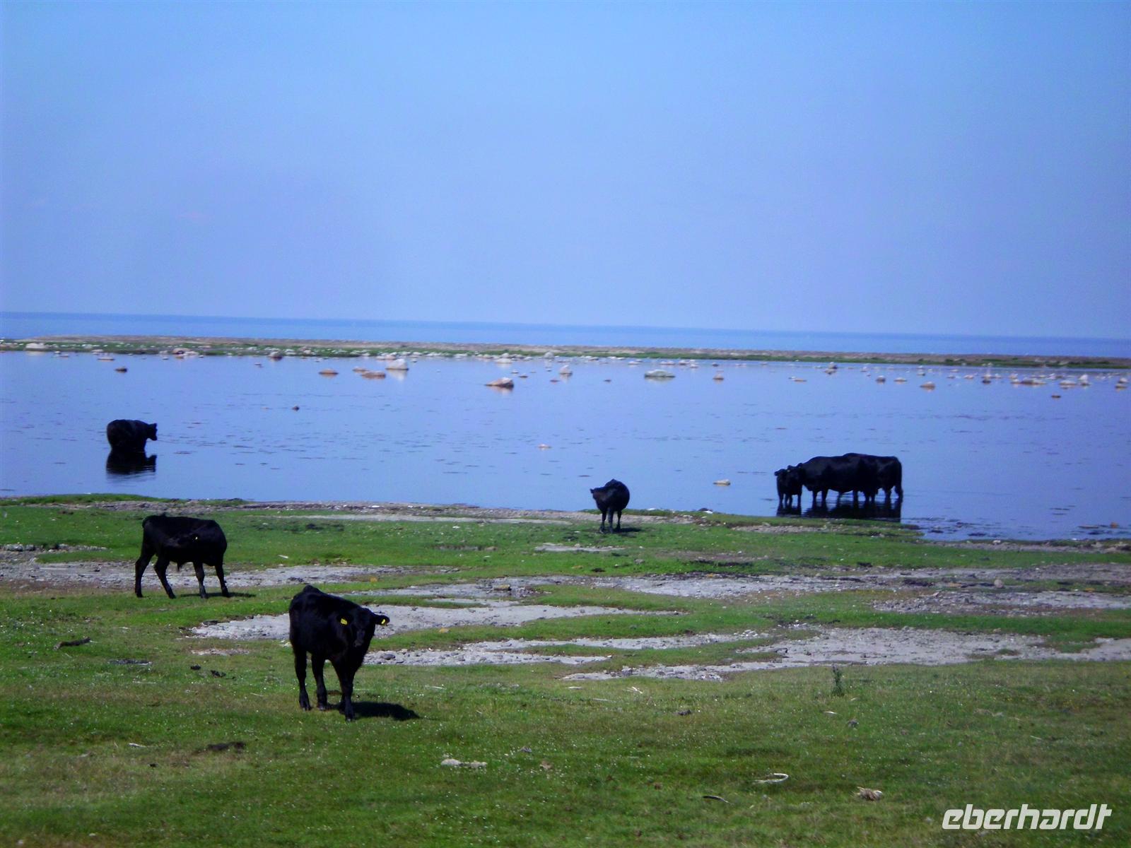 Kalkgestein, bis zum südlichsten Zipfel der Insel, wo der große Leuchtturm den Schiffern immer noch den Weg weißt. Viele Vogelfreunde beobachten intensiv die besonderen Vögel der Insel und wir freuen uns über die Kühe, die bei der Hitze ein Bad in der Ostsee nehmen.