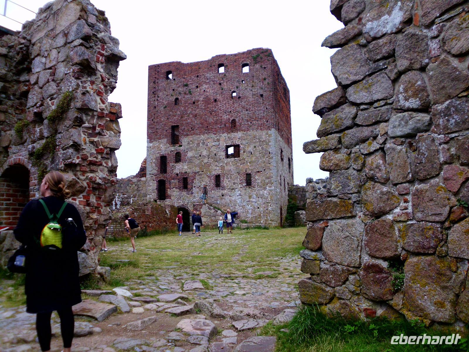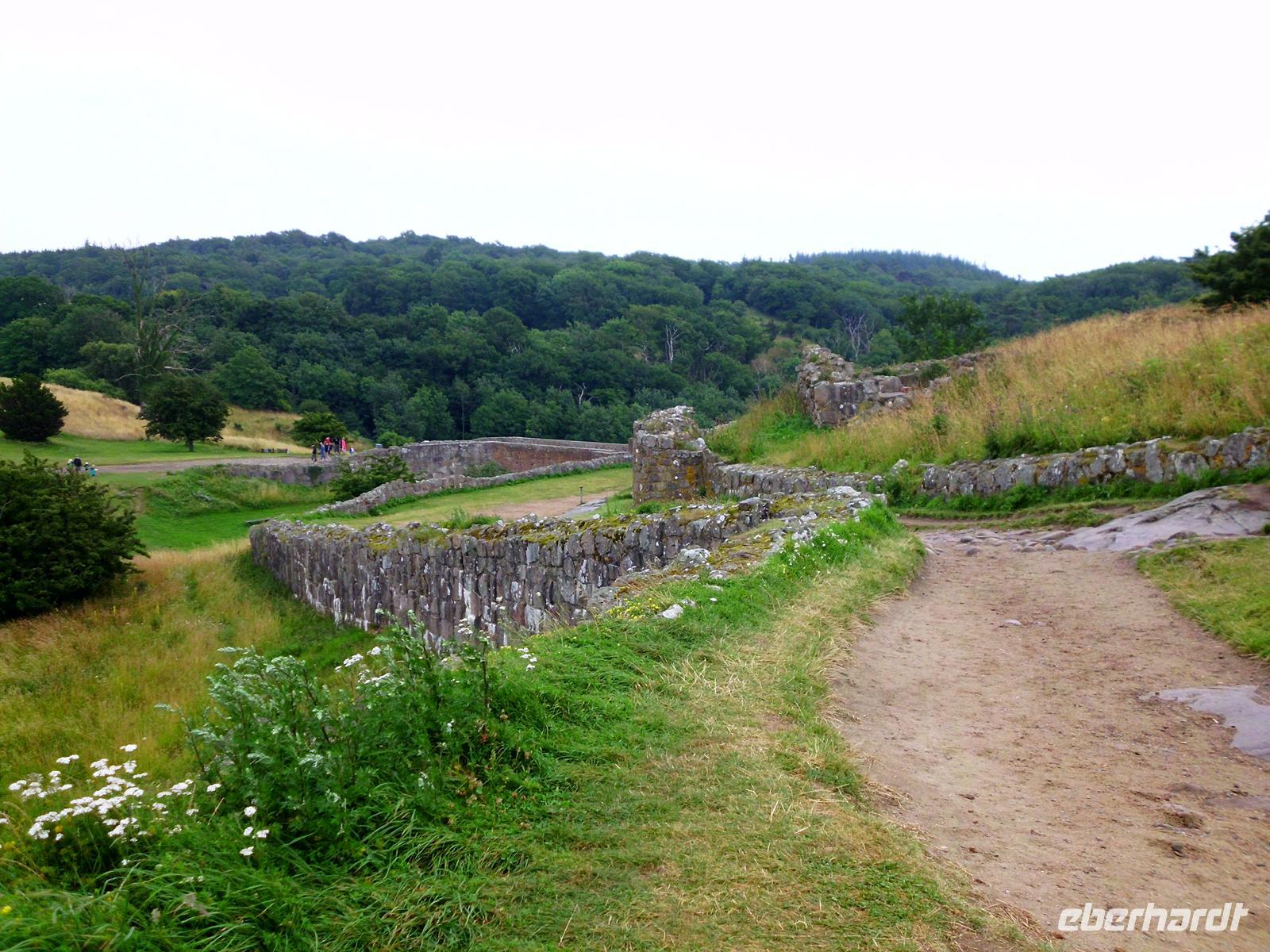 Steilküste prägt vor allem die Gegend zwischen Hasle und Hammerhus. Das wollten wir uns dann bei einer kleinen Wanderung zu Jons Kapel ganz genau anschauen. Leider fing es nun zum 1. Mal auf unserer Reise an zu regnen und so haben wir auf denca.100- Stufen Abstieg bis zum Meer verzichtet und uns mit der Aussicht von oben zufrieden gegeben. Anschließend war es nicht weit bis zur riesigen Festungsruine „Hammerhus“. Zum Glück hatte der Regen aufgehört und wir konnten alles bei einem ausgiebigen Rundgang erkunden und auch die verschiedenen Aussichtspunkte waren lohnenswert.