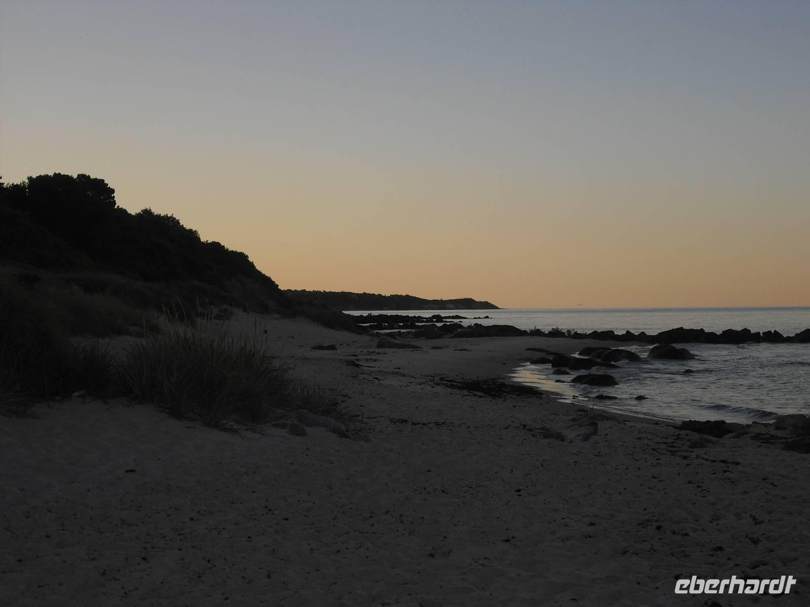 Ein landschaftliches Meisterstück hat die Natur auf Bornholm - auch Perle der Ostsee genannt - ohnehin abgeliefert und einen Teil davon haben wir uns vor dem Heringsimbiss in Hasle noch mit der engen Kluft bei Jons Kapel angesehen. Und das letzte beeindruckende Tageserlebnis war dann nach dem Besuch der Osterlars Kirke der wunderschöne Strand von Dueodde. Grund genug, den Tag wieder mit einem Schluck Sekt abzurunden, zu dem der Reiseleiter einlud. Nach dem Abendessen gingen noch einmal einige Reisegäste zum Strand. Der Sonnenuntergang war für 21.21 Uhr angekündigt.