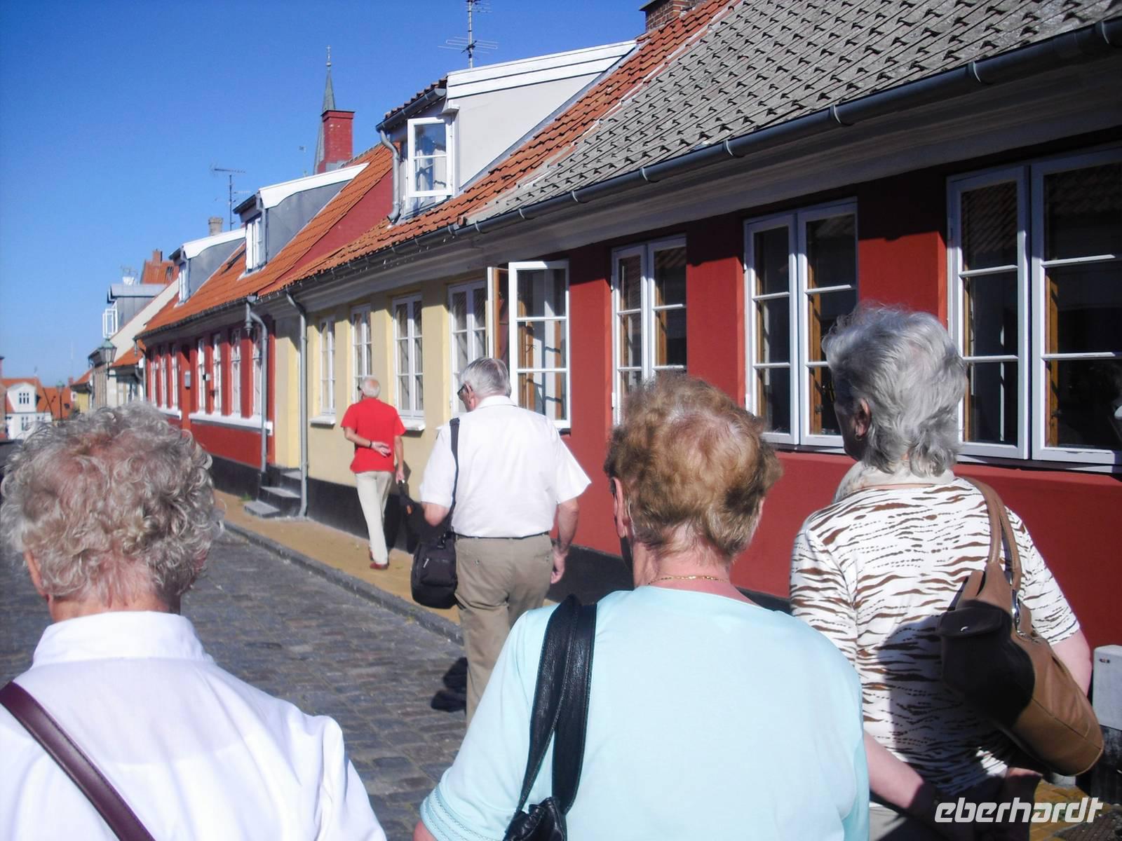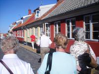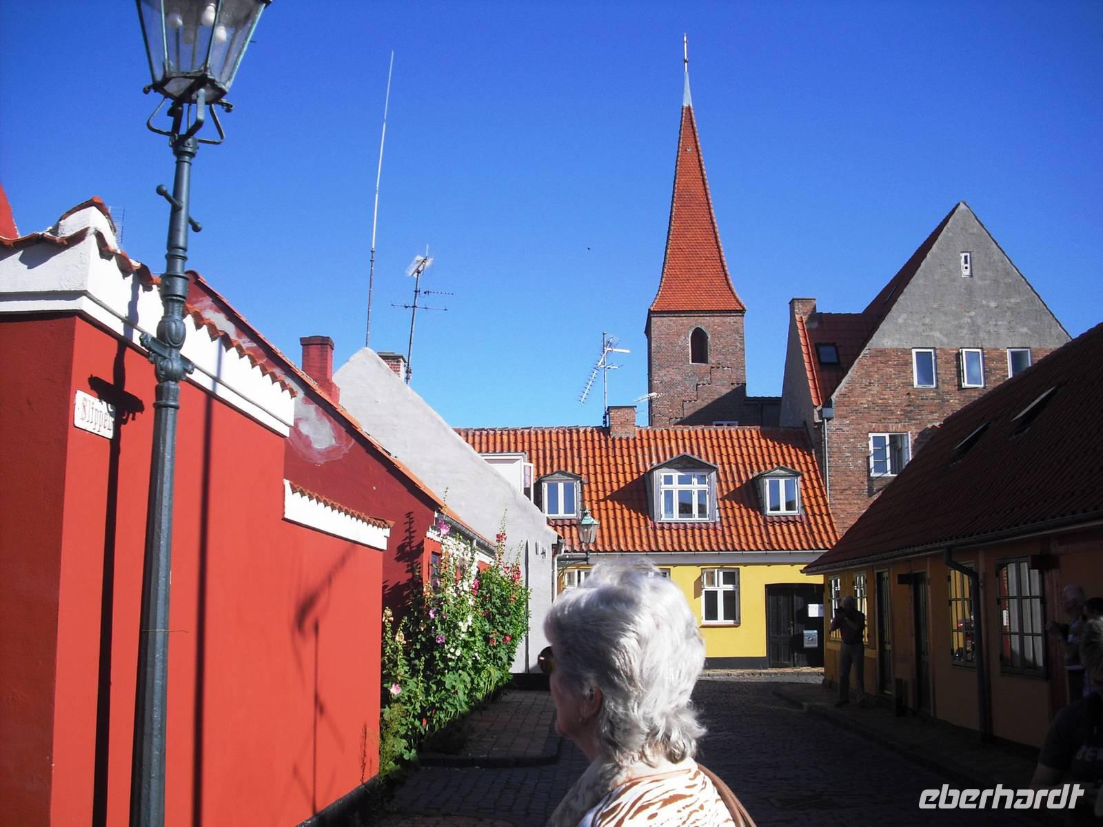 Ein letztes Frühstück auf Bornholm und nach der Gepäckverladung fuhren wir nach Ronne. Hier, im Hauptort von Bornholm, unternahmen wir noch einen kleinen Sonntagsmorgenspaziergang. Die Stadt ist im 13. Jh. an einem Naturhafen zwischen zwei Riffen entstanden. Man lebte recht gut vom Handel, besonders auch von dem mit deutschen Kaufleuten aus Greifswald. Die Kirche ist 1915 - 1918 erbaut worden, nur in der nordöstlichen Ecke ist romanisches Mauerwerk erhalten. Die jetzige Kirche nimmt also den Platz einer Vorgängerin ein. Ein schöner Stadtteil mit Gebäuden um 1800 liegt um die gewundene Strasse Vimmelskaftet und auch das 1823 erbaute Theater liegt in der Nähe. Es ist das älteste private Theater Dänemarks und pflegt die sogenannte Bornholmer Mundart.