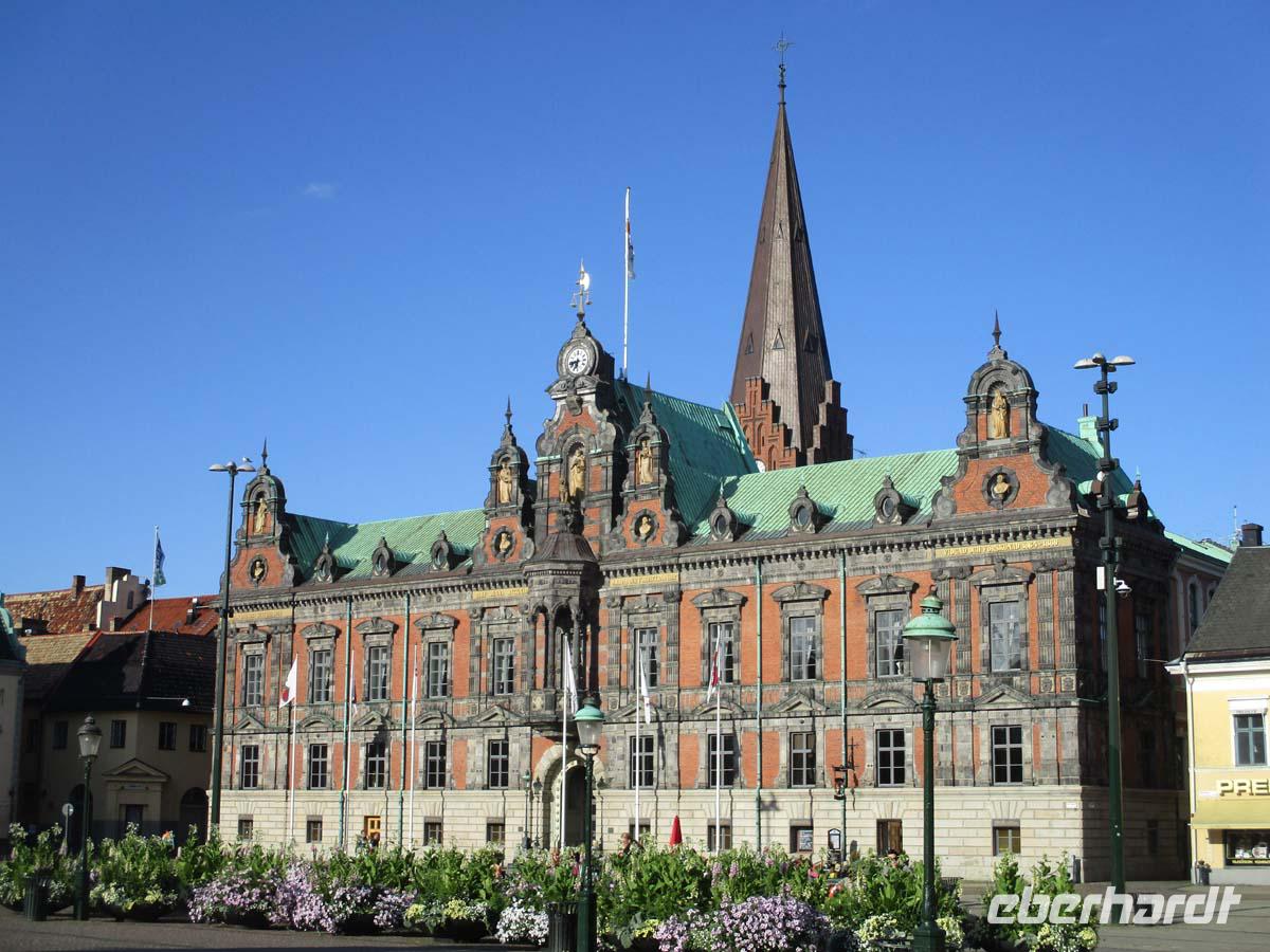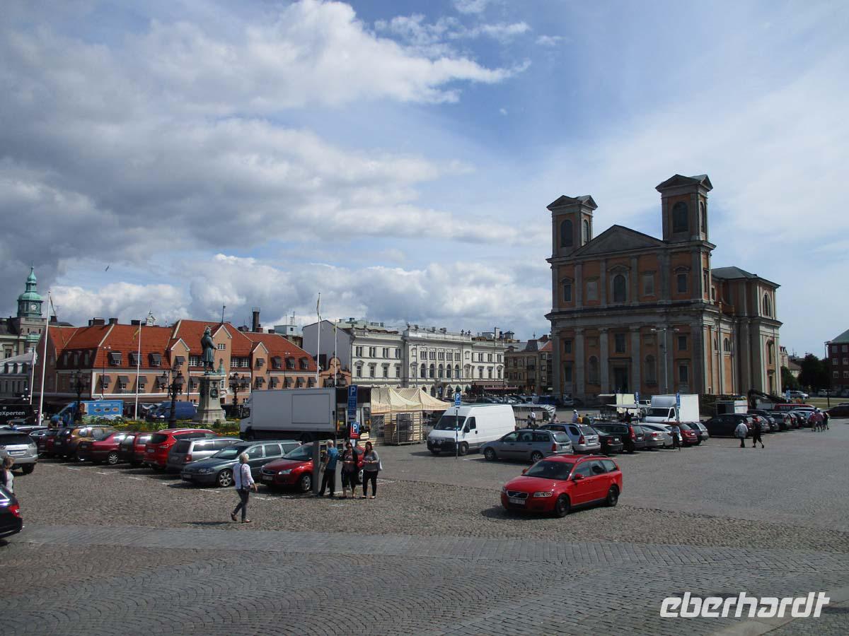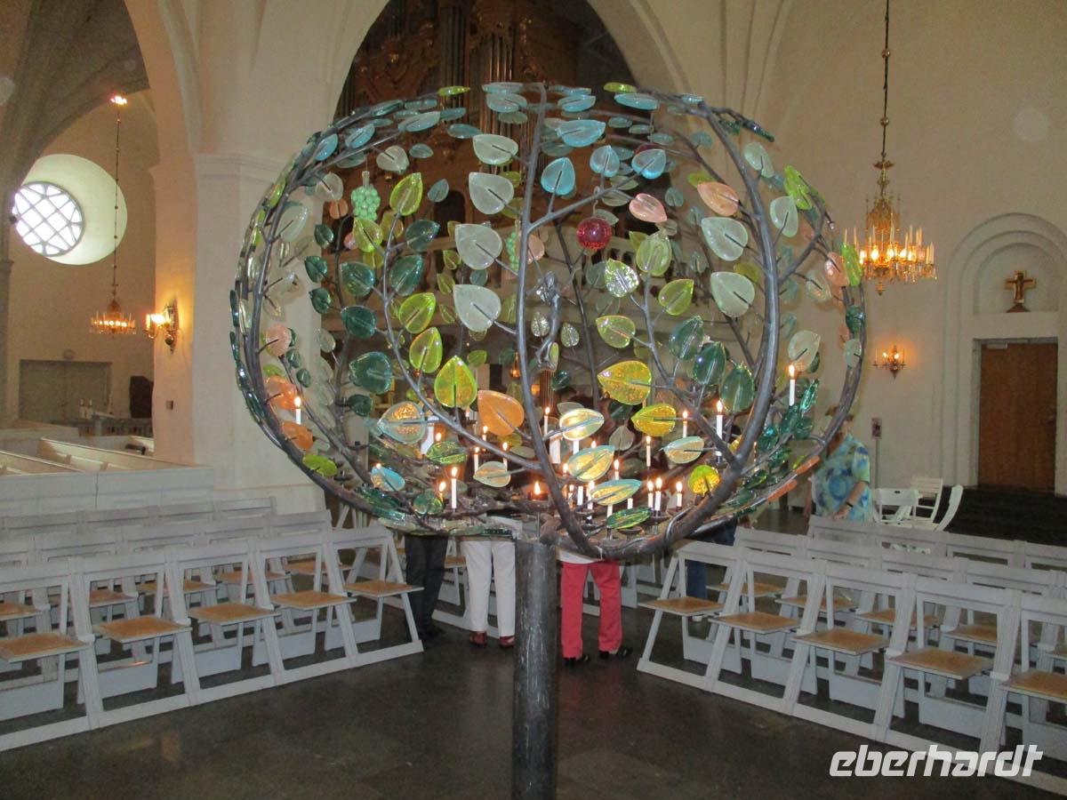 Auch Växjo, die alte Stadt verfügt über einen stattlichen Dom. Dieser ist jedoch nicht romanisch, sondern eine spätgotische dreischiffige Hallenkirche, Das wir uns inmitten des smoländischen Glasreiches befinden, in dem vor 300 Jahren über 100 Glashütten existierten, das merkt man spätestens in dem Bauwerk. Von zeitgenössischen Künstlern sind hier das Taufbecken, Fenster, Elementes des Altaraufsatzes, und verschiedenes mehr gestaltet worden, Am meisten hat es uns aber der Baum der Erkenntnis angetan, dessen Blätter sämtlich aus Glas sind, in dem gläserne Trauben und Äpfel hängen; und wer genau hinschaut, kann auch Adam und Eva entdecken.Nun aber begeben wir uns nun nach Kalmar, und beziehen direkt am Marktplatz unser Hotel in dieser geschichtsträchtigen Stadt.