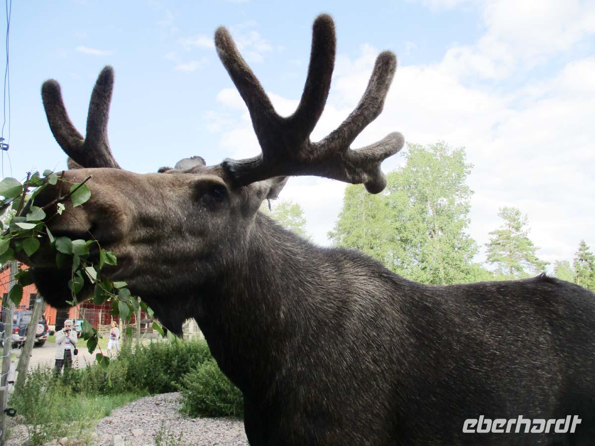 Unsere nächste Station beschäftigt sich mit dem berühmtesten Tier Skandinaviens, dem Elch. Im Elchpark Gronäsen sehen wir diese riesigen Tieren, erfahren sie in artgerechten Freilandhaltungen und können einen vierjährigen Bullen, angelockt mit frischen Grün sogar streicheln. Der Bast an seinen noch sehr neuen Geweih fühlt sich superweich, fast wie Watte an. Wie friedlich und trotzdem erhaben er doch wirkt....