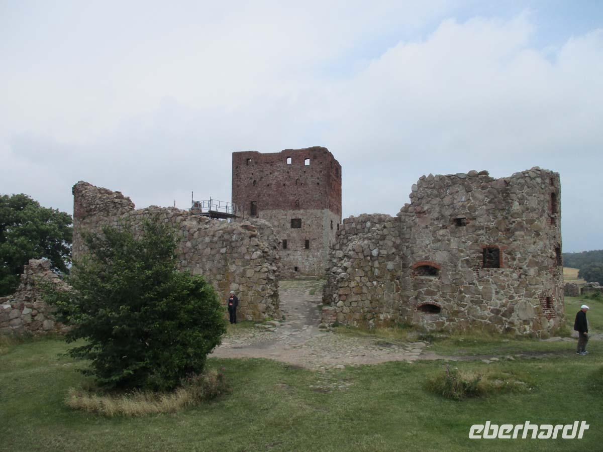 Auch die Burg Hammerhus lassen wir uns nicht entgehen. Es handelt sich um eine der mächtigsten mittelalterlichen Burganlagen Skandinaviens. Seit dem 17. Jh. als Steinbruch benutzt macht sie auf dem 74 m hohen Felsen über dem Meer immer noch einen gewaltigen Eindruck mit ihrer 750 m langen Ringmauer um den äußeren Burghof.