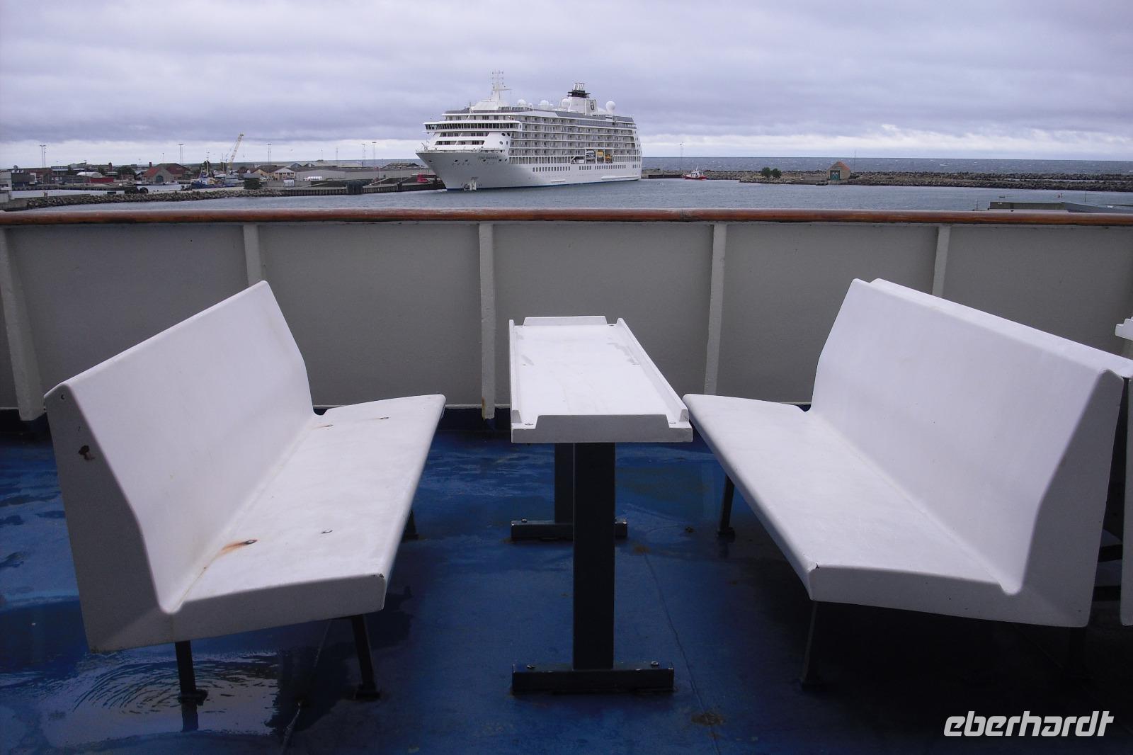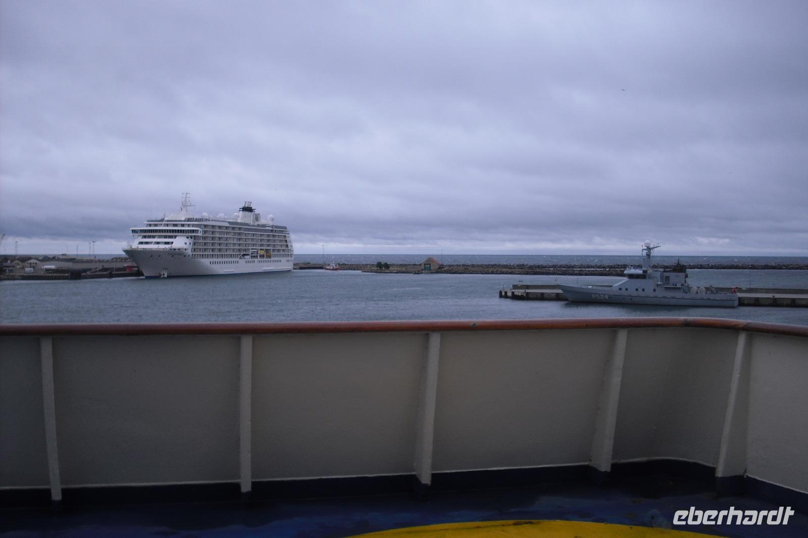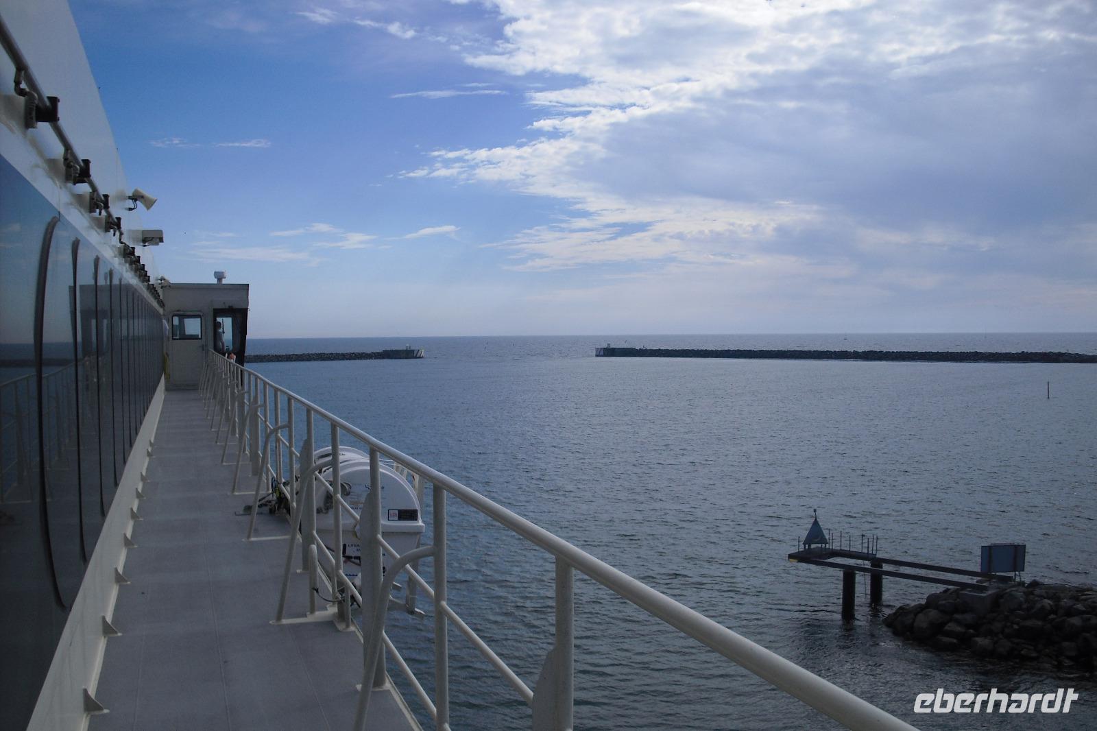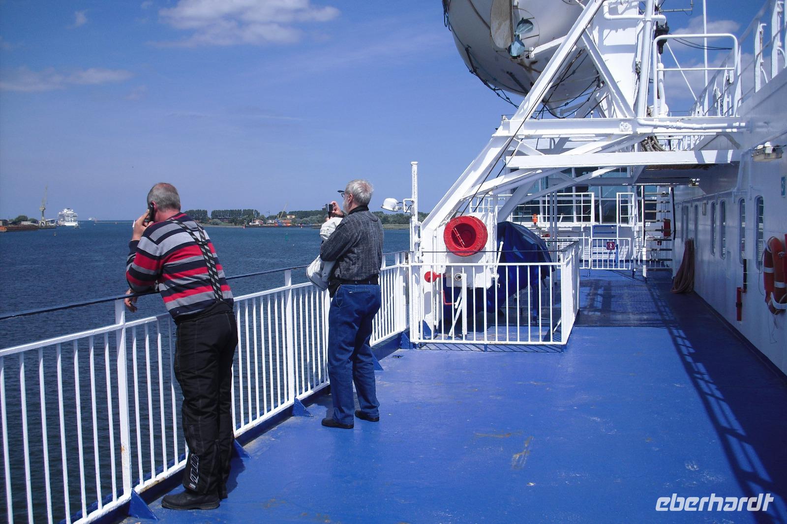 Da die Fährgesellschaft einen festen Zeitplan hat, mussten wir uns dem mit der Zeit zum Frühstück anpassen. Pünktlich kamen wir zur Fähre, überpünktlich legte sie ab und pünktlich landeten wir in Sassnitz auf Rügen. Mit entsprechenden Pausen erreichten die ersten Gäste pünktlich und nach kleinen Verzögerungen auch die letzten Gäste die Ausstiegsstellen.