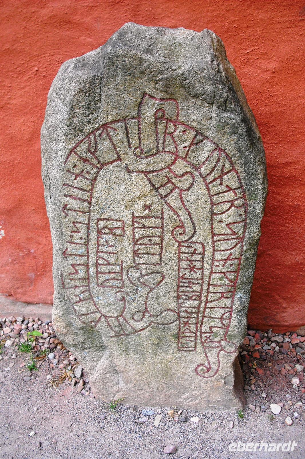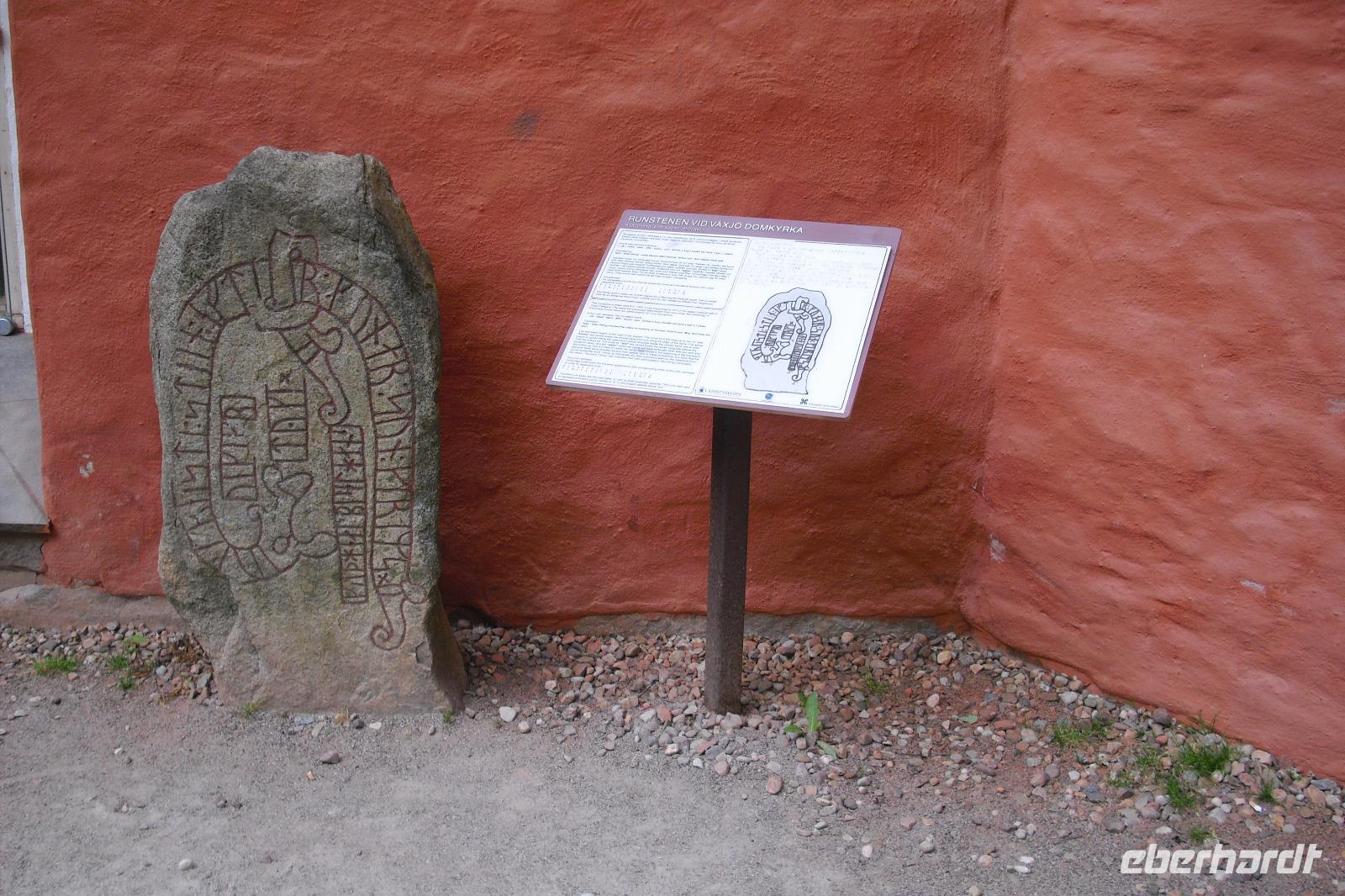 wurden solche Steine ab der Völkerwanderungszeit sowie in der Wikingerzeit (9.Jh.) primär zur Erinnerung an Verstorbene oder Gefallene, aber auch als Denkmäler eigener Leistungen. Dabei wurden Inschriften und/oder Bilder eingemeißelt und oft mittels Farbe hervorgehoben. Wir standen vor dem stattlichen Runenstein am Dom zu Växjö.