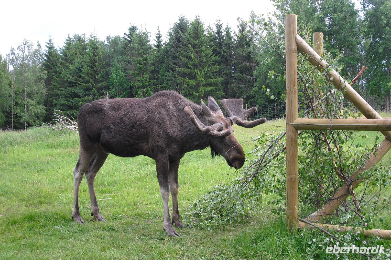 Der späte Nachmittag war vorgesehen zum Besuch Gronasen Elchparkes. Endlich wollten wir in Natura sehen, was uns bisher noch nicht begegnete - einen Elch. Wir trafen nicht nur einen Elch, gleich mehrere hatten Appetit und wurden beim Fressen(Äsen) angetroffen. Stattlich, stattlich so ein Tier. Bequem konnten wir durch die Parkanlage spazieren, später im Elch-Shop noch einige Dinge für die Lieben zu Hause erwerben und dann haben wir uns eine Elchwurst gegrillt. Ganz, ganz lecker!