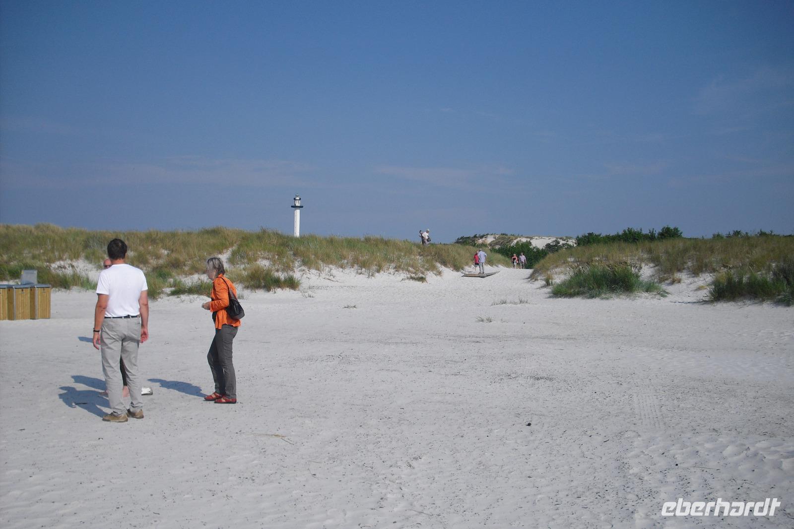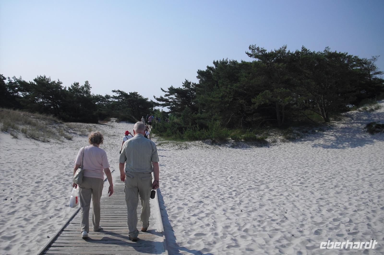 Es wurde früh hell. Manche wachten deshalb auch ohne Aufstehhilfe früh auf. Wie auch immer, nach dem Frühstück war für Interessenten ein Bad am schönsten Strand von Bornholm, von Dänemark, ja von Europa angesagt. Und es machten schon mehr als gedacht mit. Es war aber auch eine natürliche und sehr ruhige Atmosphäre am schönsten Strand- erst später wurde es turbulent. Da waren wir bereits in Svaneke, die östlichste Stadt Dänemarks mit ca. 1200 Einwohnern. Hier hatten auch die Läden auf und die Sonne meinte es gut mit uns und Aktivitäten um die Mittagszeit wurden in Svaneke vorbereitet, so das Hühnerscheißen. Ein Huhn wird auf einem aufgezeichneten Feld mit Zahlen ausgesetzt und man wettet, auf welches Nummernfeld das Huhn scheißt. Viele wollten es nicht glauben als der Reiseleiter den Programmpunkt aus dem Bornholmer Aktivitätenkalender vorstellte, in Svaneke waren alle mit der Realität konfrontiert. Und bei der Wette nur 10 DKK pro Zahl!