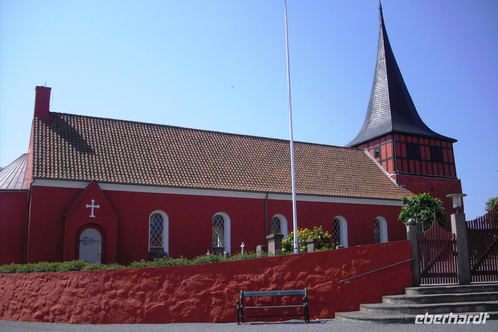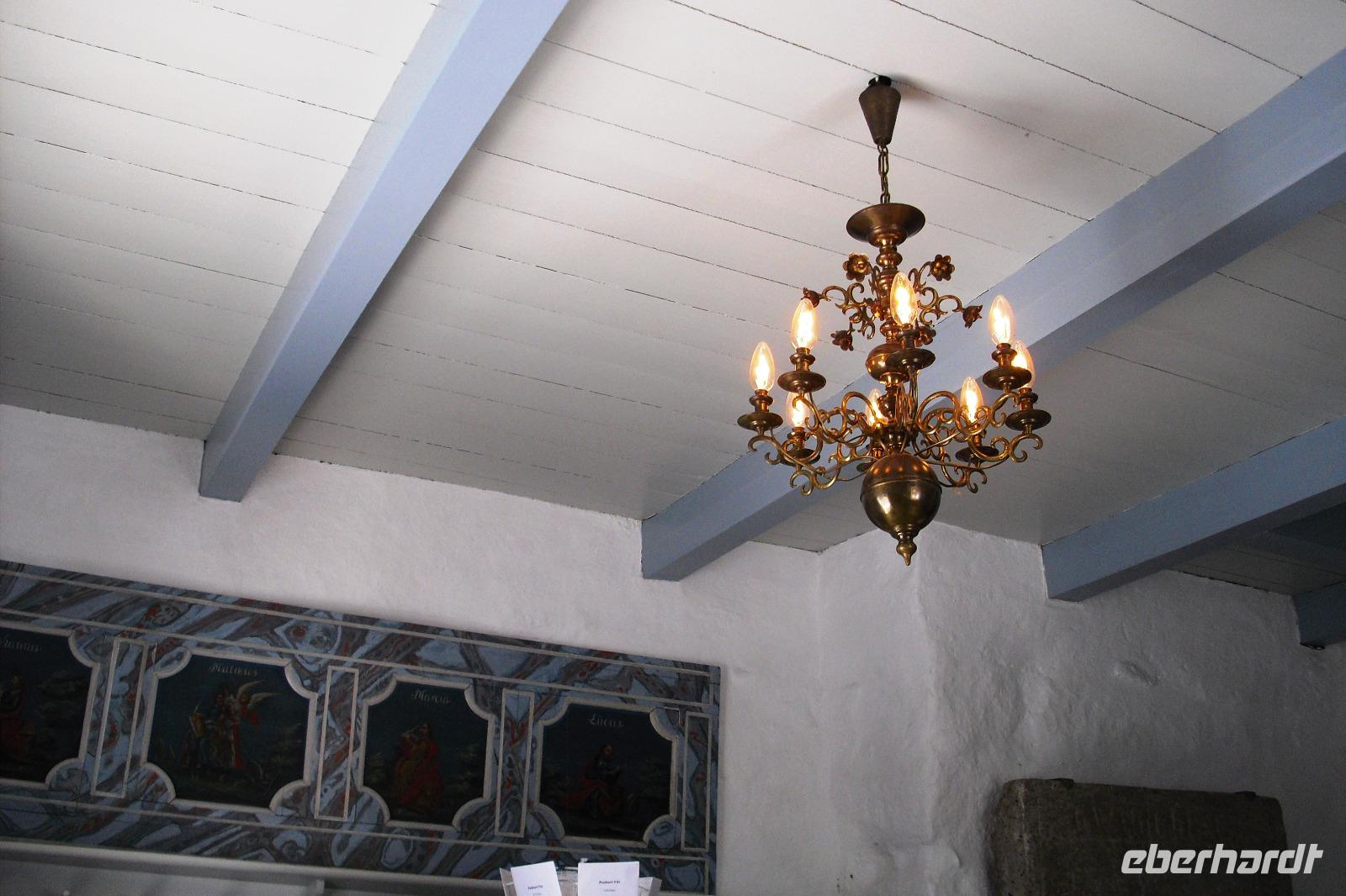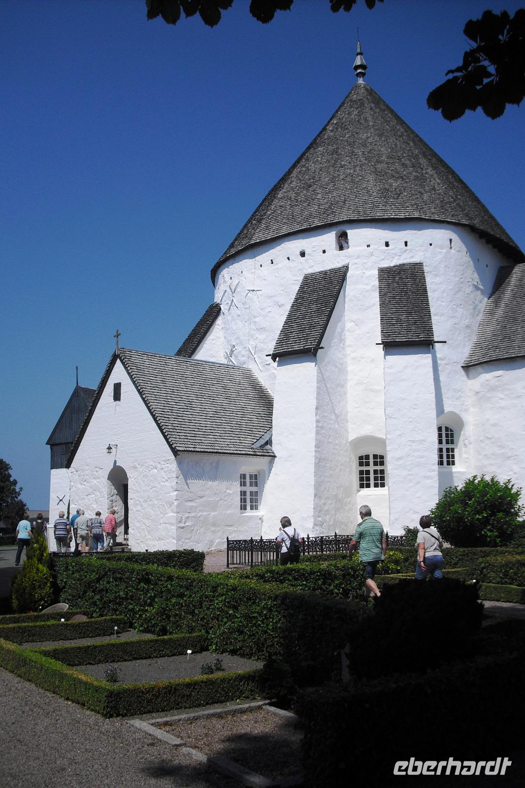 Von banalen aber lustigen Gegebenheiten in Svaneke fuhren wir jetzt zur größten Rundkirche Bornholms, der Osterlars Rundkirche. Der Name bezieht sich auf den Heiligen dieser Kirche, St. Laurentius. Schiff, Chor und Apsis stammen alle aus der Zeit um 1150 mit späteren Anbauten. Als Material setzte man Feldsteine ein, aber für die Tür- und Fensterverkleidungen einen dunklen Kalkstein. An vielen Stellen der Wände und Decken sind Fresken gewesen, aber nur am Mittelpfeiler hat man sie 1892 freilegen und restaurieren können. In der Vorhalle steht ein Runenstein, wir kannten einen solchen ja bereits aus Växjö, und die Entzifferung bedeutet: