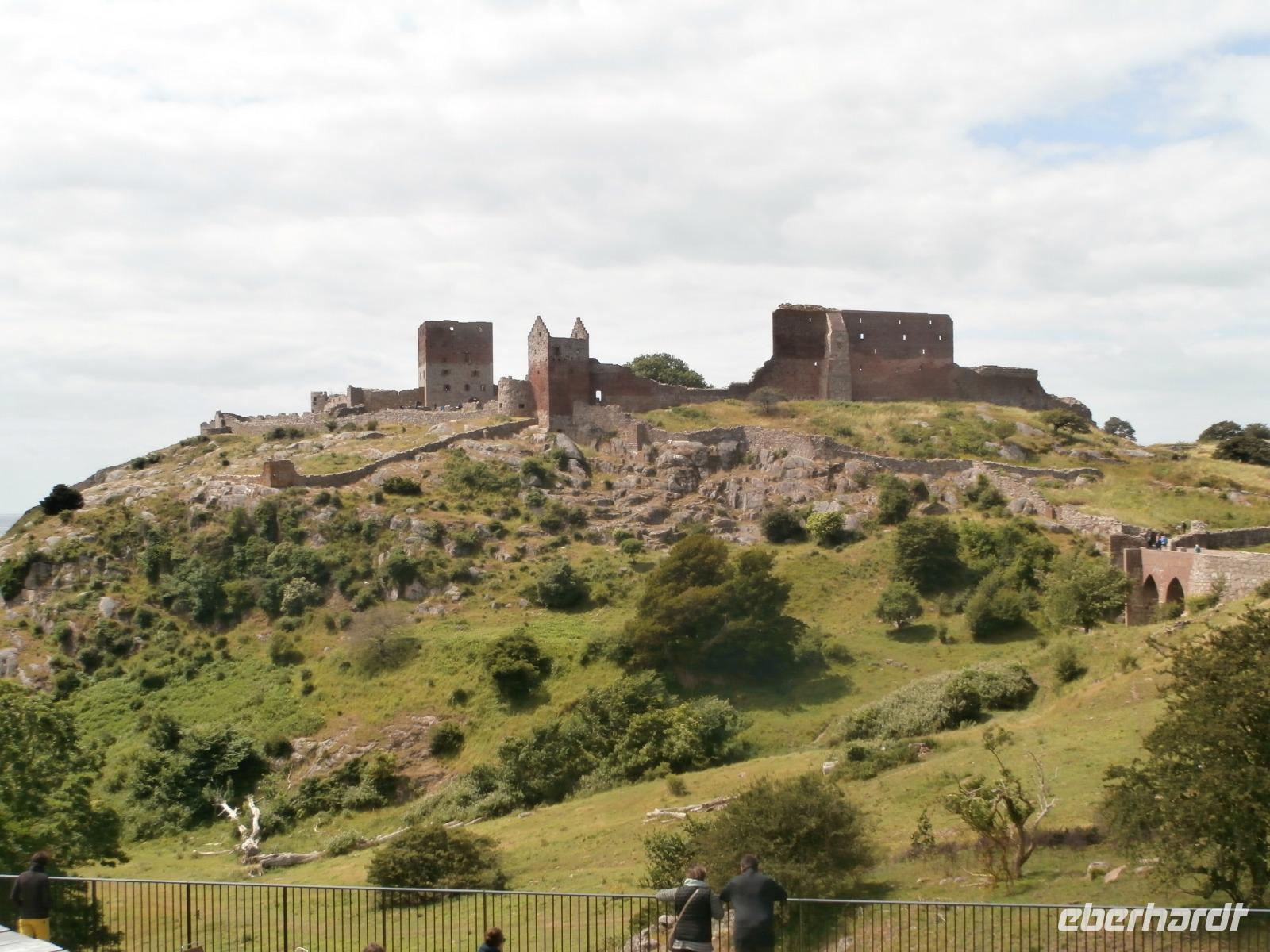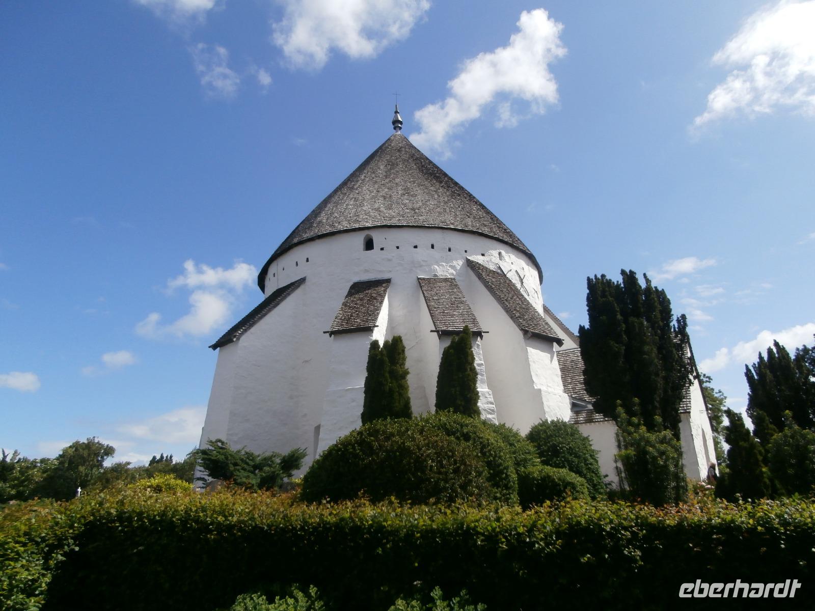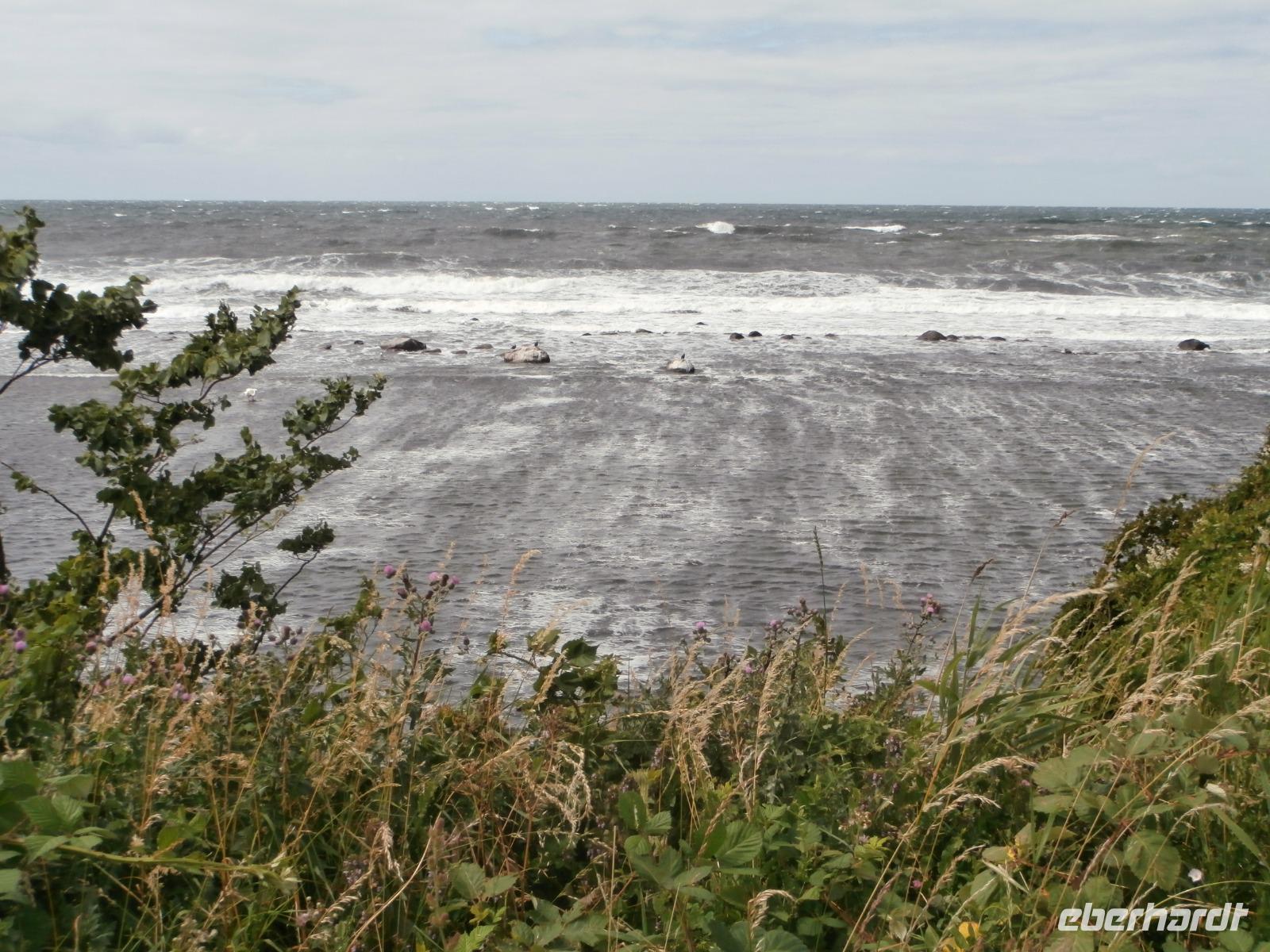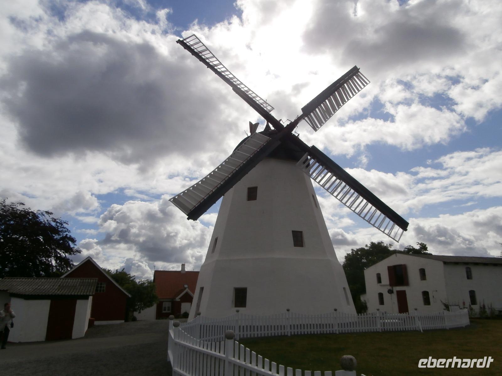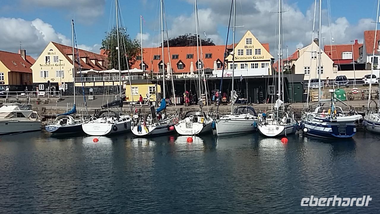 Am Morgen herrschen kühlere Temperaturen und starker Wind bläst uns um die Ohren. Heute starten wir später, ganz entspannt treffen wir uns zur Abfahrt im Bus. In Arsdale betrachten wir uns die fantastische Holländer Mühle, sie strahlt in einem tollen Weiß schon von Weitem. Svaneke, die östlichste Stadt Dänemarks, besuchen wir im Anschluss, schön der Hafen und die Fachwerkhäuser. Die Geschäfte sind offen und in einer Glasbläserei sehen wir wundervolle Stücke aus Glas, shoppen ist angesagt. Die größte Rundkirche Bornholms steht in Österlars und die Besichtigung steht auf unserem Plan. In romanischen Stil von 1150 ist sie dem ST. Laurentius geweiht. Beeindruckend das Alter der Kirche, aus 1150 stammen noch Chor, Schiff und Apsis, später wurde angebaut, wobei man Feldsteine eingesetzt hat. Extrem viel Wind, fast schon stürmig, so erreichen wir zur Mittagszeit Halse, hier gibt es den lecker geräucherten Bornholmer Hering, in der Räucherei wird uns ein gut geräucherter Fisch mit Brot und Ei serviert, etwas ungewöhnlich aber sehr schmackhaft. Im Bus geben wir im Namen von Eberhardt Travel unseren Gästen ein Glas Sekt aus, der Wind macht einen Ausschank außerhalb unmöglich. Die größte Burgruine Skandinaviens, die Festung Hammershus, besichtigen wir am Nachmittag. Ein paar Mutige kämpfen sich gegen den Sturm hinauf zur Festungsanlage, gigantisch dieses Bollwerk auf dem 74 m hohen Felsen. Eine 750 m lange Ringmauer umgibt den äußeren Burghof, sie wurde seit dem 17. Jahrhundert auch als Steinbruch genutzt. Trotz Sturm fahren wir nun hinunter nach Dueodde, dem schönsten Strand nicht nur von Bornholm, nein Europaweit soll er berühmt für seinen feinen, weißen Sand sein. Und auch wir können da nur zustimmen, ein Traum in Weiß, der Sand wird auch zur Bestückung von Sanduhren benutzt. Wir bummeln mit dem Gesicht hart am Wind am Strand entlang. Wunderschön dieser Abschluss hier am südlichsten Punkt der Insel Bornholm.