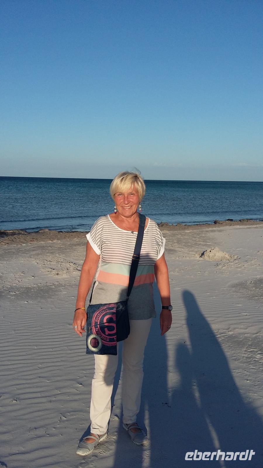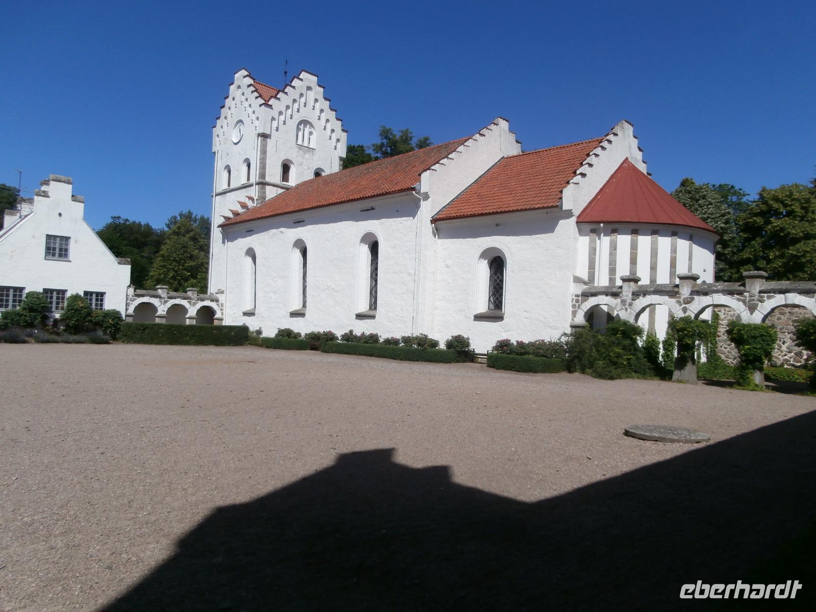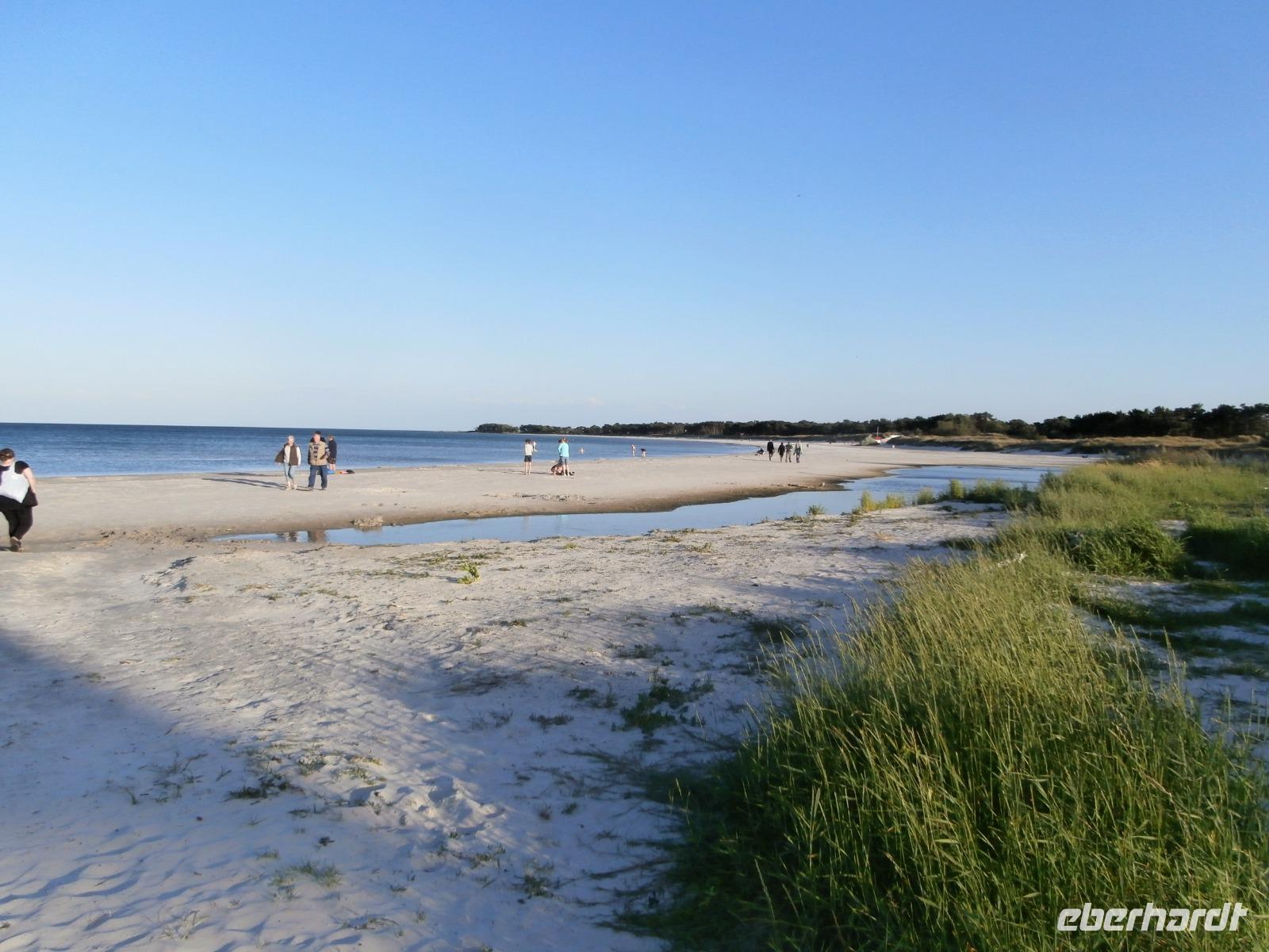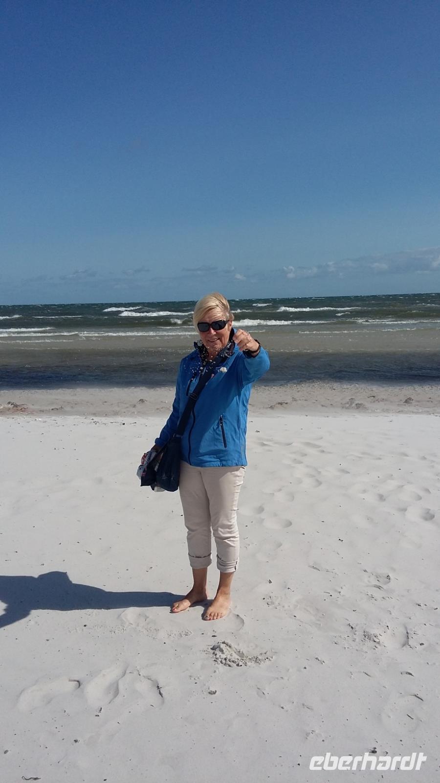 Am Morgen herrschen kühlere Temperaturen und starker Wind bläst uns um die Ohren. Heute starten wir später, ganz entspannt treffen wir uns zur Abfahrt im Bus. In Arsdale betrachten wir uns die fantastische Holländer Mühle, sie strahlt in einem tollen Weiß schon von Weitem. Svaneke, die östlichste Stadt Dänemarks, besuchen wir im Anschluss, schön der Hafen und die Fachwerkhäuser. Die Geschäfte sind offen und in einer Glasbläserei sehen wir wundervolle Stücke aus Glas, shoppen ist angesagt. Die größte Rundkirche Bornholms steht in Österlars und die Besichtigung steht auf unserem Plan. In romanischen Stil von 1150 ist sie dem ST. Laurentius geweiht. Beeindruckend das Alter der Kirche, aus 1150 stammen noch Chor, Schiff und Apsis, später wurde angebaut, wobei man Feldsteine eingesetzt hat. Extrem viel Wind, fast schon stürmig, so erreichen wir zur Mittagszeit Halse, hier gibt es den lecker geräucherten Bornholmer Hering, in der Räucherei wird uns ein gut geräucherter Fisch mit Brot und Ei serviert, etwas ungewöhnlich aber sehr schmackhaft. Im Bus geben wir im Namen von Eberhardt Travel unseren Gästen ein Glas Sekt aus, der Wind macht einen Ausschank außerhalb unmöglich. Die größte Burgruine Skandinaviens, die Festung Hammershus, besichtigen wir am Nachmittag. Ein paar Mutige kämpfen sich gegen den Sturm hinauf zur Festungsanlage, gigantisch dieses Bollwerk auf dem 74 m hohen Felsen. Eine 750 m lange Ringmauer umgibt den äußeren Burghof, sie wurde seit dem 17. Jahrhundert auch als Steinbruch genutzt. Trotz Sturm fahren wir nun hinunter nach Dueodde, dem schönsten Strand nicht nur von Bornholm, nein Europaweit soll er berühmt für seinen feinen, weißen Sand sein. Und auch wir können da nur zustimmen, ein Traum in Weiß, der Sand wird auch zur Bestückung von Sanduhren benutzt. Wir bummeln mit dem Gesicht hart am Wind am Strand entlang. Wunderschön dieser Abschluss hier am südlichsten Punkt der Insel Bornholm.