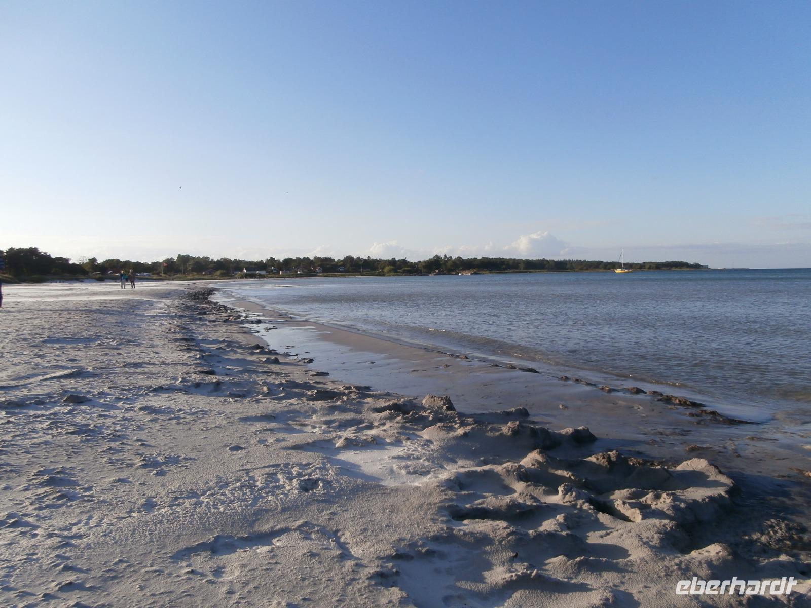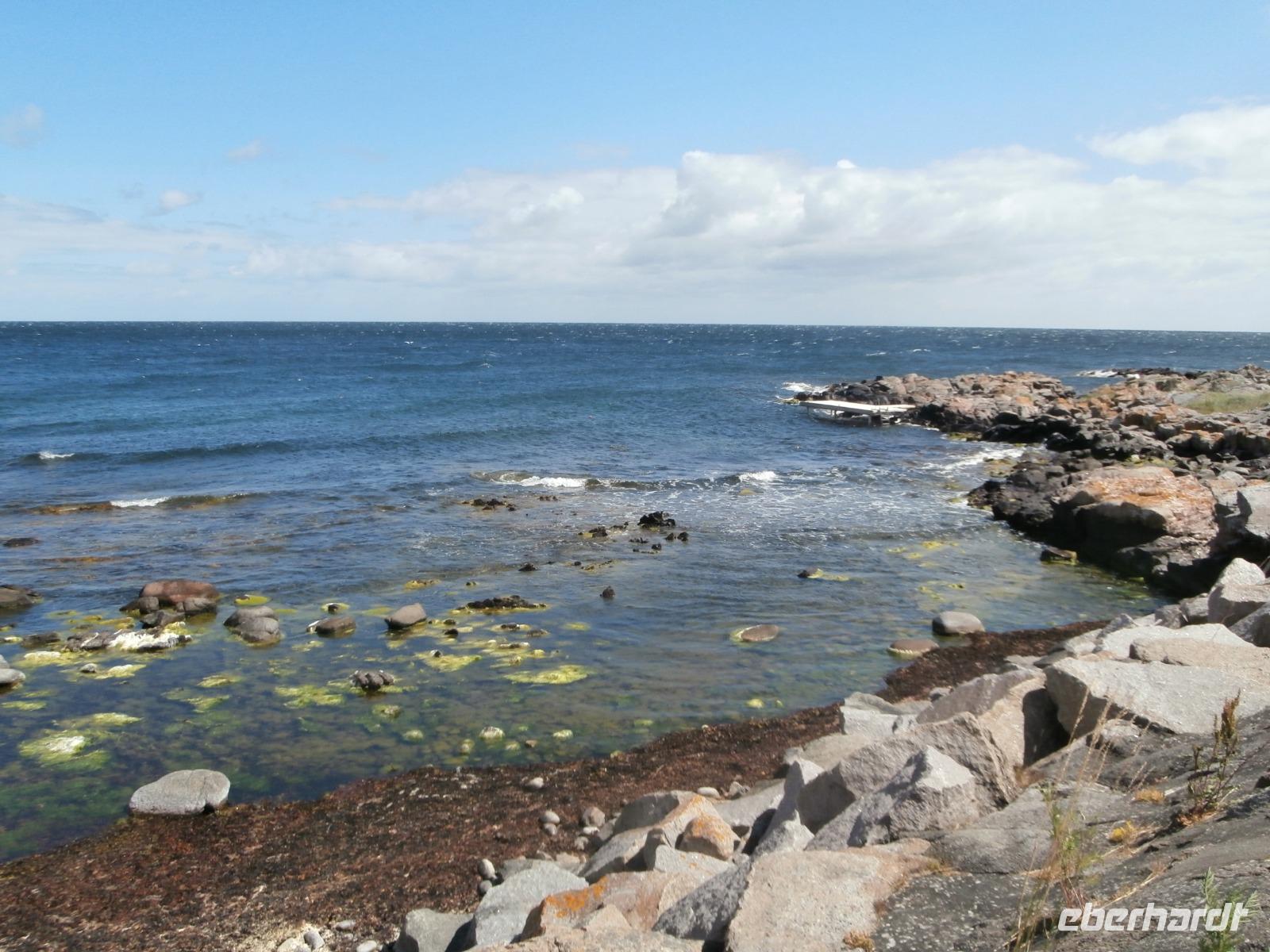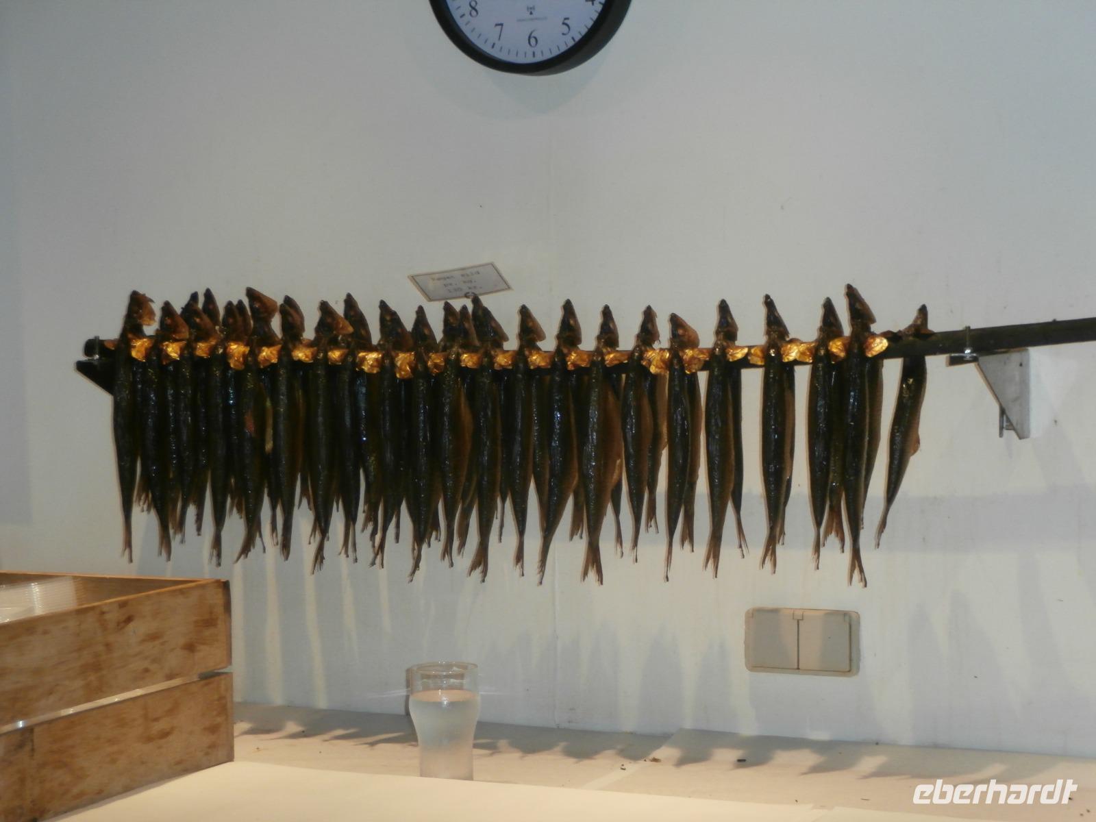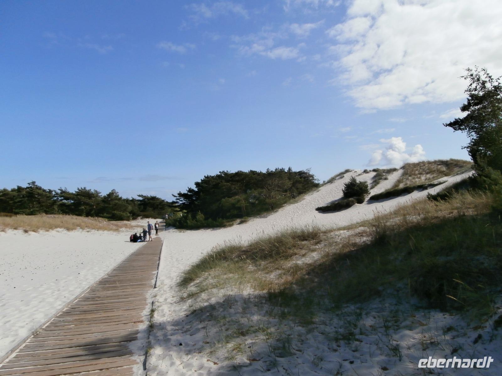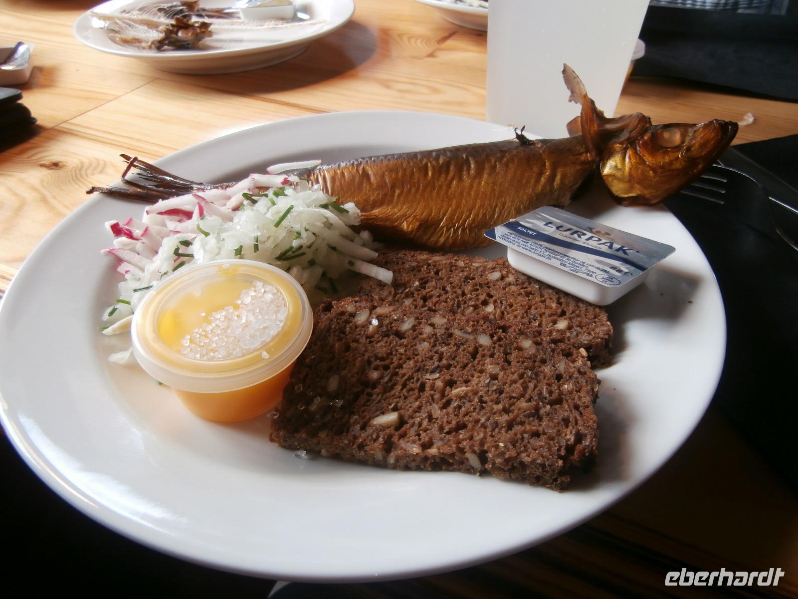 Am Morgen herrschen kühlere Temperaturen und starker Wind bläst uns um die Ohren. Heute starten wir später, ganz entspannt treffen wir uns zur Abfahrt im Bus. In Arsdale betrachten wir uns die fantastische Holländer Mühle, sie strahlt in einem tollen Weiß schon von Weitem. Svaneke, die östlichste Stadt Dänemarks, besuchen wir im Anschluss, schön der Hafen und die Fachwerkhäuser. Die Geschäfte sind offen und in einer Glasbläserei sehen wir wundervolle Stücke aus Glas, shoppen ist angesagt. Die größte Rundkirche Bornholms steht in Österlars und die Besichtigung steht auf unserem Plan. In romanischen Stil von 1150 ist sie dem ST. Laurentius geweiht. Beeindruckend das Alter der Kirche, aus 1150 stammen noch Chor, Schiff und Apsis, später wurde angebaut, wobei man Feldsteine eingesetzt hat. Extrem viel Wind, fast schon stürmig, so erreichen wir zur Mittagszeit Halse, hier gibt es den lecker geräucherten Bornholmer Hering, in der Räucherei wird uns ein gut geräucherter Fisch mit Brot und Ei serviert, etwas ungewöhnlich aber sehr schmackhaft. Im Bus geben wir im Namen von Eberhardt Travel unseren Gästen ein Glas Sekt aus, der Wind macht einen Ausschank außerhalb unmöglich. Die größte Burgruine Skandinaviens, die Festung Hammershus, besichtigen wir am Nachmittag. Ein paar Mutige kämpfen sich gegen den Sturm hinauf zur Festungsanlage, gigantisch dieses Bollwerk auf dem 74 m hohen Felsen. Eine 750 m lange Ringmauer umgibt den äußeren Burghof, sie wurde seit dem 17. Jahrhundert auch als Steinbruch genutzt. Trotz Sturm fahren wir nun hinunter nach Dueodde, dem schönsten Strand nicht nur von Bornholm, nein Europaweit soll er berühmt für seinen feinen, weißen Sand sein. Und auch wir können da nur zustimmen, ein Traum in Weiß, der Sand wird auch zur Bestückung von Sanduhren benutzt. Wir bummeln mit dem Gesicht hart am Wind am Strand entlang. Wunderschön dieser Abschluss hier am südlichsten Punkt der Insel Bornholm.