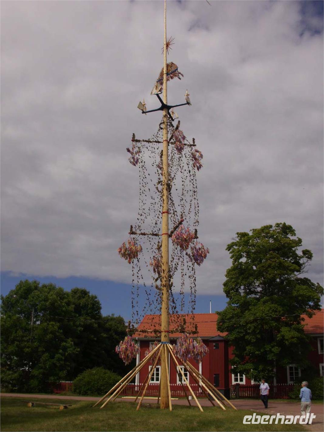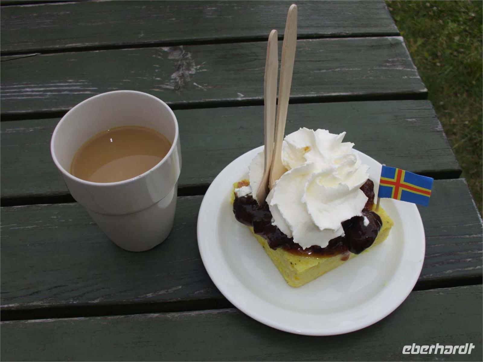 Kalsgarden. Hier wird uns das karge Leben in einem Bauerngehöft aus dem frühen 19. Jh. eindrücklich vor Augen geführt. Smörebröd, durch das Loch in der Mitte auf Stangen aufgehängt, ist mäusesicher unter der Stubendecke untergebracht. Weiter reisen wir nach Eckerö mit der Besichtigung des Mittsommerbaumes in Storby. Diese, unseren Maibäumen nahestehenden geschmückten Stämme sind fest im nordischen Brauchtum verankert und gegen auf uralte Traditionen zurück. Letzte Station ist das alte Posthaus aus der Zarenzeit mit einem Besuch des Museums und Möglichkeit zum Kauf selbstgemachter Pralinen im Restaurant. Als Überraschung für die Gäste organisiere ich ein Kaffeetrinken mit einer regionalen Spezialität, dem Aland Pfannkuchen. Mit Schlagsahne und Pflaumen ist dieser fast so mächtig wie eine Hauptmahlzeit. Noch besser schmeckt er bei strahlendem Sonnenschein unter freiem Himmel. Wir verabschieden uns nun von Beatrice, die uns ihre Heimat auf ganz wunderbare Weise so liebenswert nahe gebracht hat.
