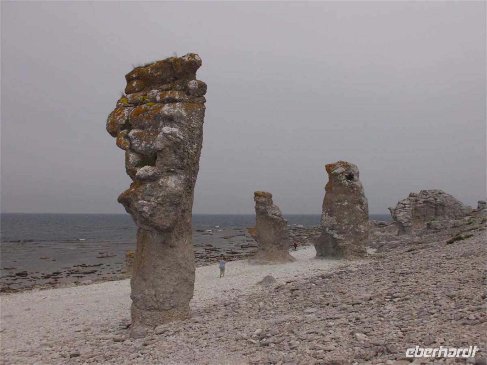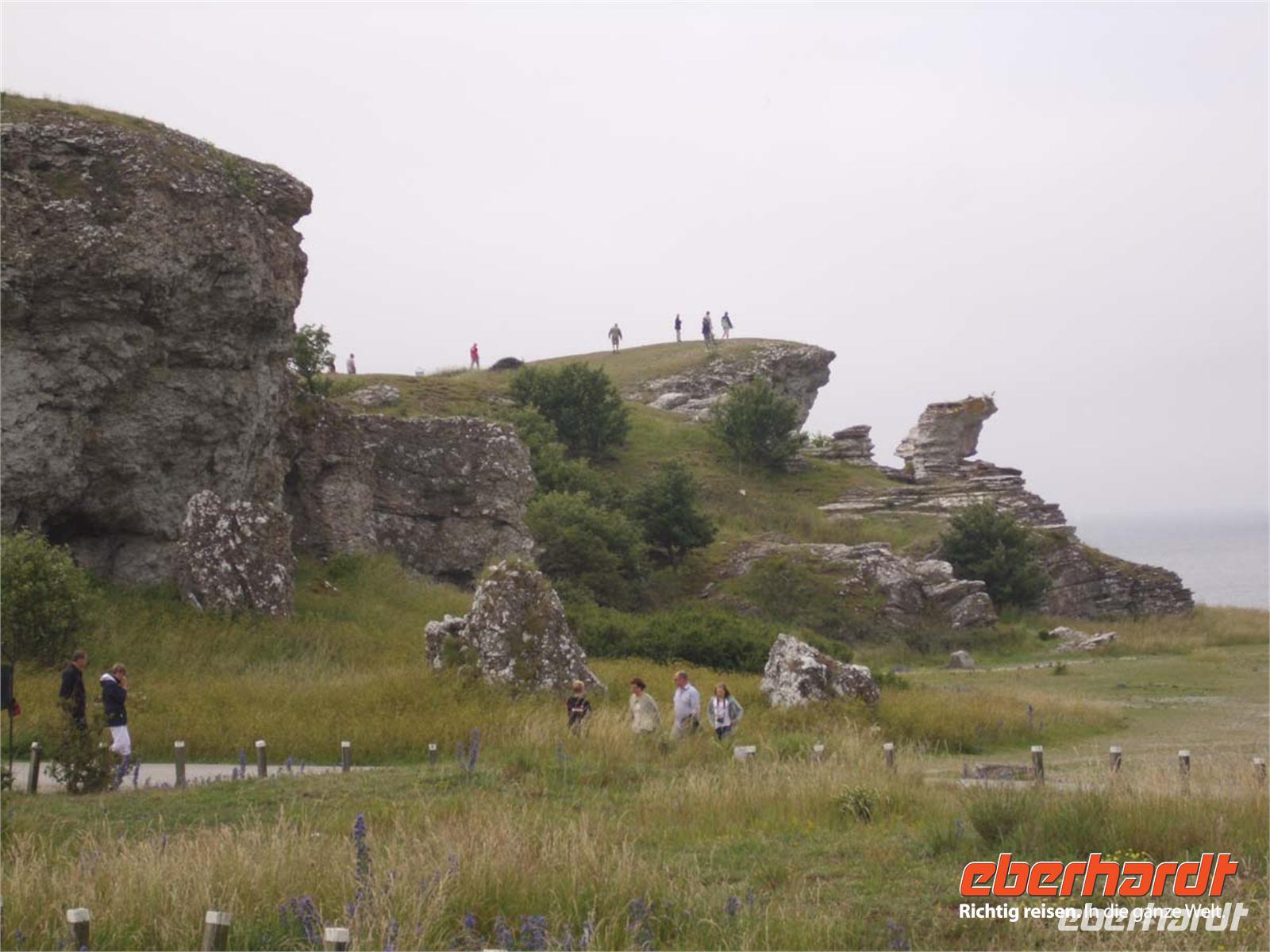 8. Tag, 05. 05. 12: Gotland Nordteil Nach dem Frühstück beginnt unsere Landpartie ins nördliche Gotland. Zunächst bestaunen wir die Steilküste bei Vibble. Bis zu 48m tief stürzt hier der Kalkfelsen Gotlands in Meer. Danach steht die Besichtigung der Dorfkirche von Bro auf dem Programm, die innen sehr schön ausgemalt ist. Nur ein Beispiel für die 95 Kirchen der Insel. und danach eine Überfahrt mit der kostenlosen Fähre auf die Insel Faro. Hier liegt die Besichtigung der Kirche von Faro an, auf deren Friedhof der legendäre Regisseur Ingmar Bergmann begraben liegt. Danach bestaunen wir die für Gotland so typischen Rauksteine in Langhammar und Digerhuuvd. Überbleibsel von Korallenriffen aus dem Erdmittelalter. Hier legen wir auch unsere Mittagspause am Meer ein. Nun reisen wir ins Naturschutzgebiet Ullahau, wo uns eine eigentümliche Landschaft aus Sanddünen, mit Flechten und Kiefern bewachsen umfängt. Nachdem wir mit der Fähre wieder von Farö auf die große Insel übergesetzt sind, werfen wir einen Blick in das riesige Loch, welches der Kalksteinabbau für die Zementfabrik in Slite hinterlassen hat. Die Rauksteine in Lergrav und ein Besuch der Ruine des Romaklosters mitten auf der Insel runden unsere Tour durch Nordgotland ab. Das Zisterzienserkloster wird als Ruine heute als Theaterbühne für Shakespearstücke genutzt. Mit reichlich Lammfleisch und einem Safranpfannkuchen zum Abendbuffet beschließen wir den Tag mit zwei gotländischen Spezialitäten in der ländlicher Idylle unseres Hotels.