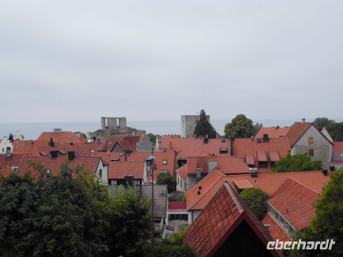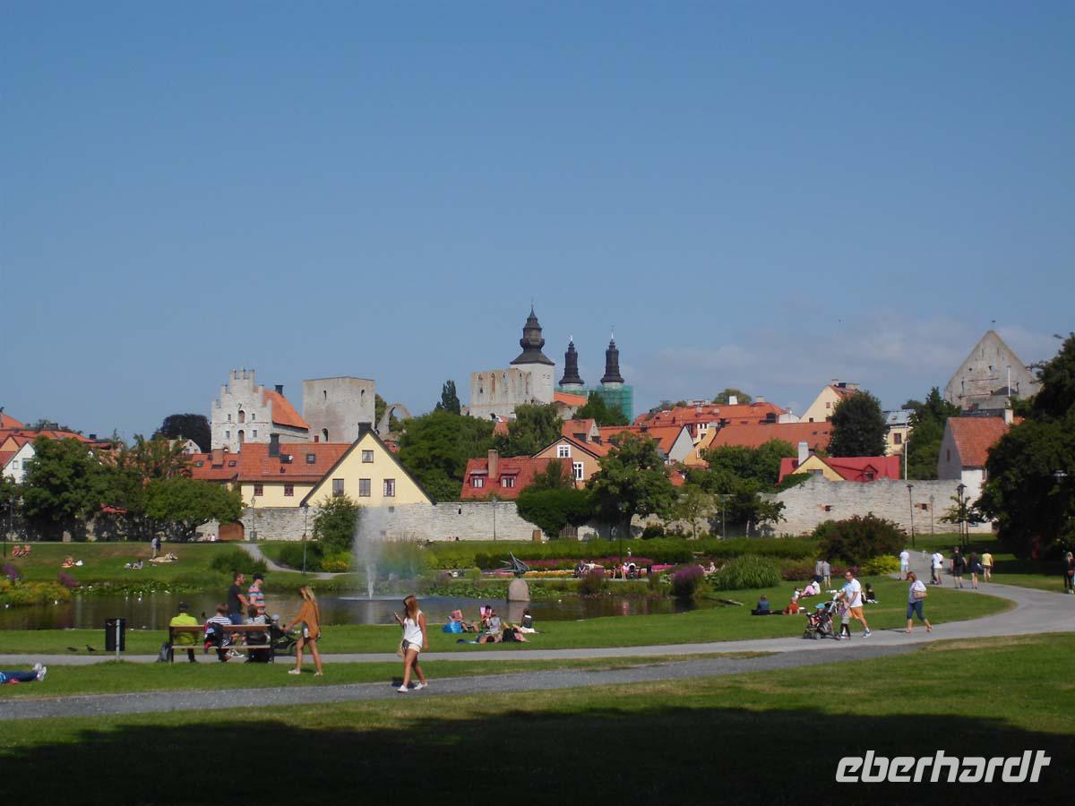 Heute wollen wir nach Gotland übersetzen. Dazu müssen wir sehr früh aufstehen um gegen 6.00 Uhr an der Fähre in Nynäshamn zu sein. Punkt 7.00 Uhr legt die Fähre pünktlich in Nynäshamn ab. An Bord gibt es mehrere Restaurants, ein Sonnendeck und Bars. Zudem ist für jeden Fahrgast ein Sitzplatz vorgesehen, der sehr bequem ist. Die drei Stunden Fahrt vergehen also recht schnell, obwohl sie die meiste Zeit über offenes Meer führen. Am Vormittag erreichen wir die alte Hansestadt Visby. Unser Gästeführer steht schon bereit und so betreten wir die Stadt durch die 3,5 km lange und bestens erhaltene Stadtmauer und lassen uns sofort durch die engen Gassen der Hauptstadt Gotlands führen. Im Stadtmuseum ist die wechselvolle Geschichte der mittelalterlichen Großstadt bestens dargestellt. Beeindruckend sind nicht nur die kiloschweren Hacksilberfunde aus der Wickingerzeit, sondern auch die z. T. weltberühmten Bildsteine, eine für Gotland typische Varietät der Runensteine. Natürlich wird auch der Dom als einzige noch erhaltene Kirche der Stadt und der botanischen Garten besucht. Die Stadt der Rosen und Ruinen wird Visby auch genannt, weil von den 17 riesigen Kirchen in den Mauern 16 Ruinen sind, und weil es an allen Hauswänden und Zäunen herrlich nach blühenden Rosen duftet.