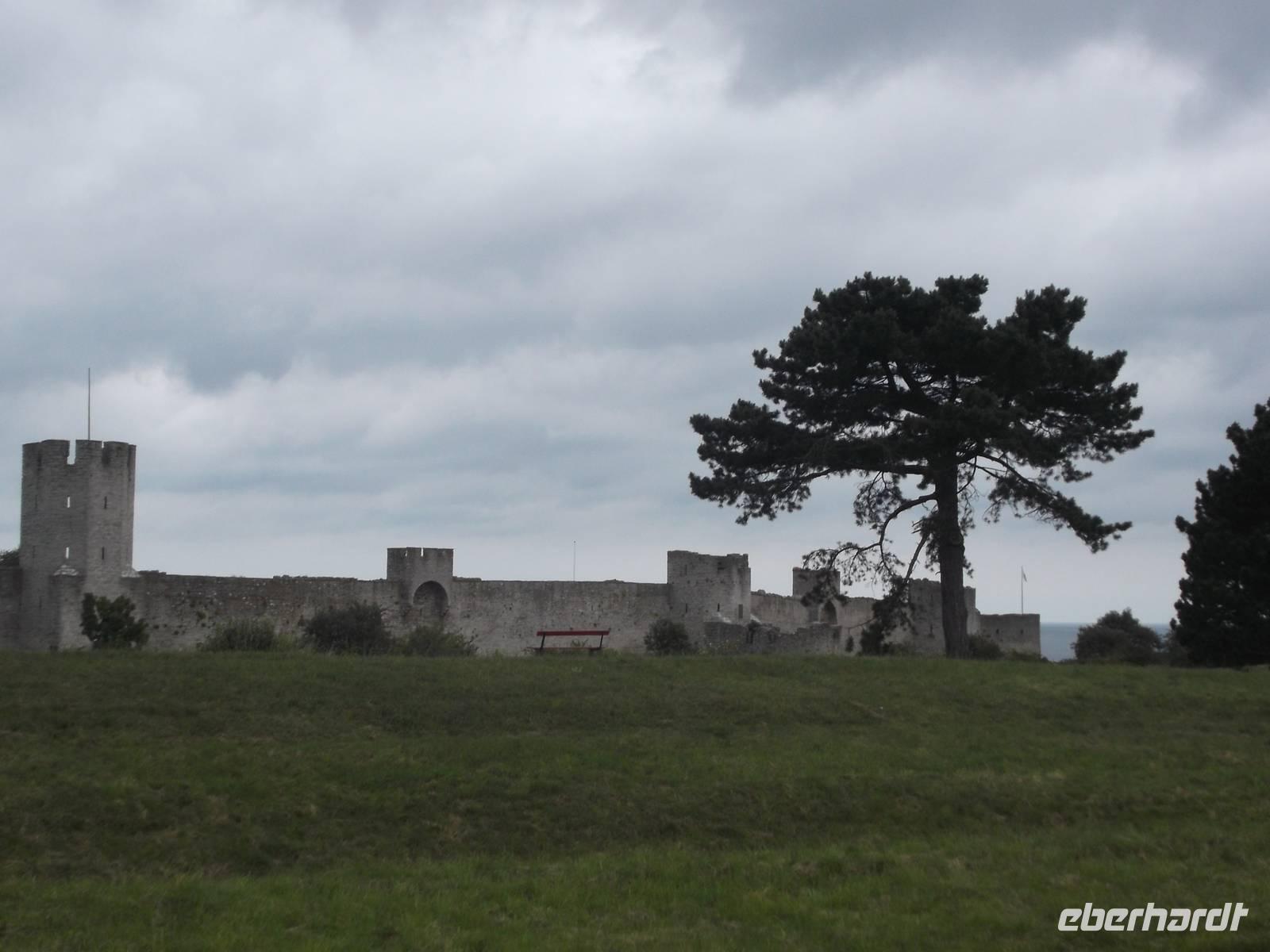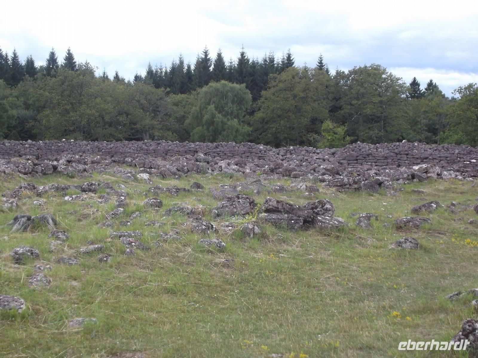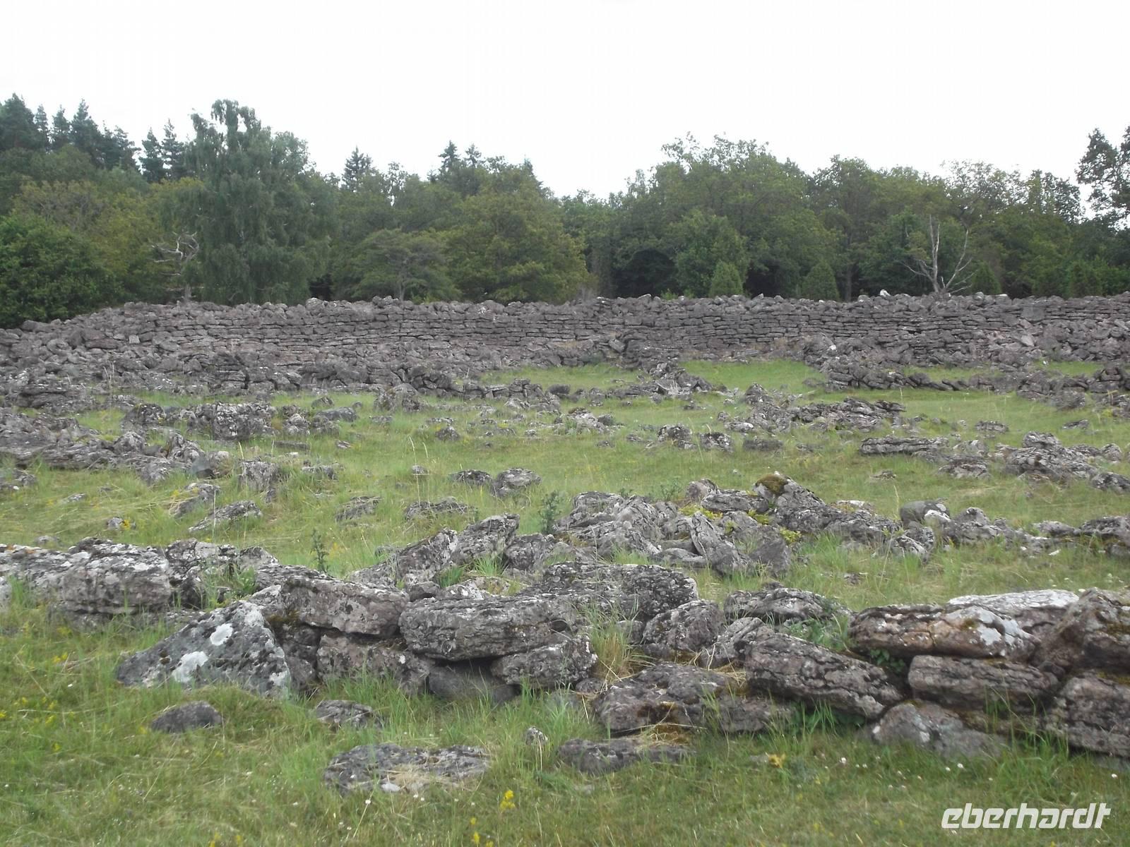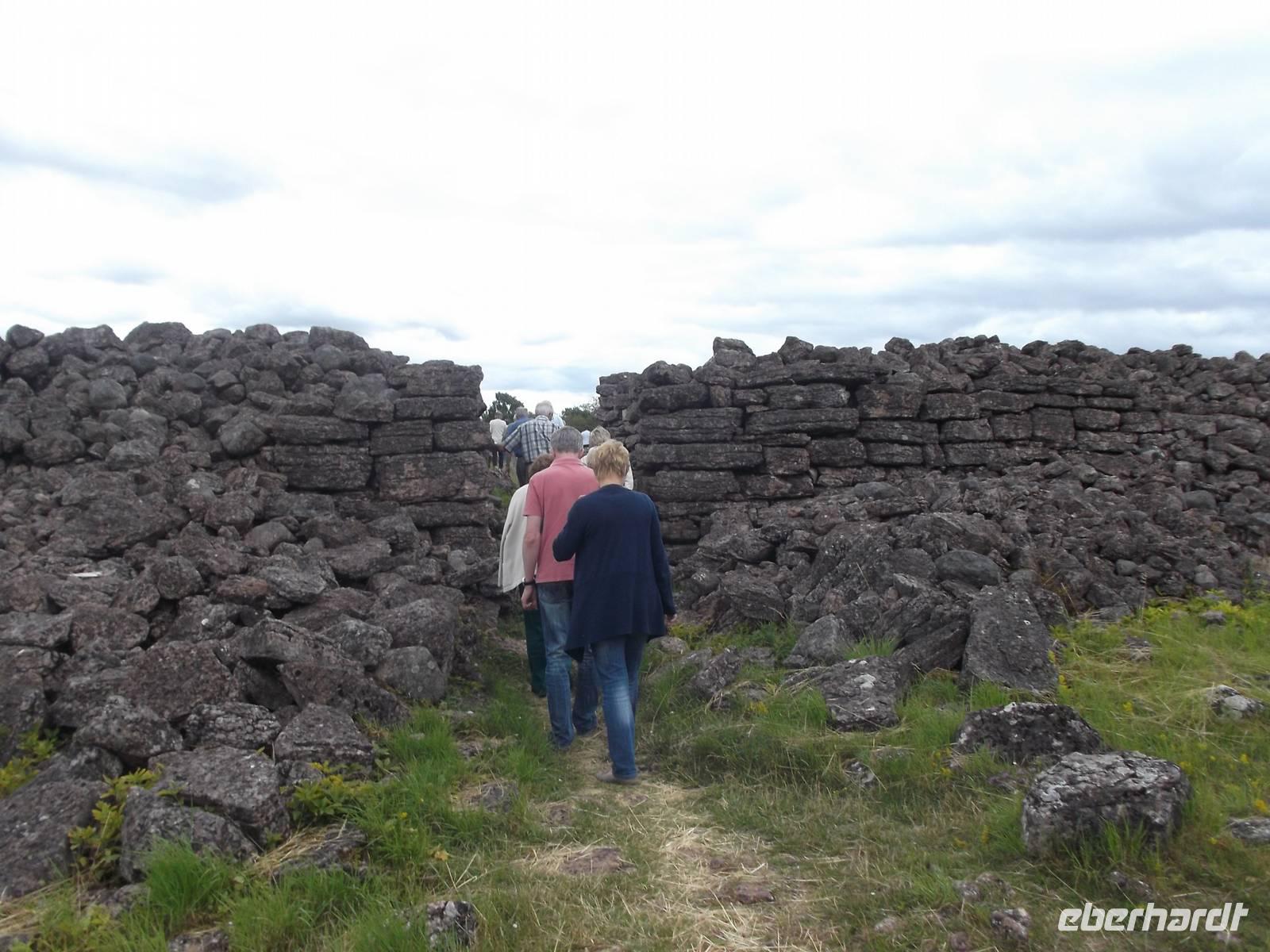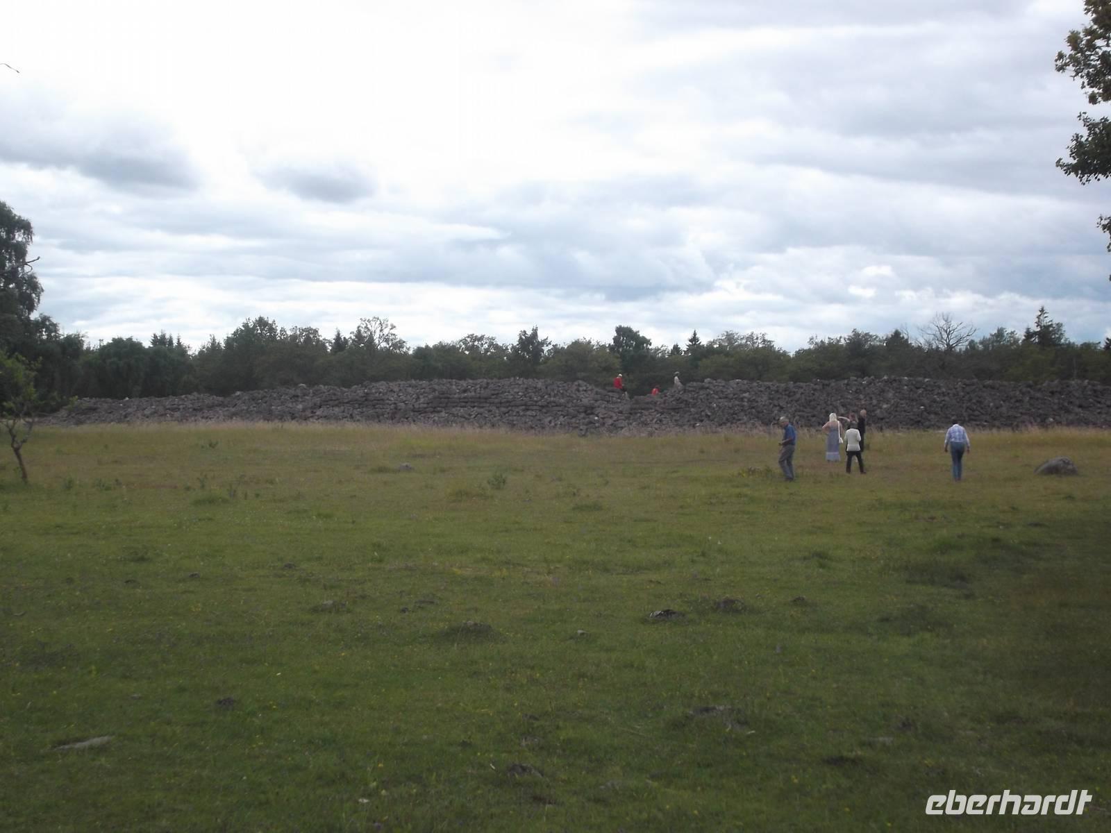 Nach einer Mittagspause im kleinen Yachthafen von Stora Rör sahen wir uns schon das nächste Vorzeitdenkmal an - mitten im Wald liegt die einstige Fluchtburg Ismanstorp. Nach ein paar Minuten Fußweg vom Parkplatz aus hatten wir den sehr imponierenden Steinwall erreicht, der mehr als hundert Meter im Durchmesser betragt, immer drei, vier Meter hoch aufragt - komplett aus flachen rötlichen Kalksteinen geschichtet - und immer noch die Grundmauern von einst 88 Häusern und Speichern beherbergt. Ein äußerst eindrucksvolles Denkmal, von dessen Art es 16 auf Öland gegen soll.