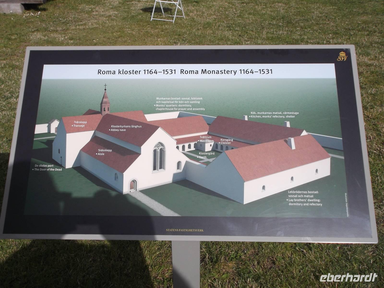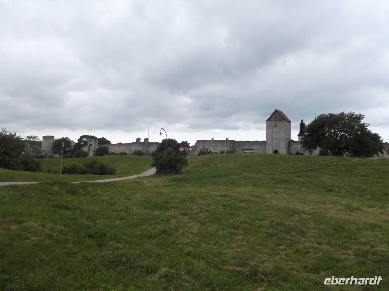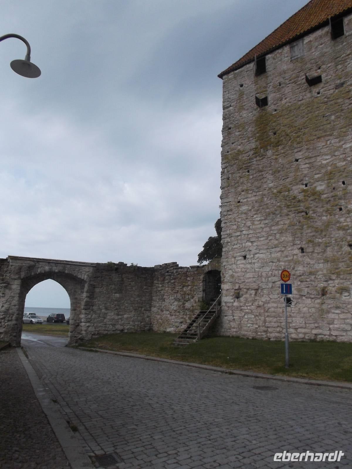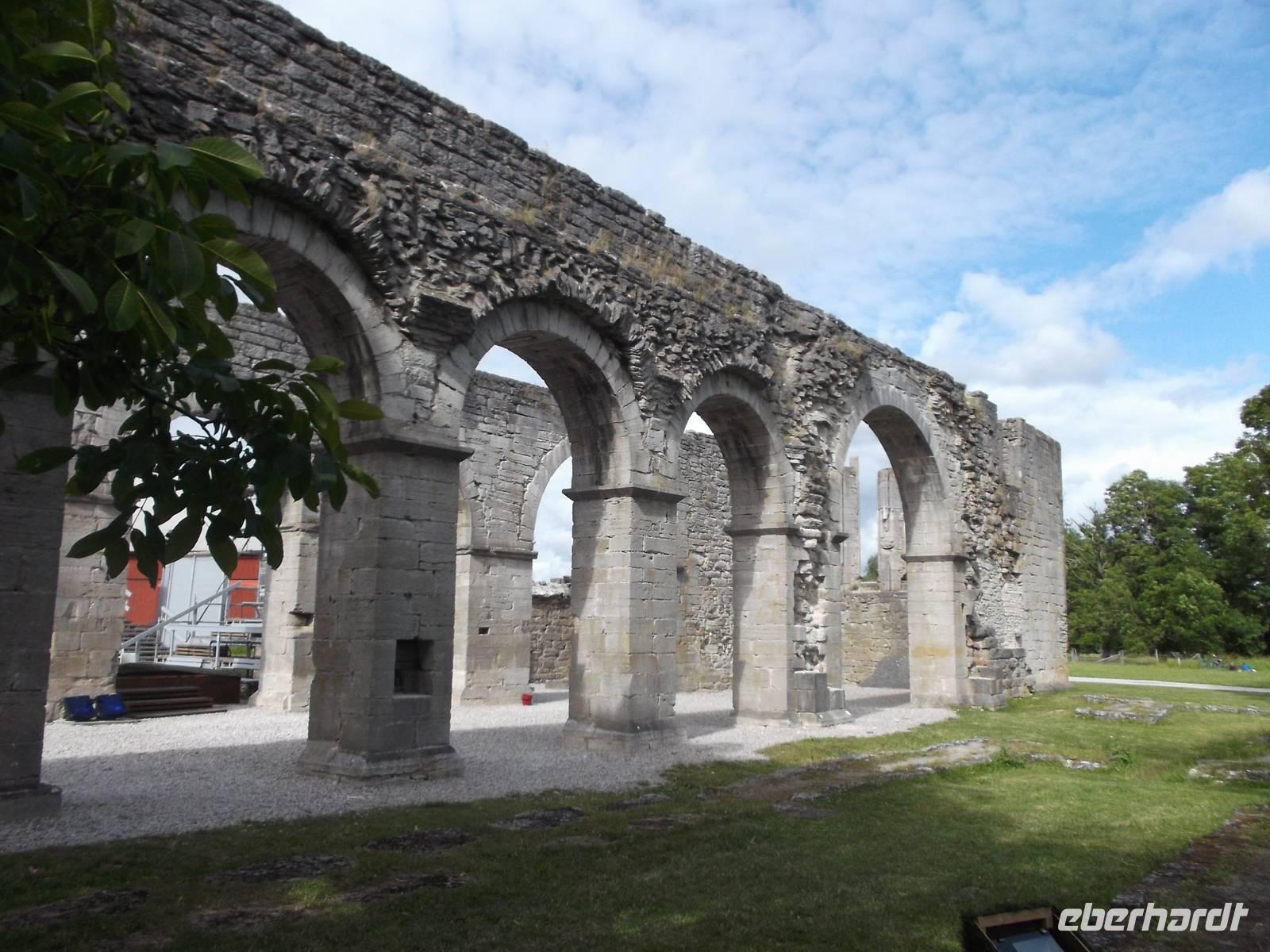 Auf dem Weg zurück hielten wir an einer der interessantesten historischen Kirchen von Gotland. Angeblich soll es 92 auf der großen Insel geben und sehr interessant sind wohl die meisten von ihnen. Die Kirche von Bunge aus dem 14. Jh. zeigt noch die alte Tradition der Wehrkirchen - ohne Fenster an der als für Böses besonders anfällig geglaubten Nordseite - und im Inneren wundervolle Wandmalereien aus der Erbauer-Zeit. Nicht allzuweit von hier konnten wir an einem Aussichtspunkt über die Bogevik-Buch und zur Halbinsel Asunden den Anblick der wie Schären vorgelagerten Inselchen genießen oder unsere Aufmerksamkeit einem Lotsenhäuschen oder der davor stehenden steinernen Windmühle widmen. In Sichtweite lag auch das Städtchen Slite, bekannt für seine Kalkbrüche und das größte Zementwerk Schwedens. Unweit von der imponierenden Fabrikanlage konnten wir einen Blick in einen der gewaltigen Steinbrüche werfen, aus denen das Material für die bedeutende Zementproduktion stammt. Überhaupt liegt die Insel Gotland - mit ihren gut 3000 km² zweitgrößte Insel in der Ostsee - wie ein gewaltiger Kalksteinblock weit vor der Küste des ansonsten aus härteren Gesteinen wie Granit bestehenden Schweden. Aus dem haltbaren und dennoch gut zu bearbeiten Gestein sind denn auch die meisten Bauwerke hier - insbesondere die schönen, großen weißgetünchten Kirchen. Eine der größten ist die von Gothem - die auch mit schönen alten Wandmalereien und einem hübschen, sehr alten bemalten Chorgestühl aufwarten kann. Nachdem wir sie besichtigt hatten, gönnten wir uns vor der Rückkehr nach Visby noch einen Abstecher ins Romakloster. Von diesem 1164 gegründeten und später in der Zeit der Reformation zerstörten Zisterzienserkloster sind nur Reste des Kirchen-Langhauses erhalten. Die sind aber nicht nur imposant, sondern strahlen auch ein durchaus noch mittelalterliches Ambiente aus - was man dazu nutzt, um hier im Sommer zusammen mit der umgebenden Natur als herrliche Kulisse für Theaterfestspiele zu dienen. In der Zeit nach Beginn der schwedischen Herrschaft über Gotland nutzte man die Ruine als Steinbruch und verbaute die so gewonnenen Steine im danebenliegenden „Königshof", dem zeitweiligen Amtssitz des schwedischen Statthalters.