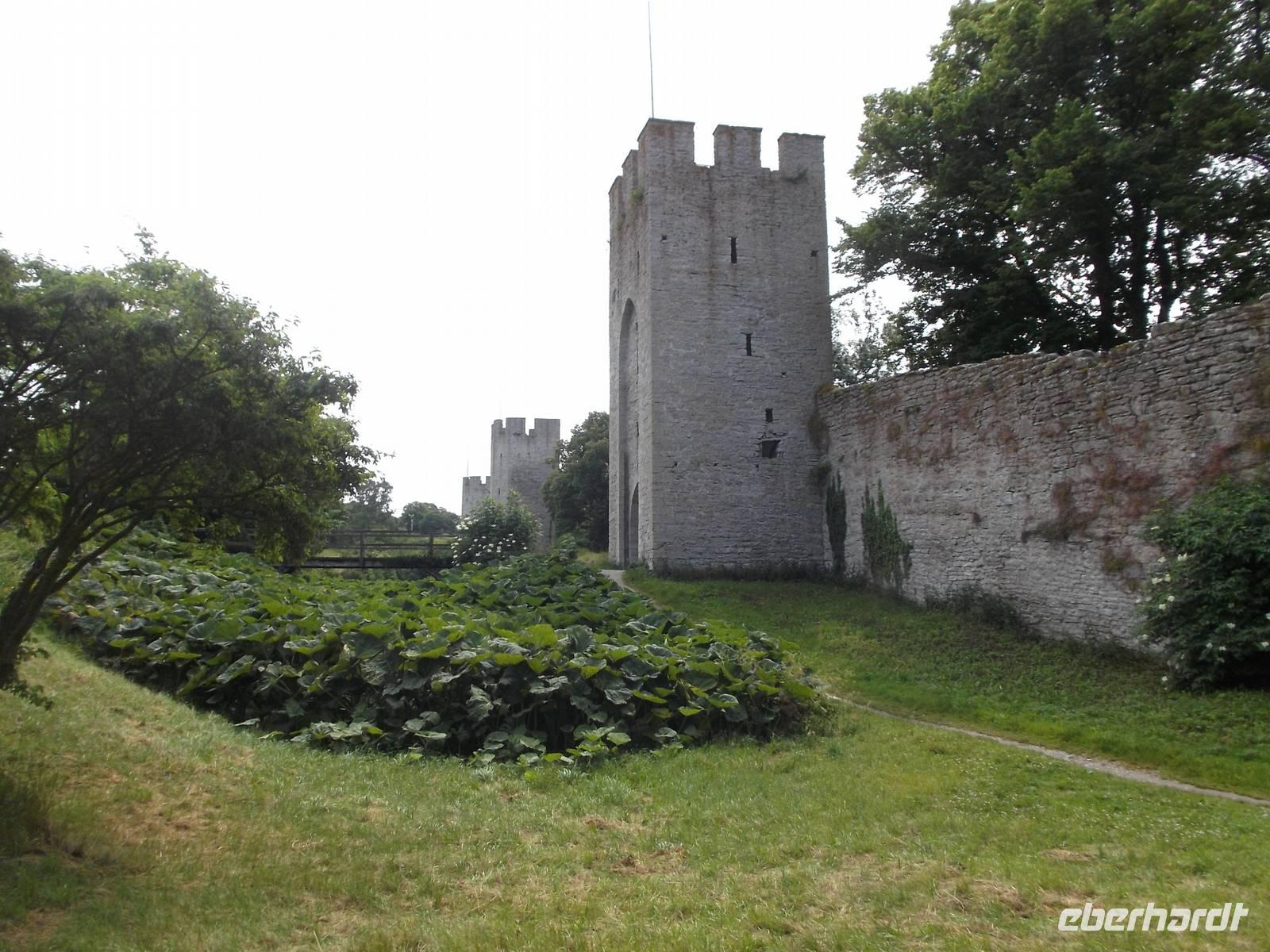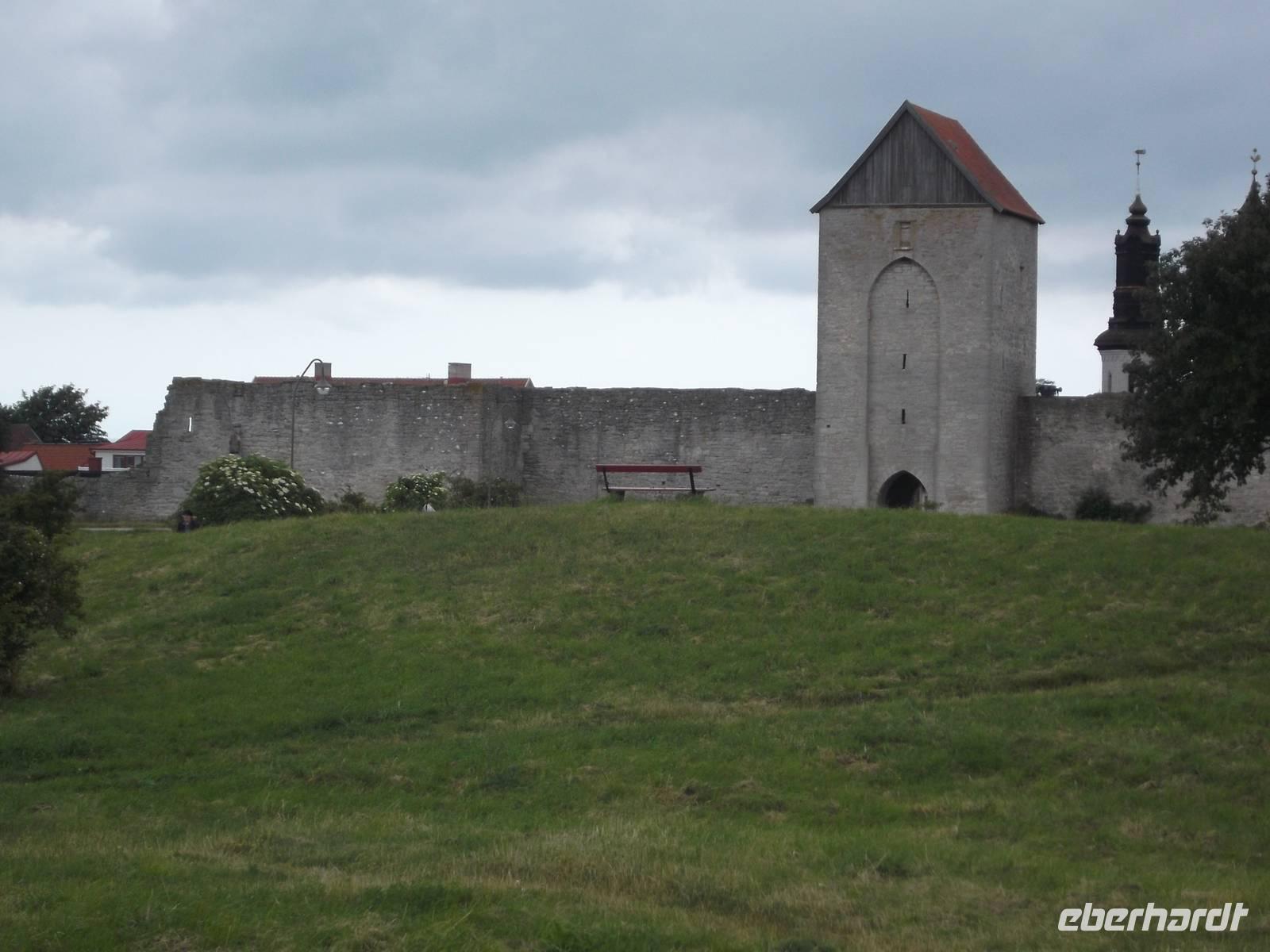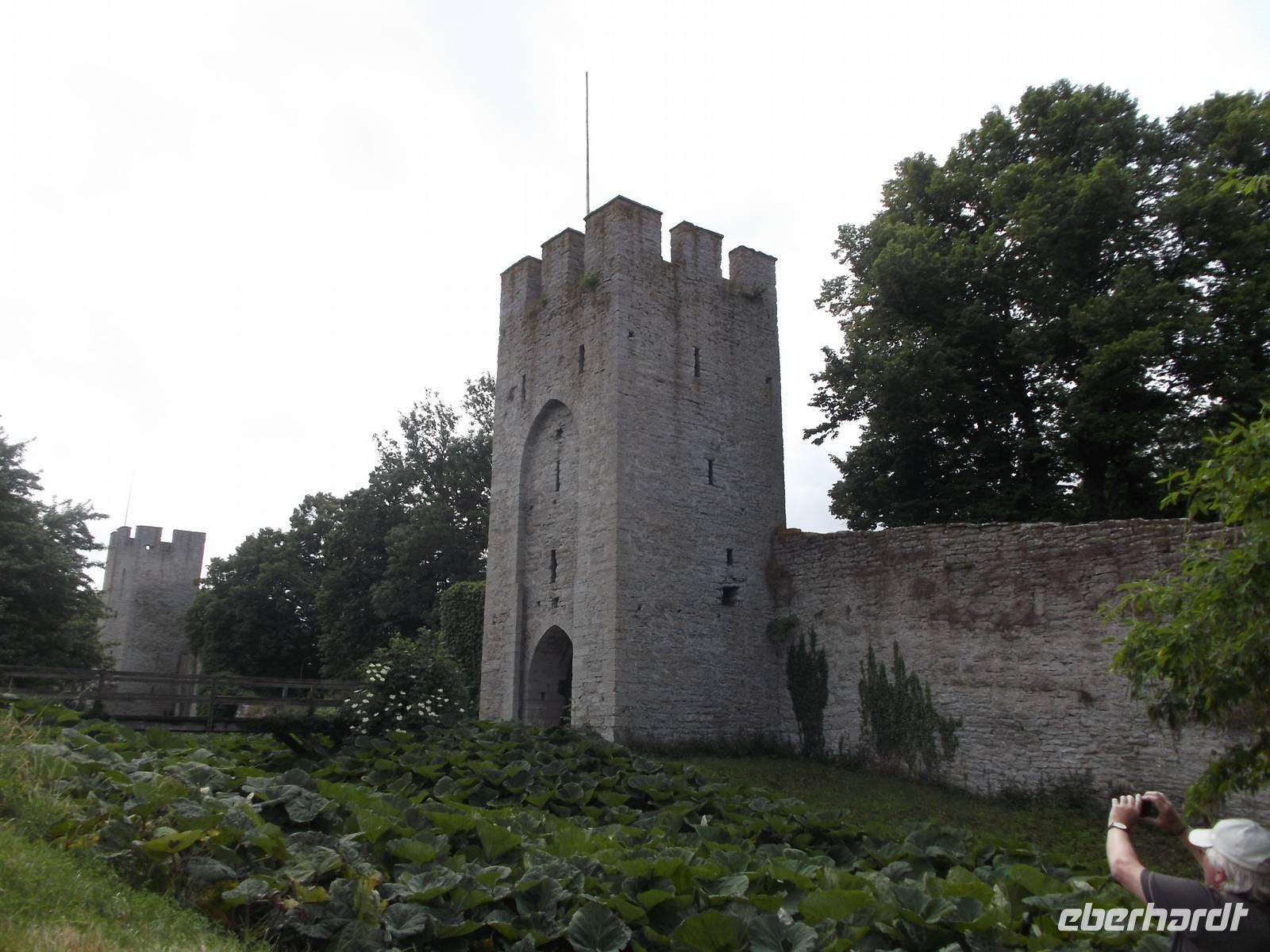 Auf dem Weg zurück hielten wir an einer der interessantesten historischen Kirchen von Gotland. Angeblich soll es 92 auf der großen Insel geben und sehr interessant sind wohl die meisten von ihnen. Die Kirche von Bunge aus dem 14. Jh. zeigt noch die alte Tradition der Wehrkirchen - ohne Fenster an der als für Böses besonders anfällig geglaubten Nordseite - und im Inneren wundervolle Wandmalereien aus der Erbauer-Zeit. Nicht allzuweit von hier konnten wir an einem Aussichtspunkt über die Bogevik-Buch und zur Halbinsel Asunden den Anblick der wie Schären vorgelagerten Inselchen genießen oder unsere Aufmerksamkeit einem Lotsenhäuschen oder der davor stehenden steinernen Windmühle widmen. In Sichtweite lag auch das Städtchen Slite, bekannt für seine Kalkbrüche und das größte Zementwerk Schwedens. Unweit von der imponierenden Fabrikanlage konnten wir einen Blick in einen der gewaltigen Steinbrüche werfen, aus denen das Material für die bedeutende Zementproduktion stammt. Überhaupt liegt die Insel Gotland - mit ihren gut 3000 km² zweitgrößte Insel in der Ostsee - wie ein gewaltiger Kalksteinblock weit vor der Küste des ansonsten aus härteren Gesteinen wie Granit bestehenden Schweden. Aus dem haltbaren und dennoch gut zu bearbeiten Gestein sind denn auch die meisten Bauwerke hier - insbesondere die schönen, großen weißgetünchten Kirchen. Eine der größten ist die von Gothem - die auch mit schönen alten Wandmalereien und einem hübschen, sehr alten bemalten Chorgestühl aufwarten kann. Nachdem wir sie besichtigt hatten, gönnten wir uns vor der Rückkehr nach Visby noch einen Abstecher ins Romakloster. Von diesem 1164 gegründeten und später in der Zeit der Reformation zerstörten Zisterzienserkloster sind nur Reste des Kirchen-Langhauses erhalten. Die sind aber nicht nur imposant, sondern strahlen auch ein durchaus noch mittelalterliches Ambiente aus - was man dazu nutzt, um hier im Sommer zusammen mit der umgebenden Natur als herrliche Kulisse für Theaterfestspiele zu dienen. In der Zeit nach Beginn der schwedischen Herrschaft über Gotland nutzte man die Ruine als Steinbruch und verbaute die so gewonnenen Steine im danebenliegenden „Königshof", dem zeitweiligen Amtssitz des schwedischen Statthalters.